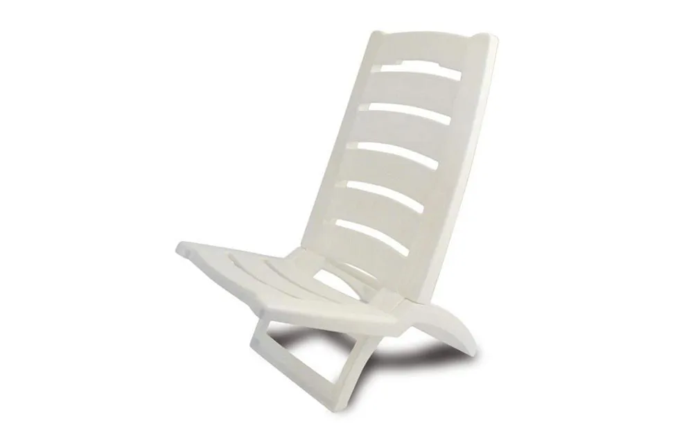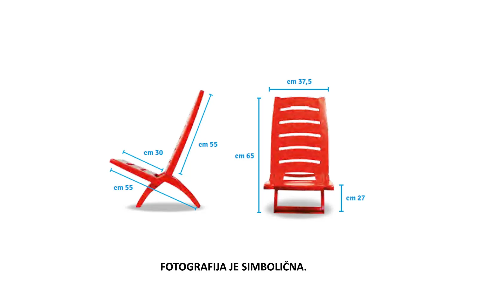 Korisna složiva bijela PVC stolica nosivosti do 100 kg za sjedenje na toplom suncu ili u ugodnoj hladovini kad je sunce prevruće. Dimenzije sklopljene stolice: dužina: 37,5, visina: 65 cm, dubina: 55 cm i visina od poda: 27 cm. Proizvedeno u Italiji.