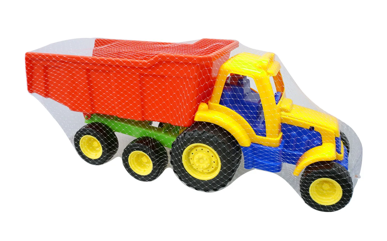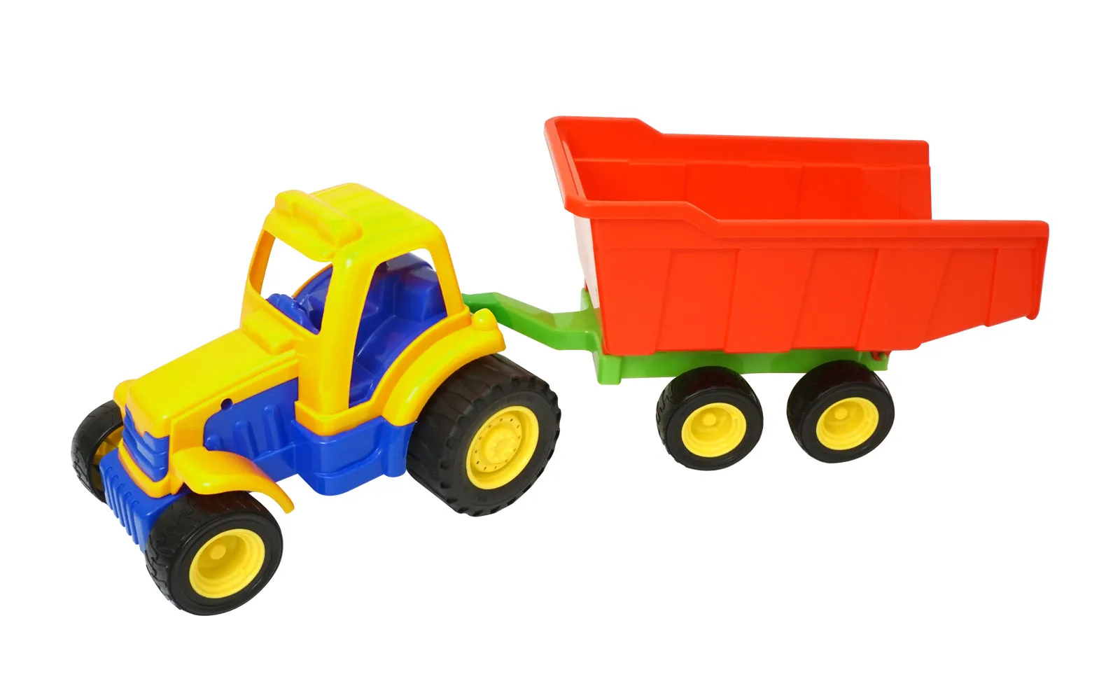 Šareni traktor s prikolicom dugom 75 cm za igru i zabavu znatiželjne djece. Preporučujemo djeci od 18. mjeseca starosti nadalje.