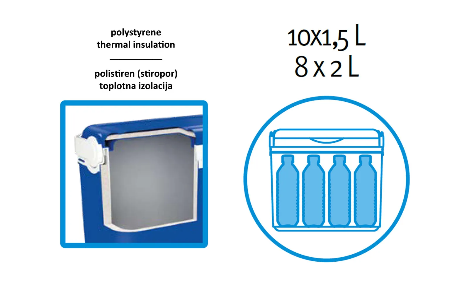 Krenite na bezbrižnu šetnju i pritom ne budite gladni. Za to će se pobrinuti hladnjak Adriatic tirkizno- zelene boje kapaciteta 36 litara, dimenzija 45 x 42 x 29 cm, izrađen od polistirena, s kvalitetnom toplinskom izolacijom i posljedično manjim gubitkom topline ili hlađenja. U hladnjak možete staviti 10 boca po 1,5 L ili 8 boca po 2 litre. Catas tested.