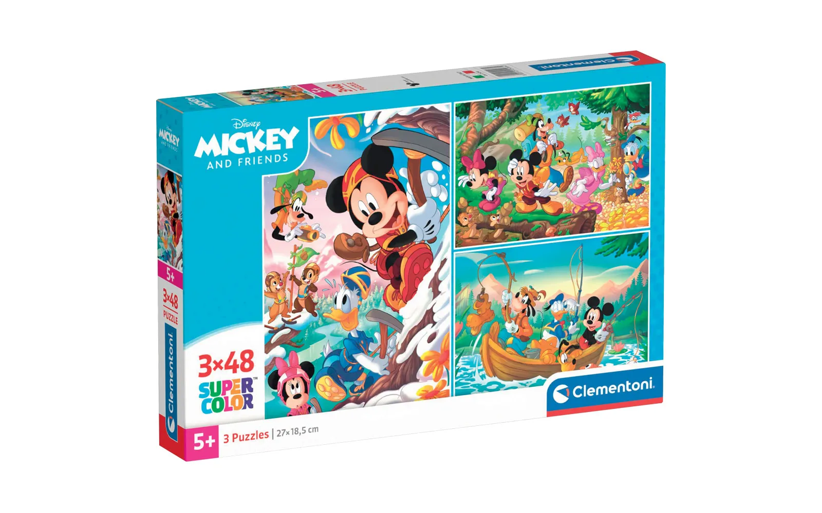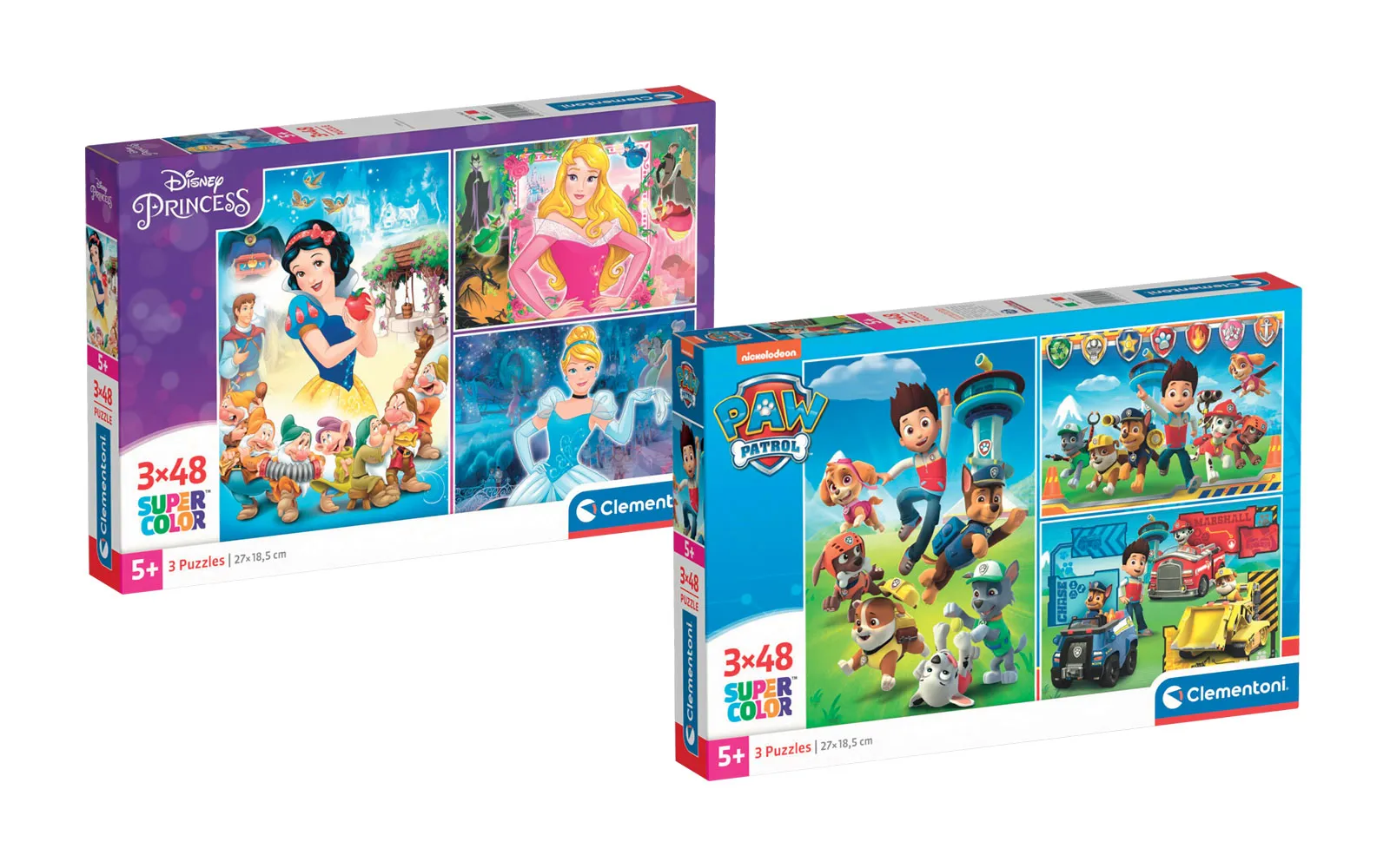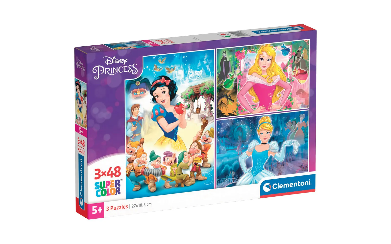 Tri slagalice popularnih crtanih likova sa po 48 dijelova u jednom pakiranju. Slagalice Supercolor Clementoni prate dijete kroz sve faze razvoja i pomažu mu u razvijanju motoričkih vještina i sposobnosti promatranja. Kvaliteta materijala i posebna tehnika tiskanja jamče uvijek lijepe, živahne i jasne boje. Preporučuje se djeci od 5. godine starosti nadalje.