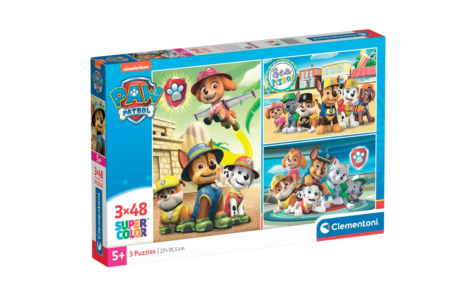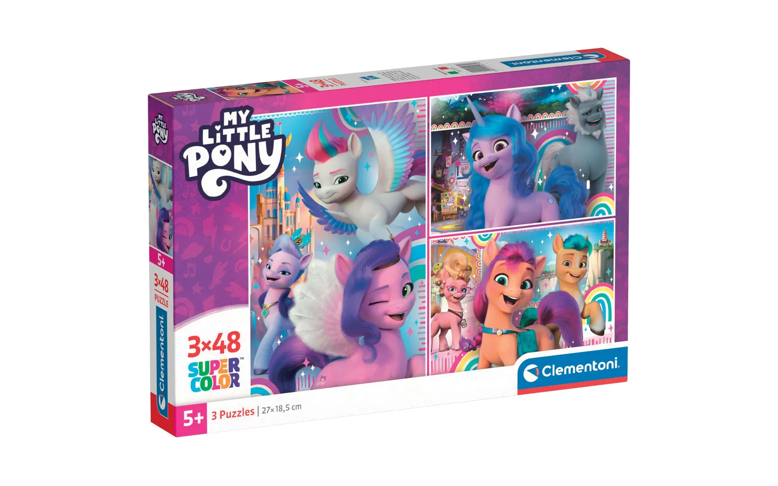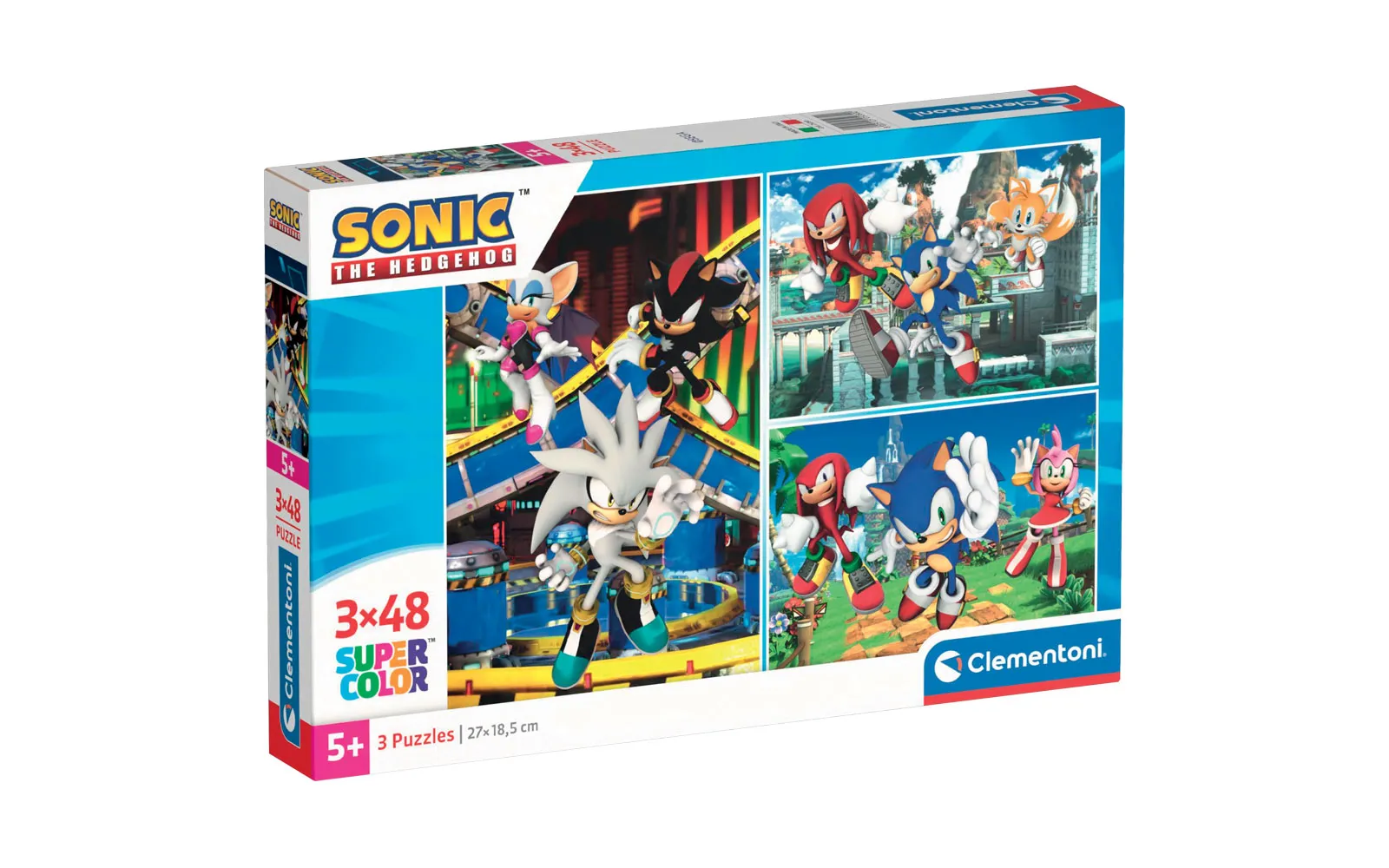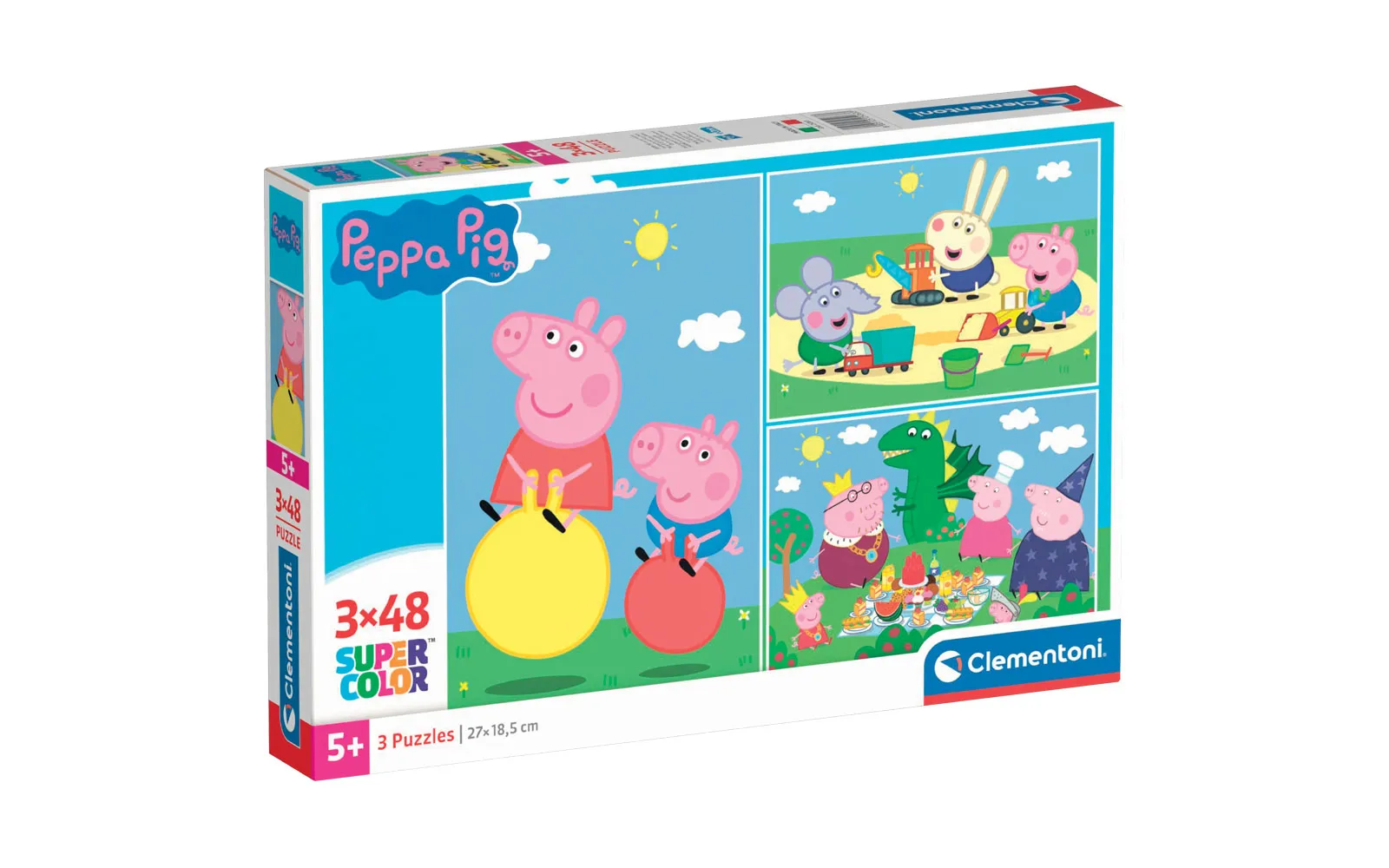 Tri slagalice popularnih crtanih likova sa po 48 dijelova u jednom pakiranju. Slagalice Supercolor Clementoni prate dijete kroz sve faze razvoja i pomažu mu u razvijanju motoričkih vještina i sposobnosti promatranja. Kvaliteta materijala i posebna tehnika tiskanja jamče uvijek lijepe, živahne i jasne boje. Preporučuje se djeci od 5. godine starosti nadalje.