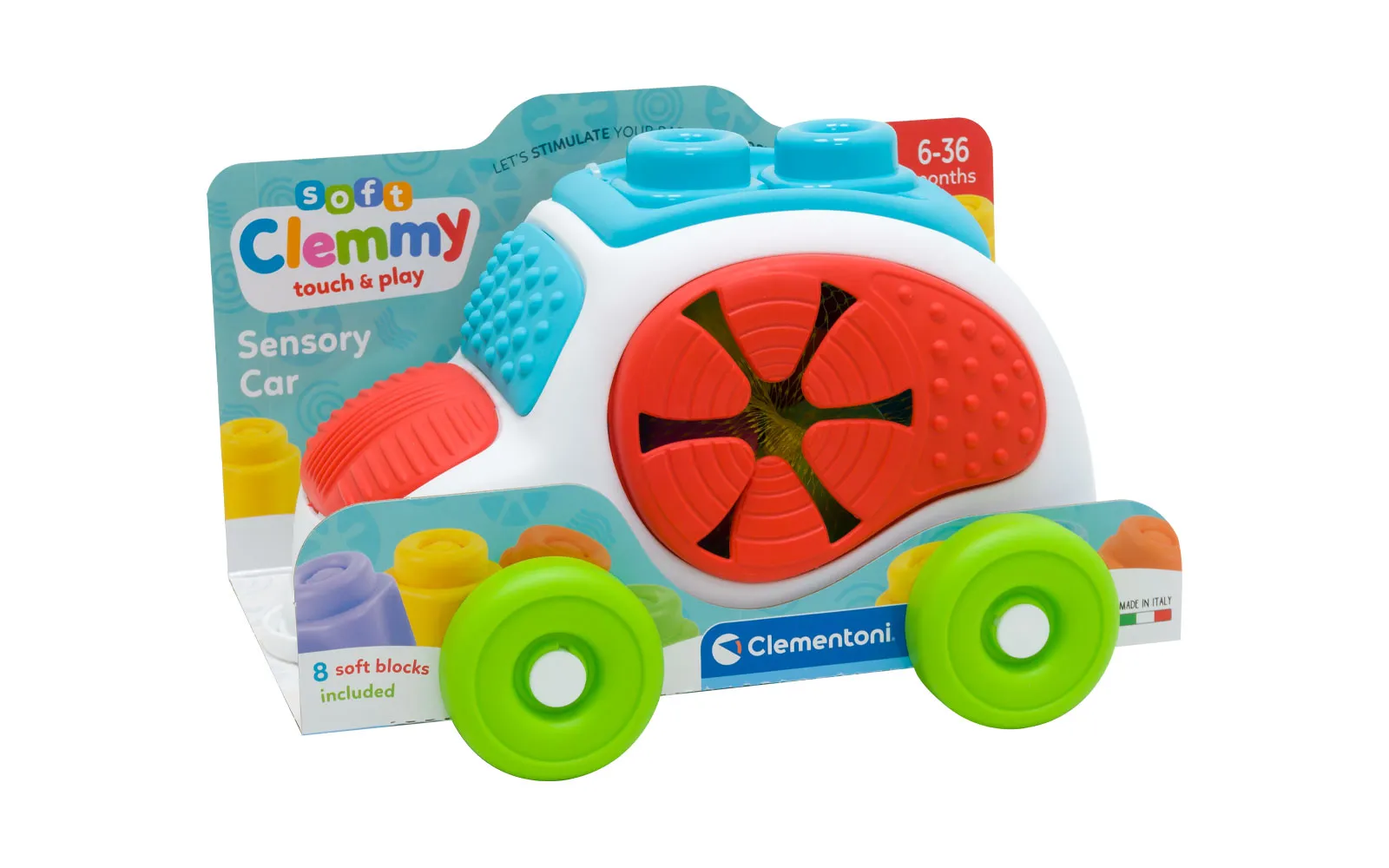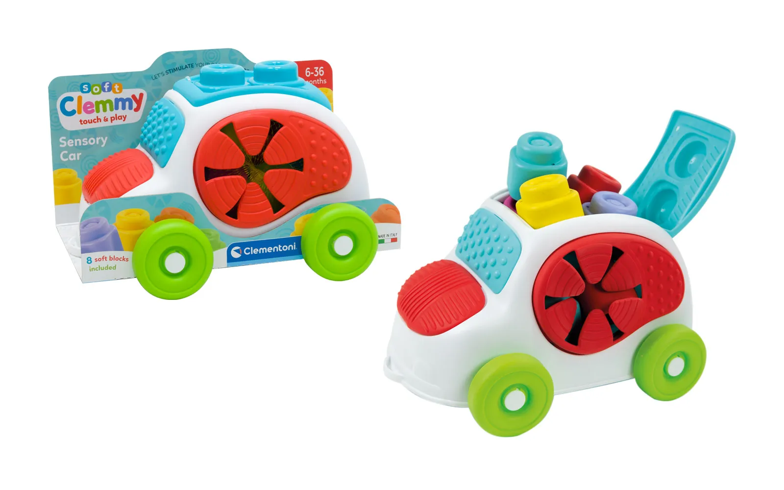 Auto linija soft Clemmy je odlična igrača za vaše najmlađe. Set uključuje šareni auto i 8 Clemmy mekih kockica. Auto krasi siguran dizajn i mogućnost pranja, i auta i priloženih Clemmy kockica. Različite osjetilne površine potiču senzorni razvoj djeteta i unose dodatnu zabavu u istraživanje oblika i boja. Primjereno za djecu od 6. do 36. mjeseca starosti.