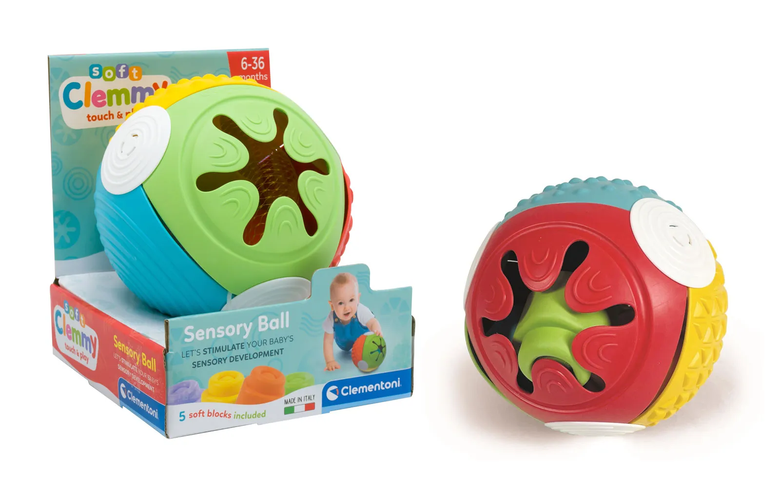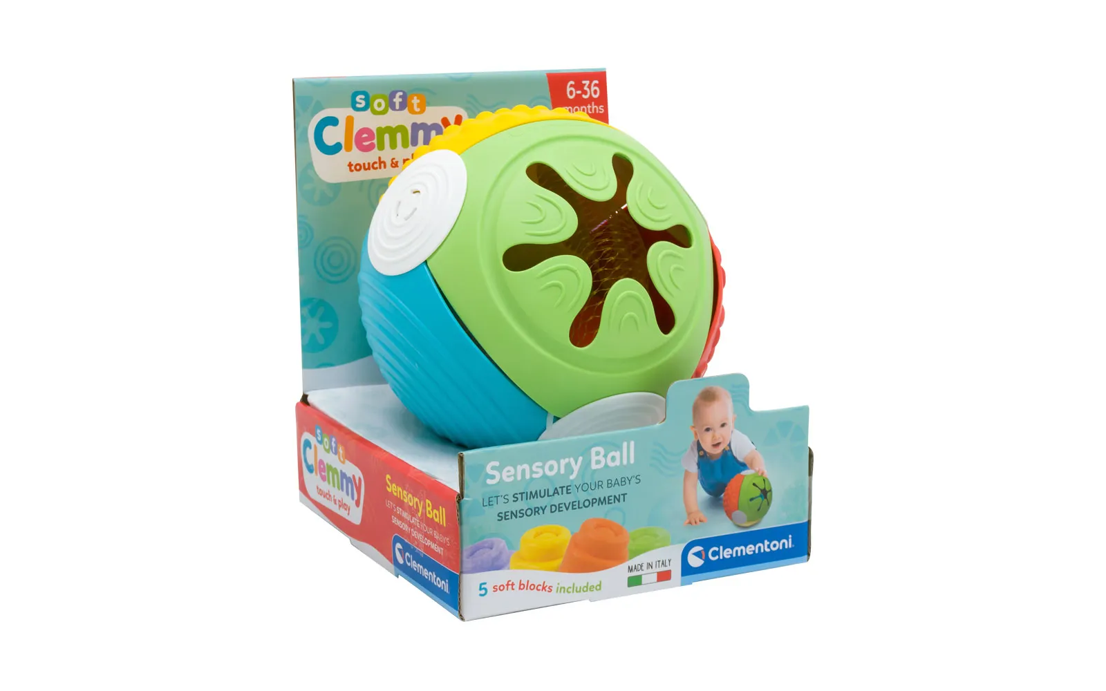 Mekani Clemmy kockovi, pohranjeni u prekrasnoj mekanoj lopti, su savršeni za edukativnu igru djece. Mekani blokovi su odličan poticaj za senzoriku i motoriku djeteta te povoljno utječu na njegov razvoj. Lopta sadrži otvor kroz koji dijete ubacuje obojene Clemmy kocke. Igračka je prikladna za djecu stariju od 6. mjeseca.