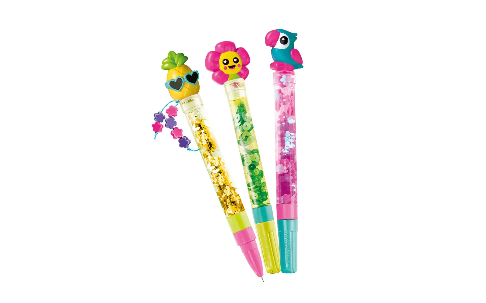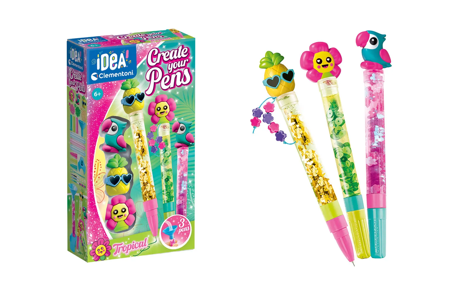Set olovaka Idea Pens Create - Tropical, Clementoni. Olovke su živih boja s različitim slikama - iz tropskog svijeta. Set sadrži 3 olovke s slikama - ananasa, cvijeta i papige. Olovke su različitih boja. Djeca mogu proizvoljno dodavati dodatke u olovku i na taj način stvarati jedinstvene proizvode. U setu ćete pronaći 3 prozirne olovke koje djeca mogu ukrasiti po želji, 3 gumice u oblicima različitih likova, 3 prozirne čepove, 3 vrećice s dekorom kojima možete ukrasiti olovku, 3 punjenja za olovke u različitim bojama, 8 plastičnih kuglica, elastični konopac i slikovne upute.