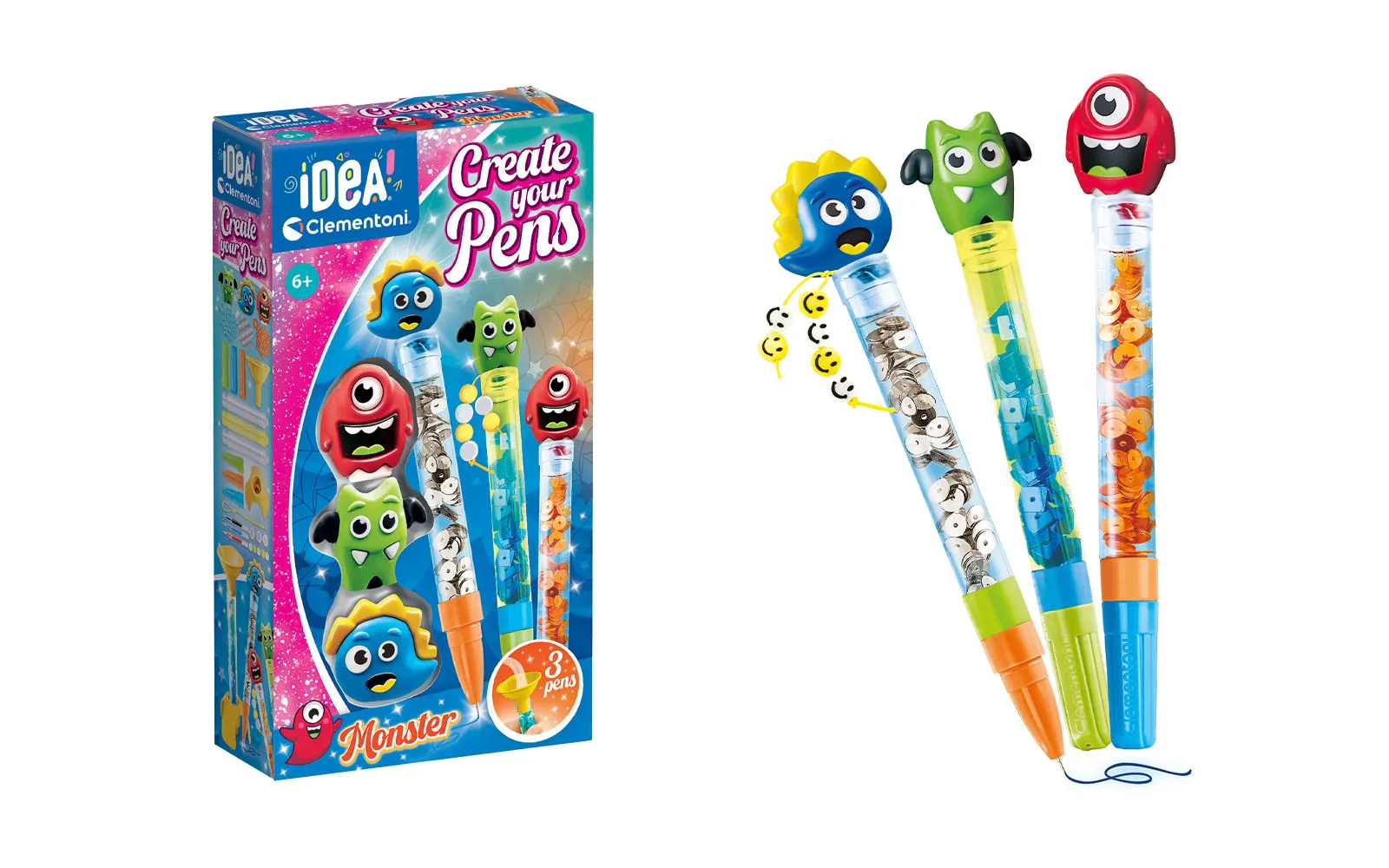 Set olovaka Idea Pens Create - Monster, Clementoni. Olovke su živih boja s različitim slikama - iz svijeta čudovišta. Set sadrži 3 olovke s likovima čudovišta. Olovke su različitih boja. Djeca mogu proizvoljno dodati dodatke u olovku i tako stvoriti jedinstvene proizvode.
