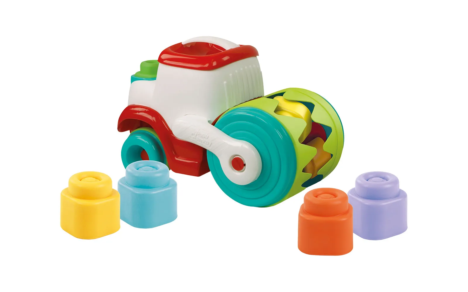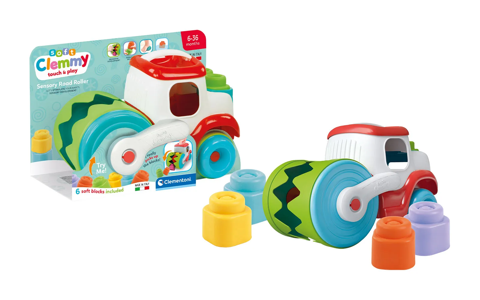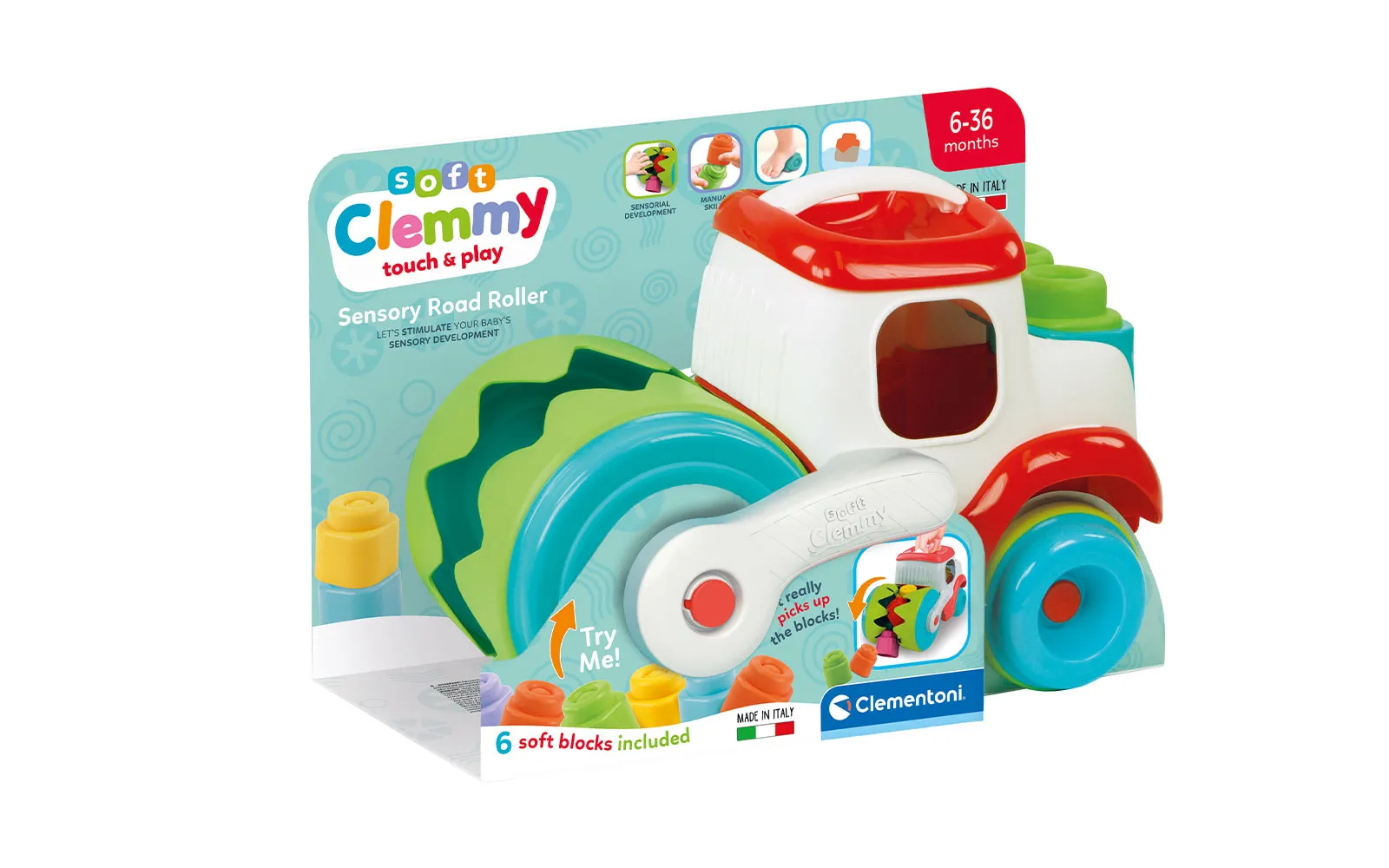 Mekane kocke Clemmy u bageru, Clementoni. Bager je šaren i živahnih boja, što značajno utječe na razvoj dječje mašte, a istodobno potiče i dodir i razvoj senzorike. Više je od samo igračke - to je senzorsko radno vozilo, rana stimulativna iskustva za djecu, dizajnirana da prati dječake i djevojčice u njihovim prvim fazama razvoja. Svojim šarenim dizajnom, mekanim teksturama i brojnim aktivnostima potiče djecu na istraživanje, otkrivanje i prije svega na neprestano igru. Set sadrži senzorske kocke različitih boja i bager.