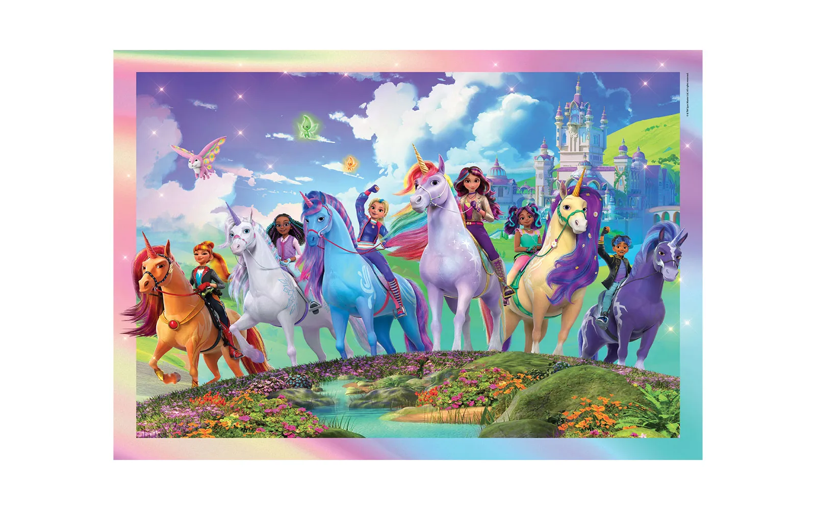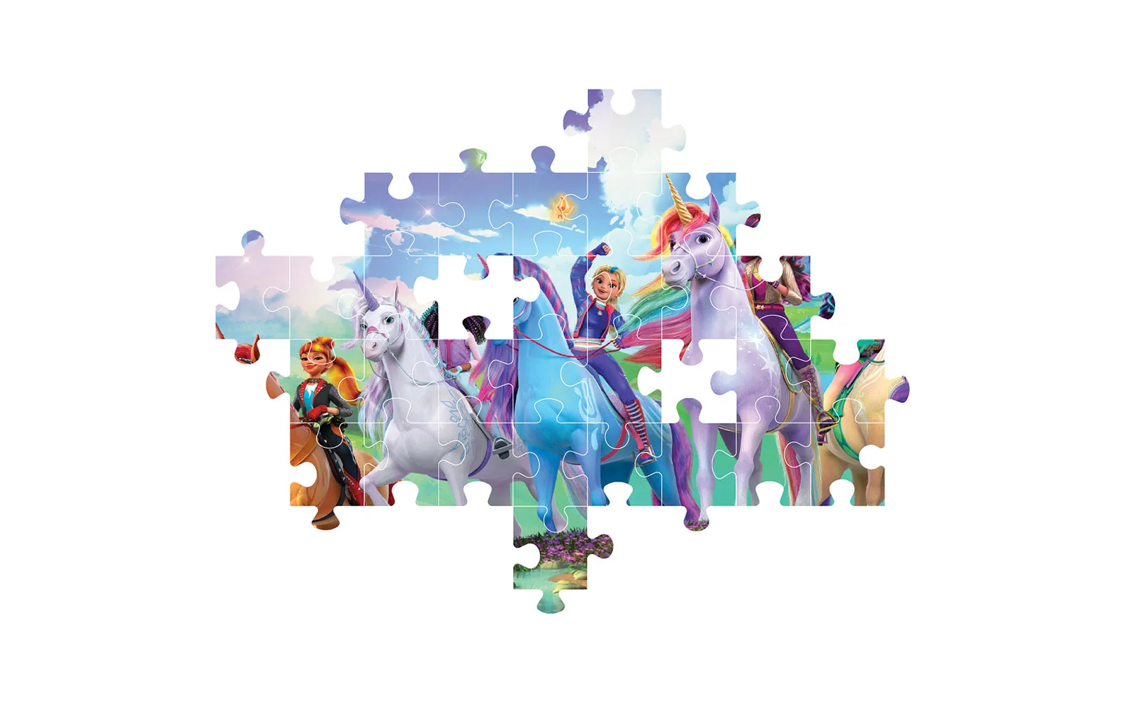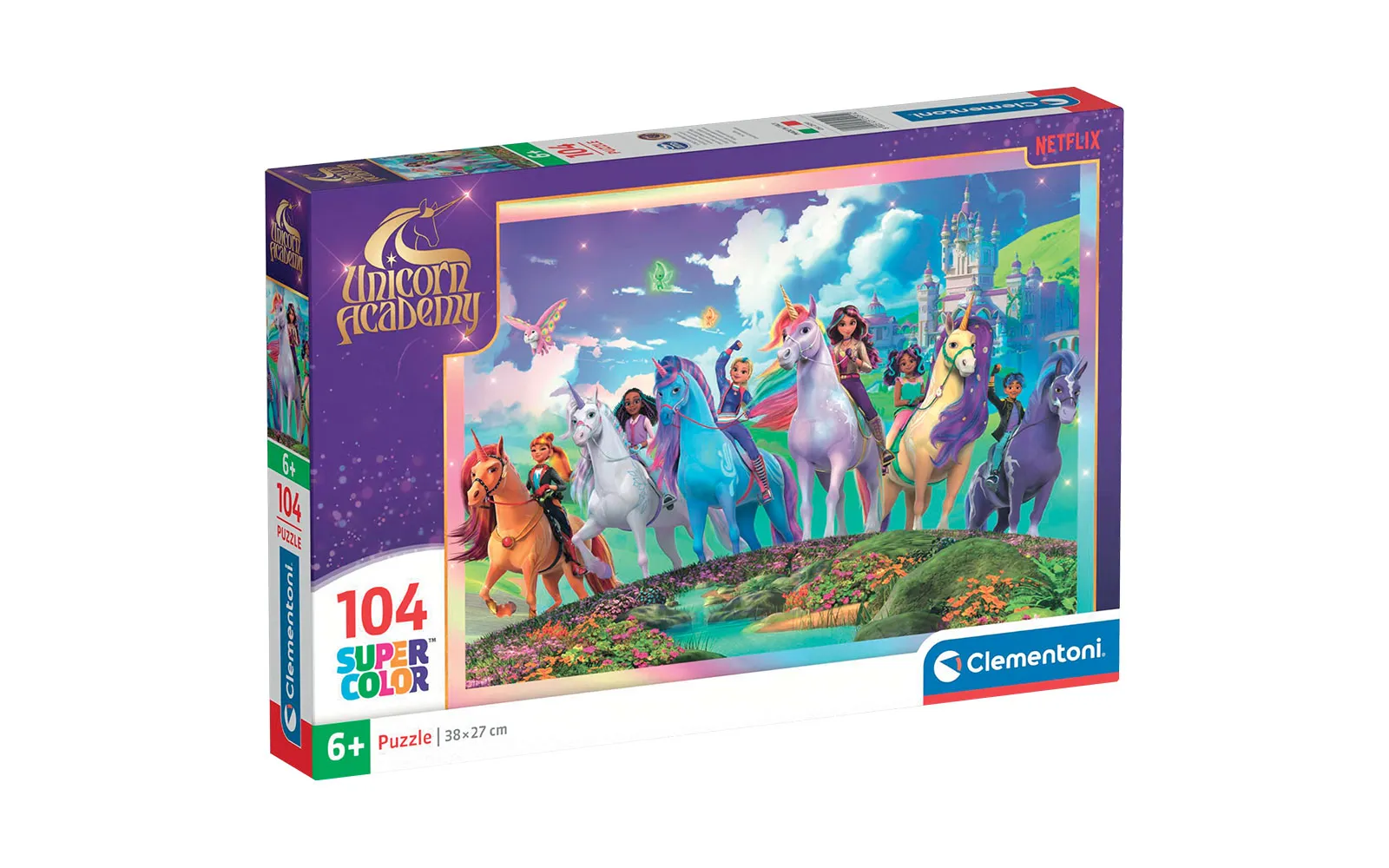 Puzzle različitih crtićkih junaka s 104 sastavna dijela su prikladne za djecu od 5./6. godine naviše. Puzzle supercolor Clementoni prate dijete kroz sve faze razvoja i pomažu mu razviti motoričke vještine i sposobnosti promatranja. Kvaliteta materijala i posebna tehnika tiskanja jamče uvijek lijepe, živahne i jasne boje. Dostupno u motivu Unicorn academy.
