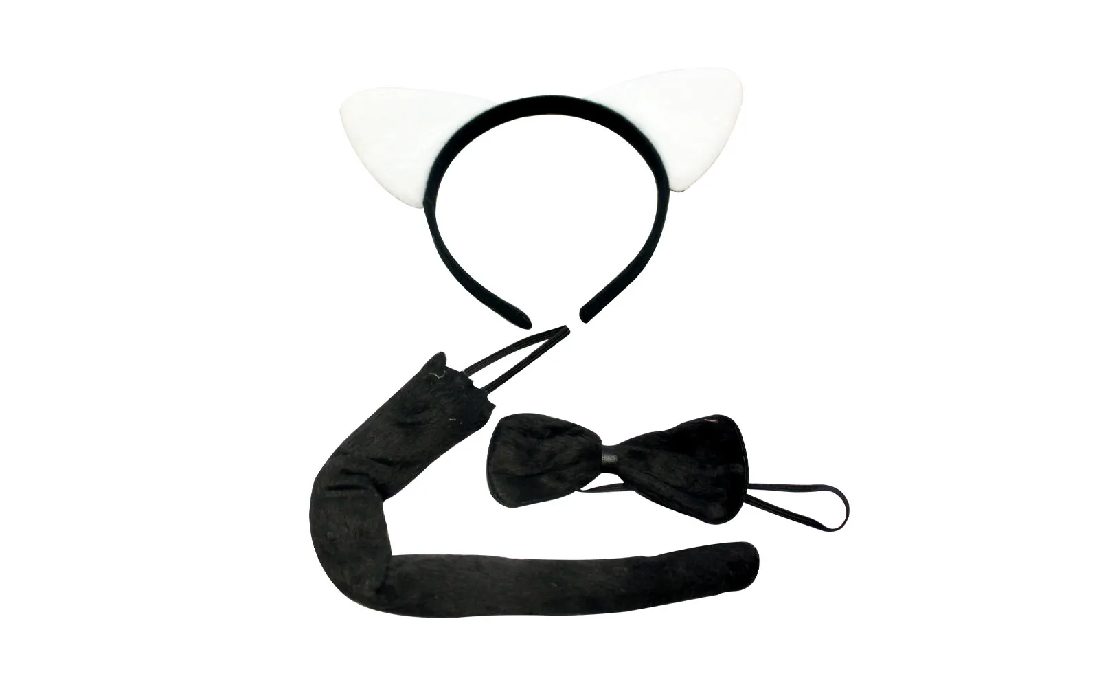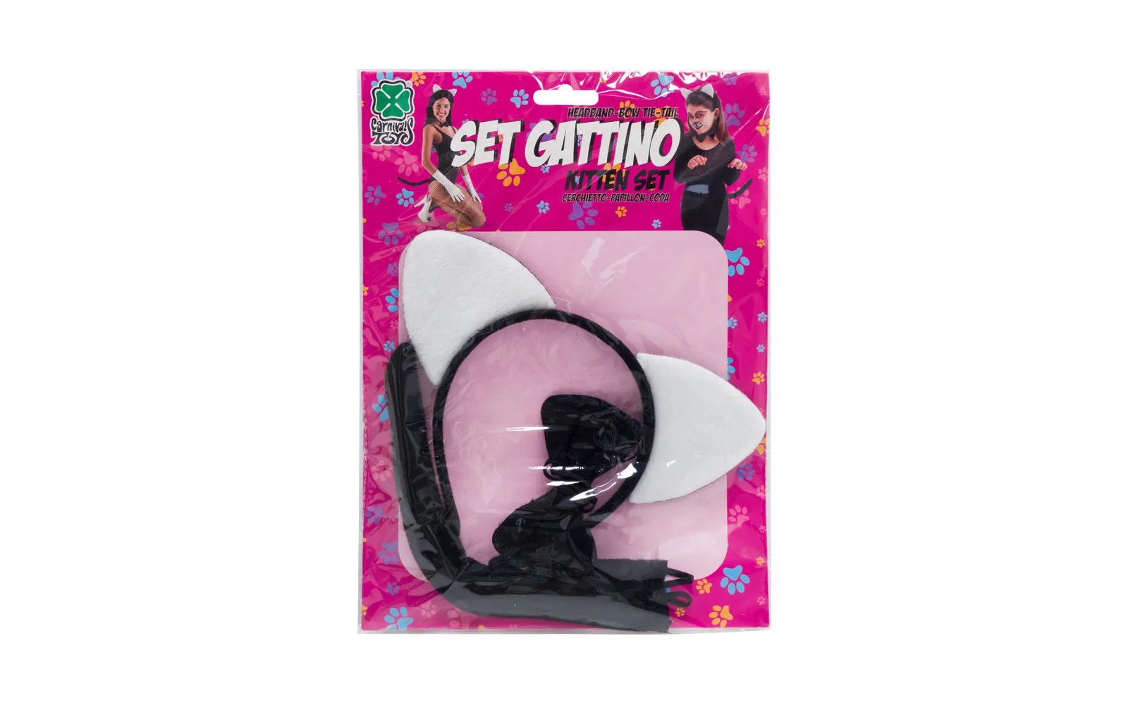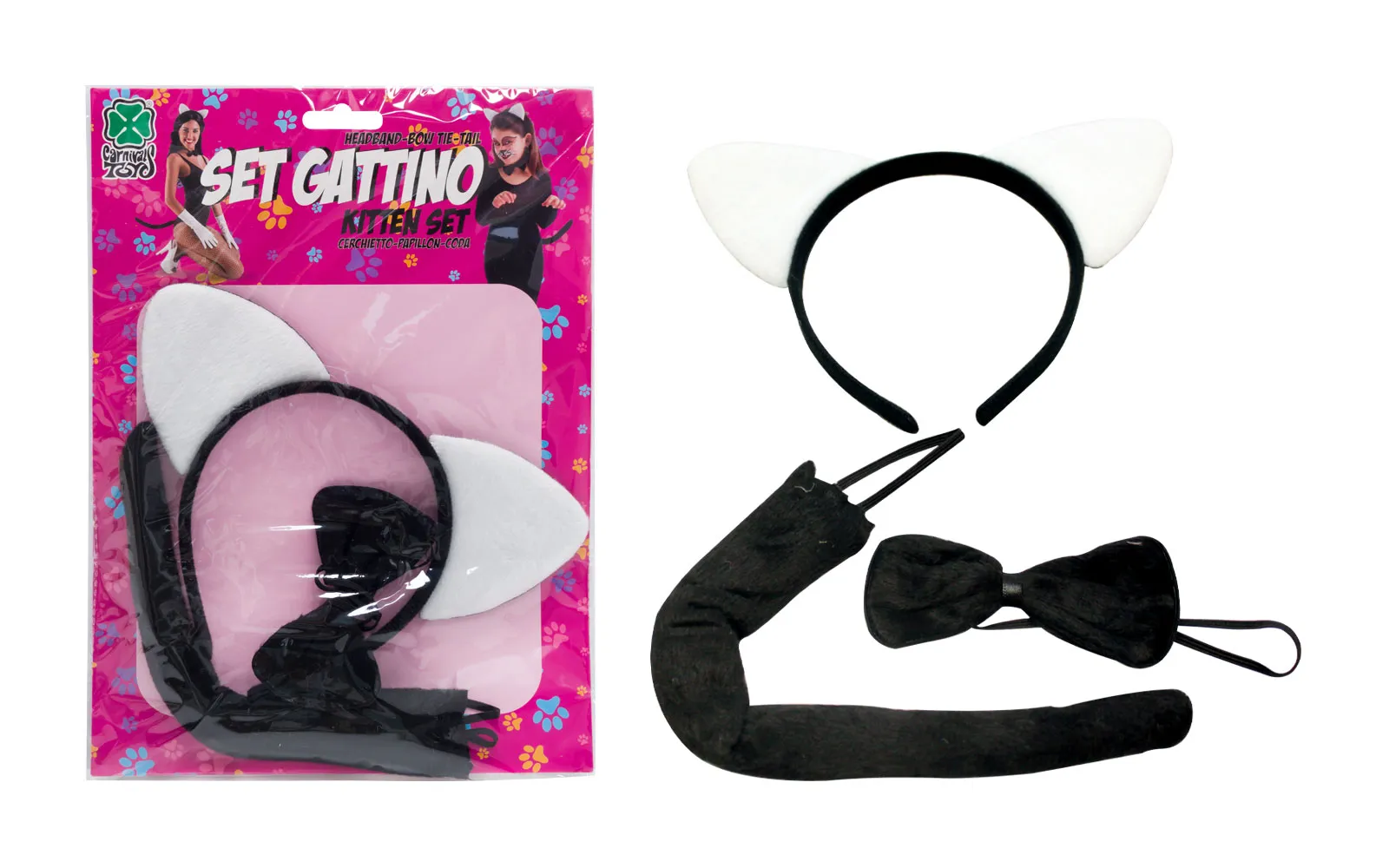 Karnevalski set mačke sadrži obruč s ušima, rep i leptir-mašnu. Budi vesela mačka koja se zabavlja na karnevalskoj zabavi.