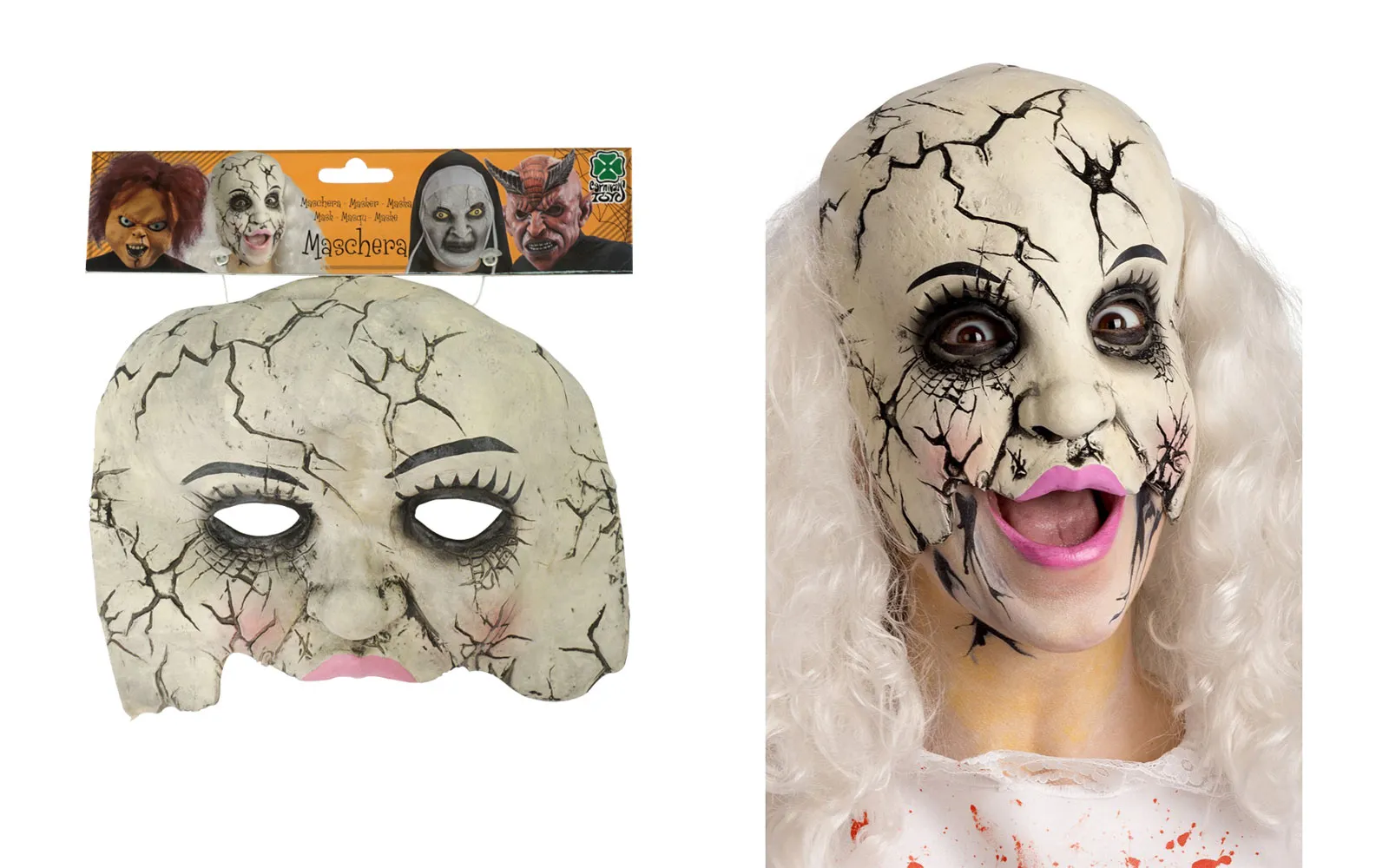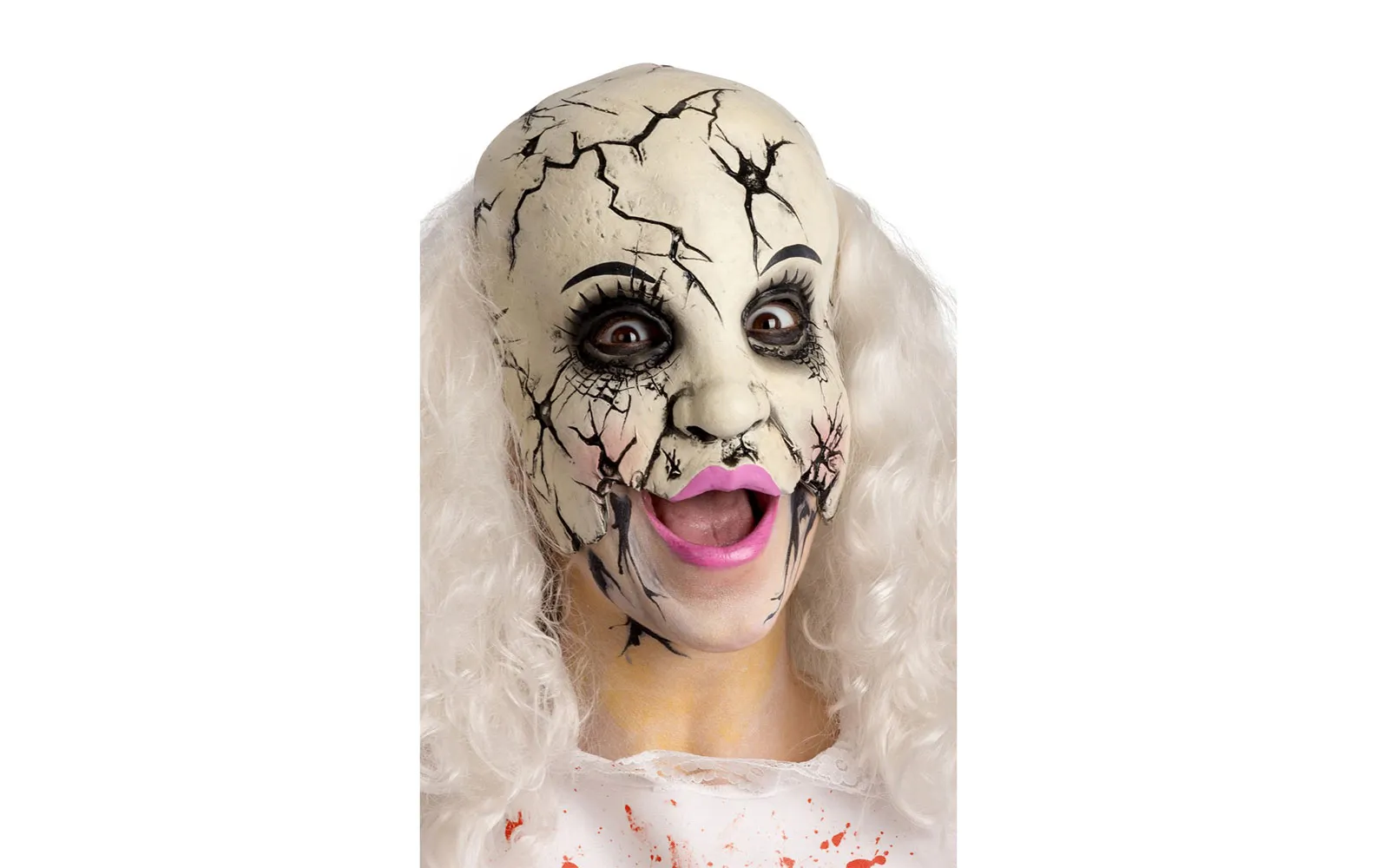 Karnevalska maska žene strave pokriva pola lica, napravljena je od lateksa i prikazuje lice žene s pukotinama koje podsjeća na lutku strave.