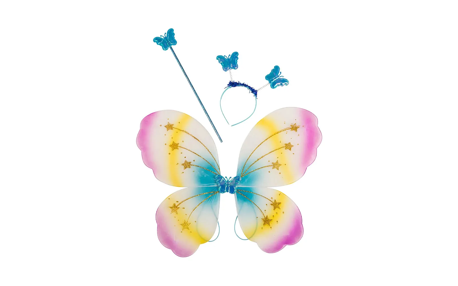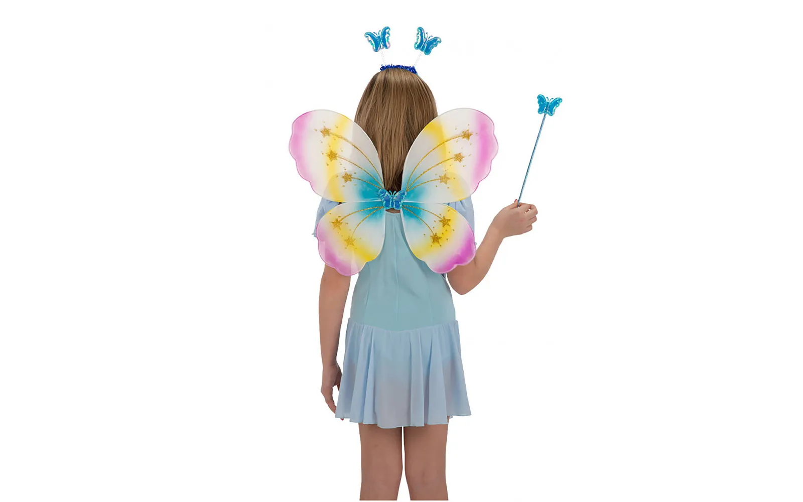 Set leptira uključuje višebojna krila leptira dimenzija cca 40x50 cm, obruč s antenama s leptirićem i štap za predivan izgled na karnevalskoj zabavi.