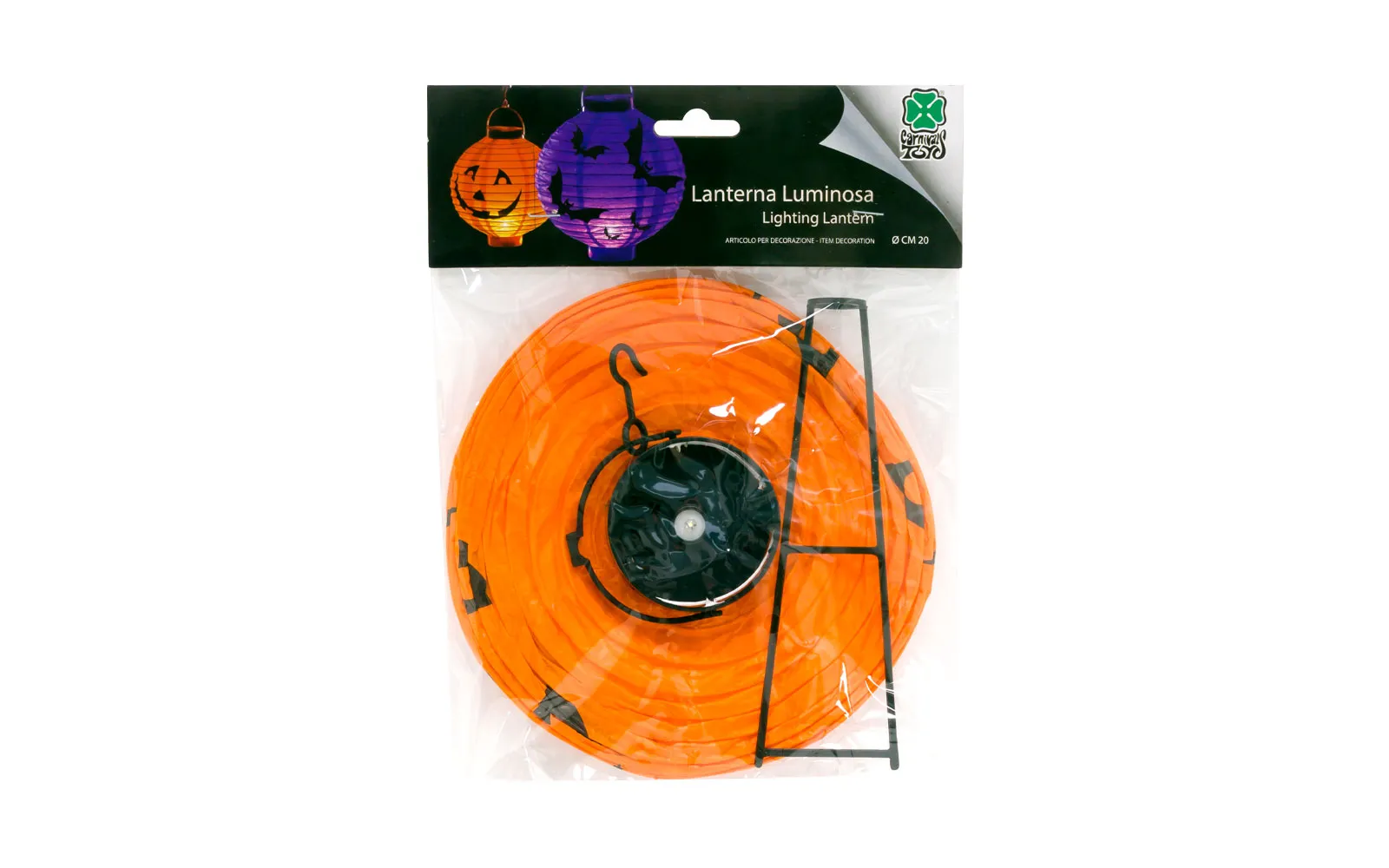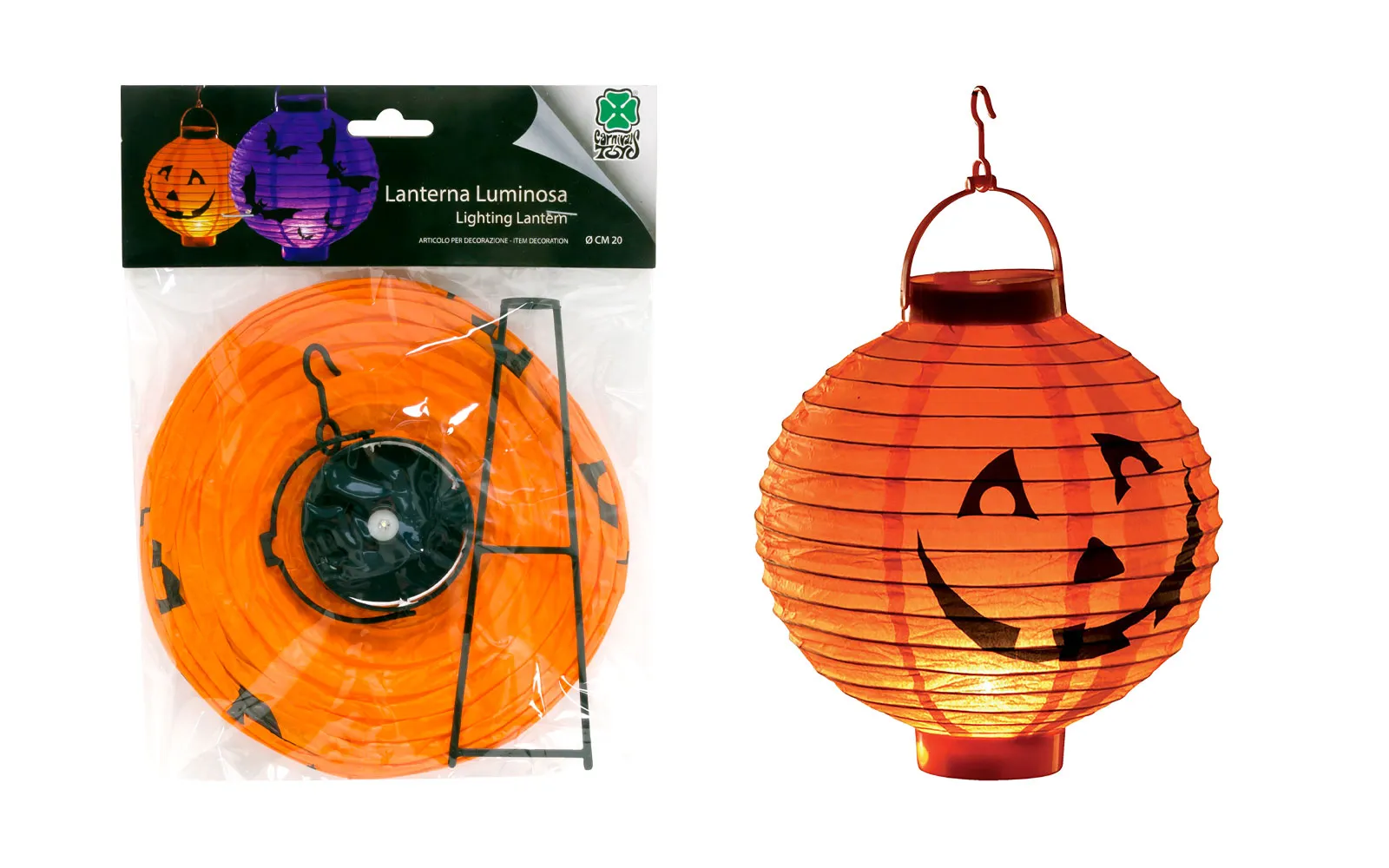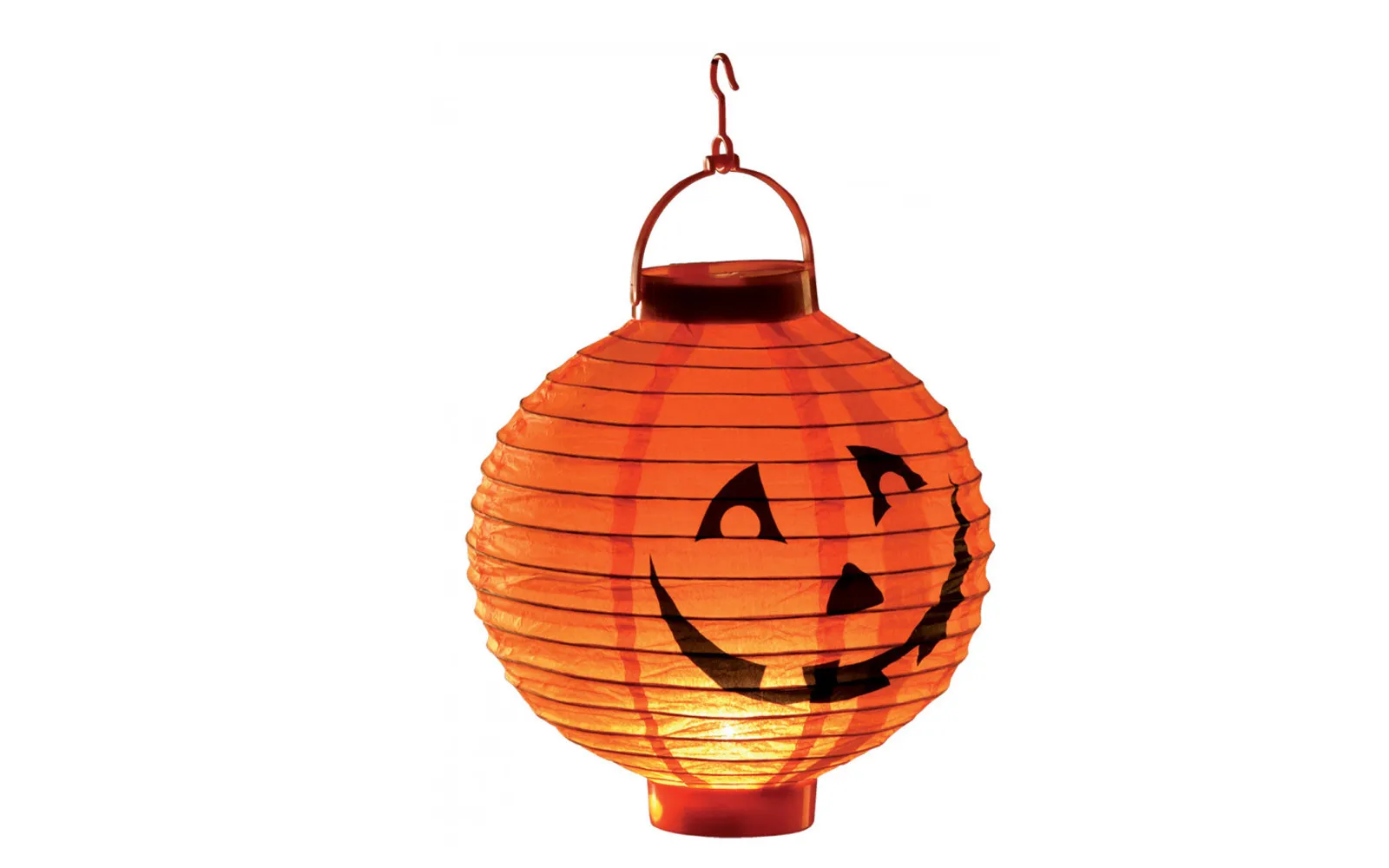 Viseća svjetiljka u obliku bundeve - lampion. Svjetiljka je napravljena od papira i veličine je 20 cm. Proizvod radi na baterije.