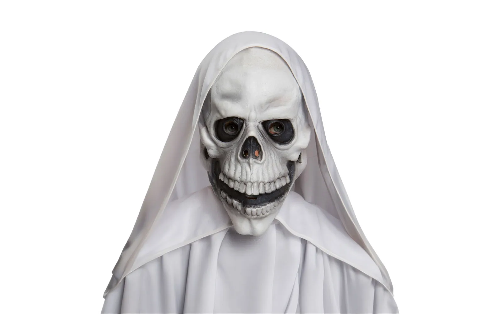Karnevalska maska bijele smrti s kapuljačom zastrašujućeg izgleda.