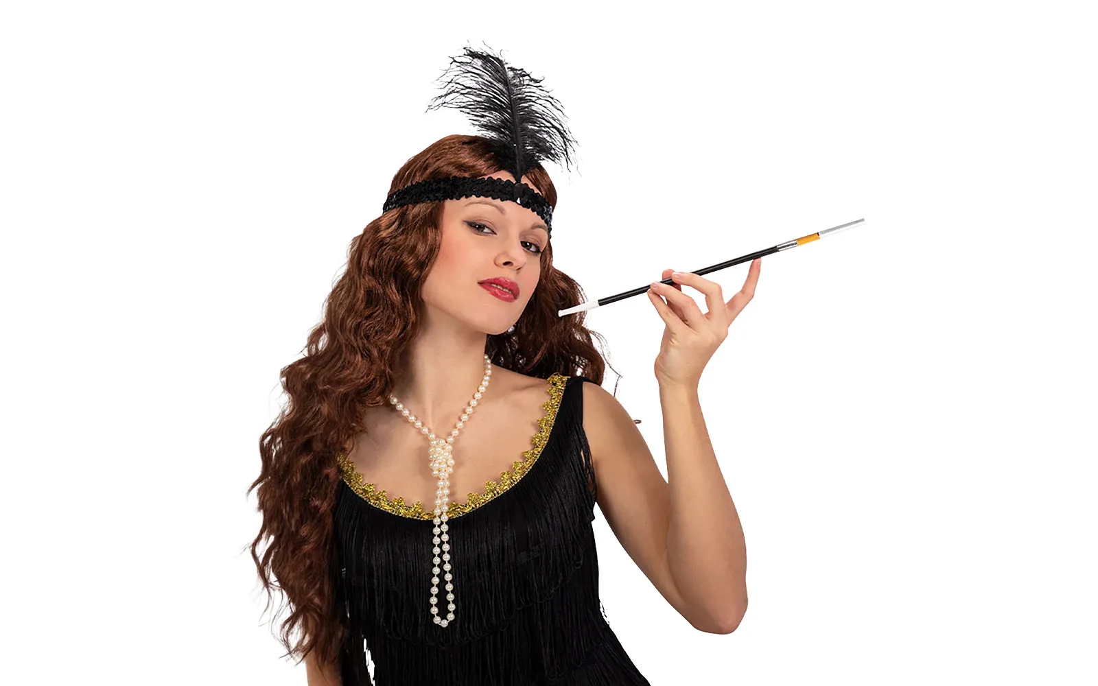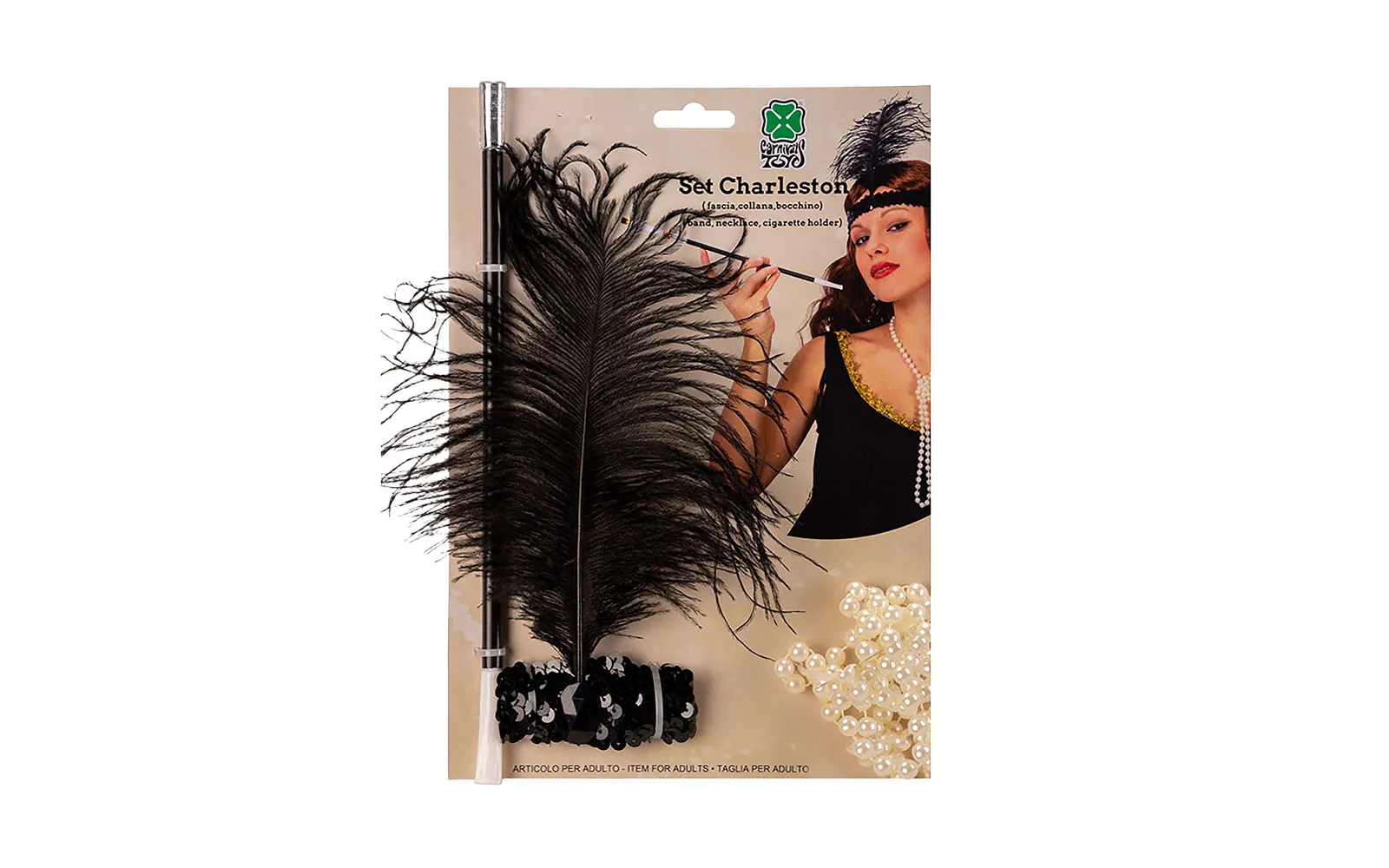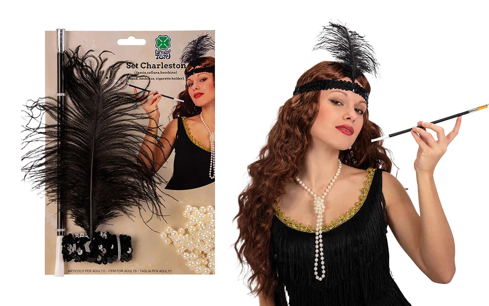 Set Charleston je savršen dodatak za tematske zabave u stilu 20-ih godina. Sadrži traku za glavu s perom, ogrlicu s imitacijom bisera, držač za cigarete i čipkastu narukvicu. Idealno za karneval, retro zabave ili kazališne predstave.