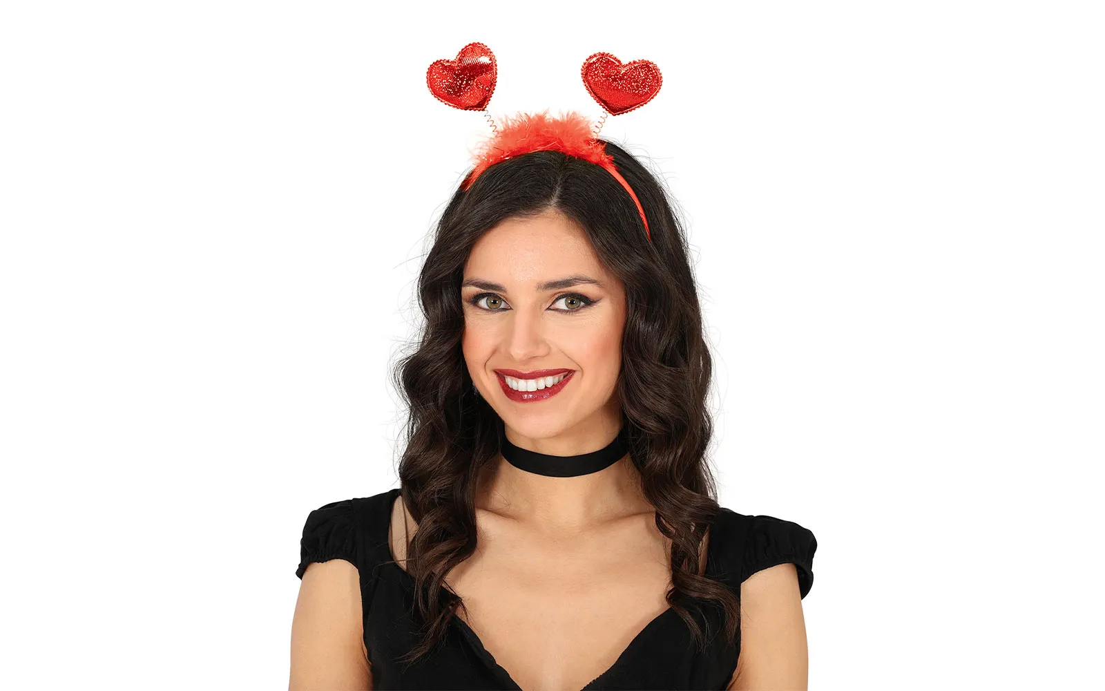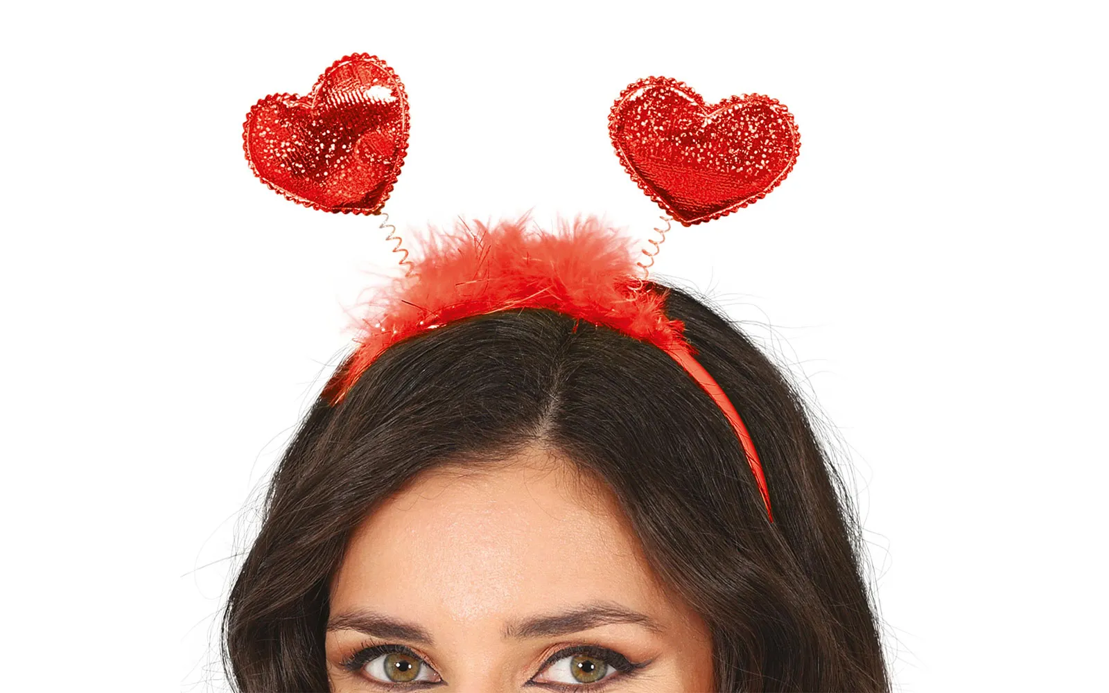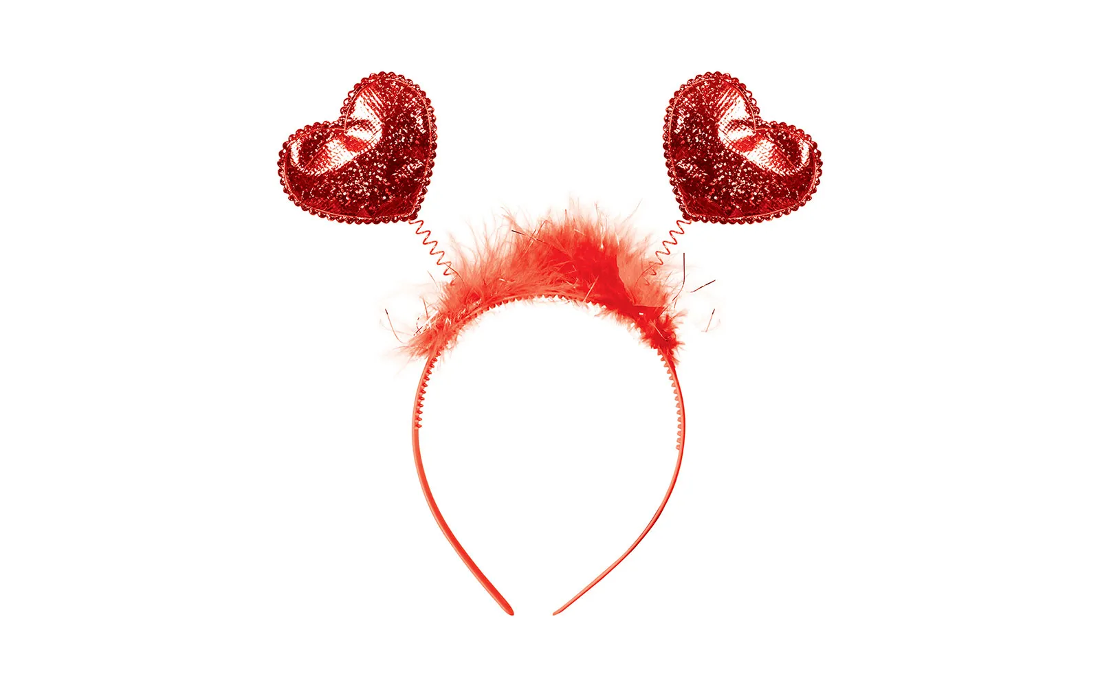 Karnivalski obruč u obliku srca, crvene boje. Glava s srcima na oprugama. Stavi glavu, začini svoj karnevalski kostim i postani zvijezda karnevala.