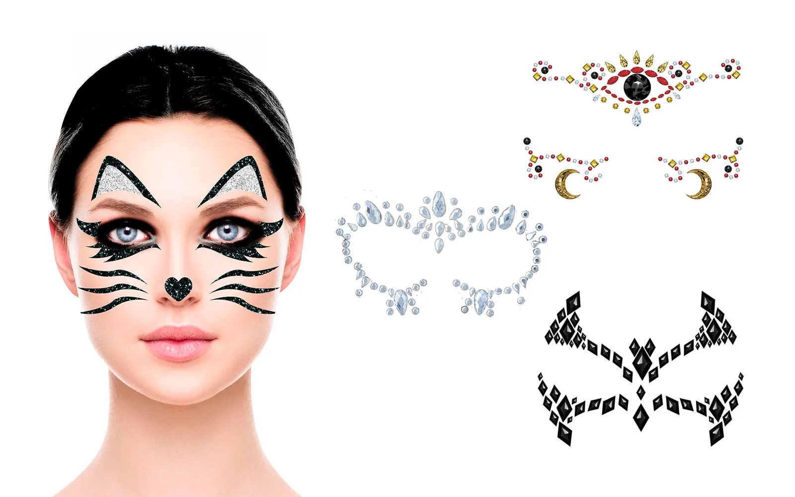 Karnevalska lica dekoracija - naljepnice. Savršen dodatak za karnevalske kostime! Samoljepiva dekoracija za brzo i efikasno ukrašavanje lica. Jednostavna upotreba bez dodatnog šminkanja - samo zalepiš i zasjaš! Idealno za zabave, rođendane ili karnevalske avanture. Dostupne kao naljepnice u obliku nakita, mačke, srebrne boje ili šišmiša.