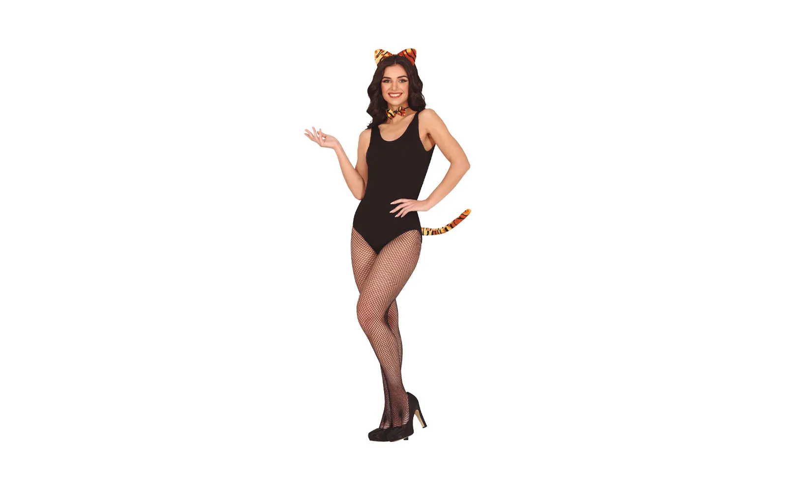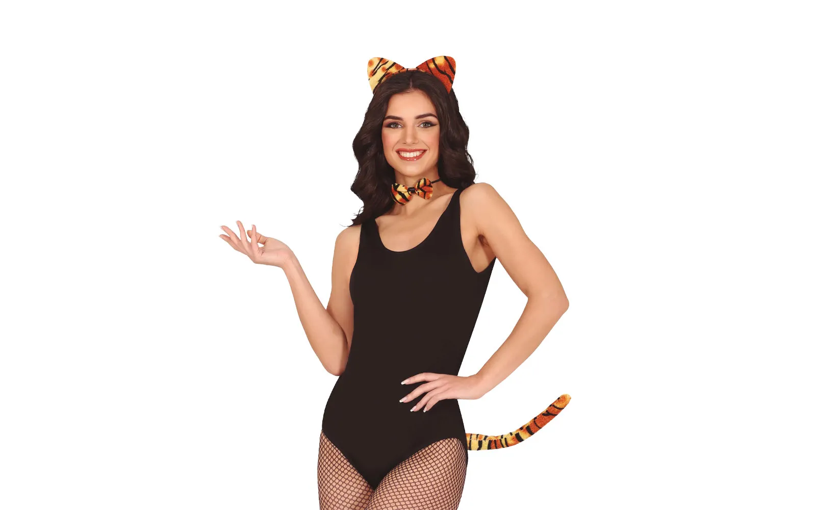 Karnevalska traka tigar + rep + leptirić. Pretvorite se u divlju mačku s ovim veselim setom! Sadrži traku za glavu s ušima u tigrovom uzorku, odgovarajuću mašnu koja se nosi oko vrata i dug rep. Savršen dodatak mačjem kostimu za karneval, tematske zabave ili izvedbe na pozornicu. Set je namijenjen odraslima i sigurno će privući poglede!