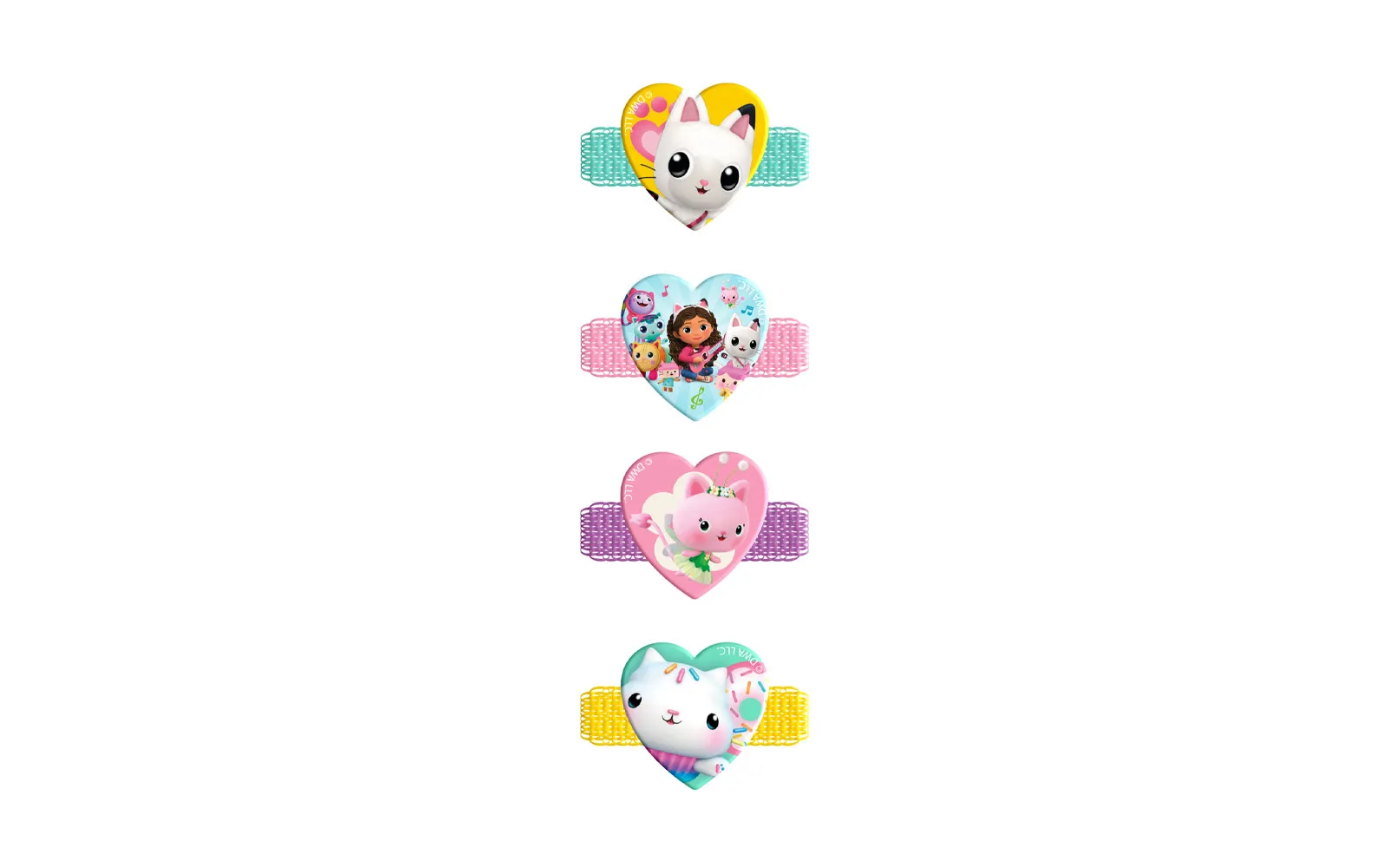 4 gumene trake za kosu s privjescima likova iz animirane serije Gabby's dollhouse. Trake su različitih boja i nose privjeske junaka Gabby's dollhouse.
