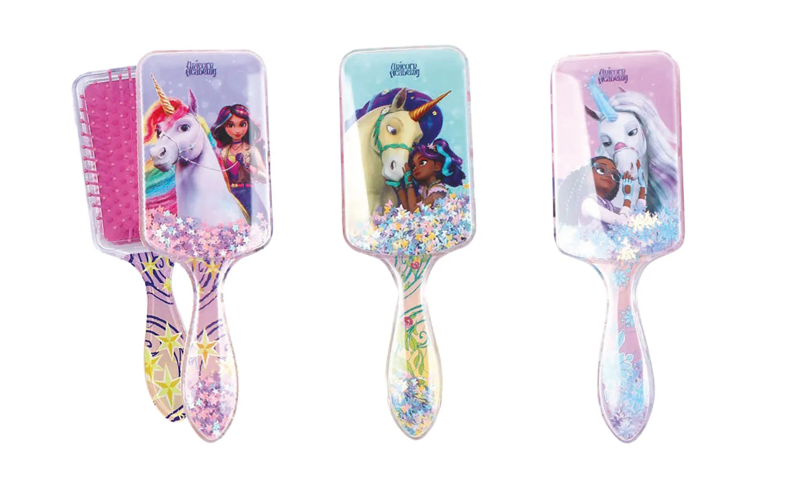 Prekrasna četka za kosu, Unicorn akademija sa šljokicama. Dostupno u tri različita stila - slika Sophie i njenog jednoroga Wildstar, Ava i jednorog Leaf te Lyla i jednorog Glacier. Idealna je za svakodnevno oblikovanje i nježno raščešljavanje kose bez oštećivanja. Sjajni detalji: Svaka četka je ukrašena sitnim šljokicama za luksuzan i modern izgled.