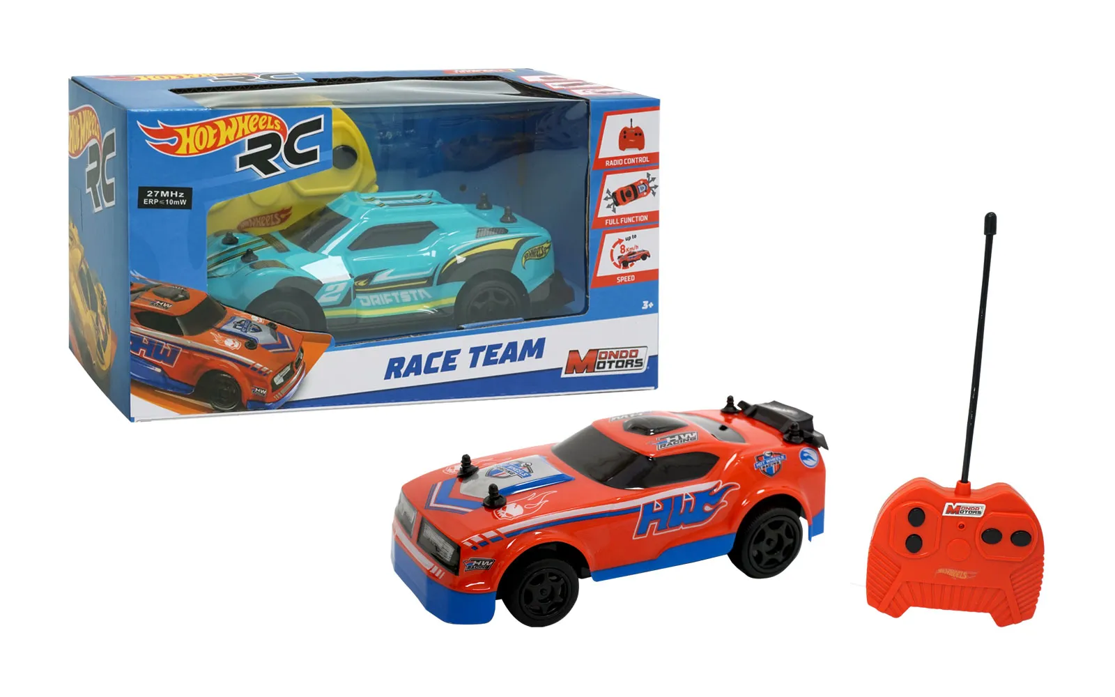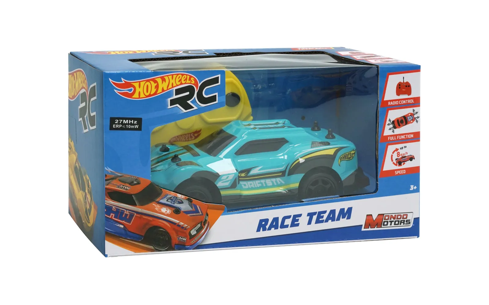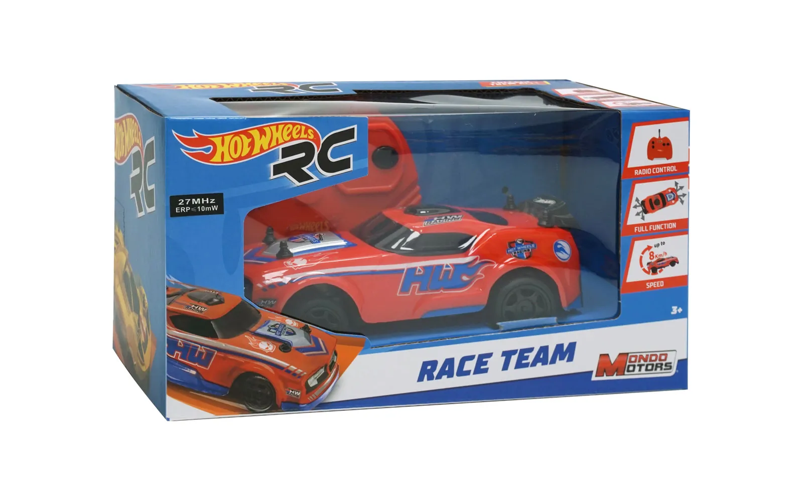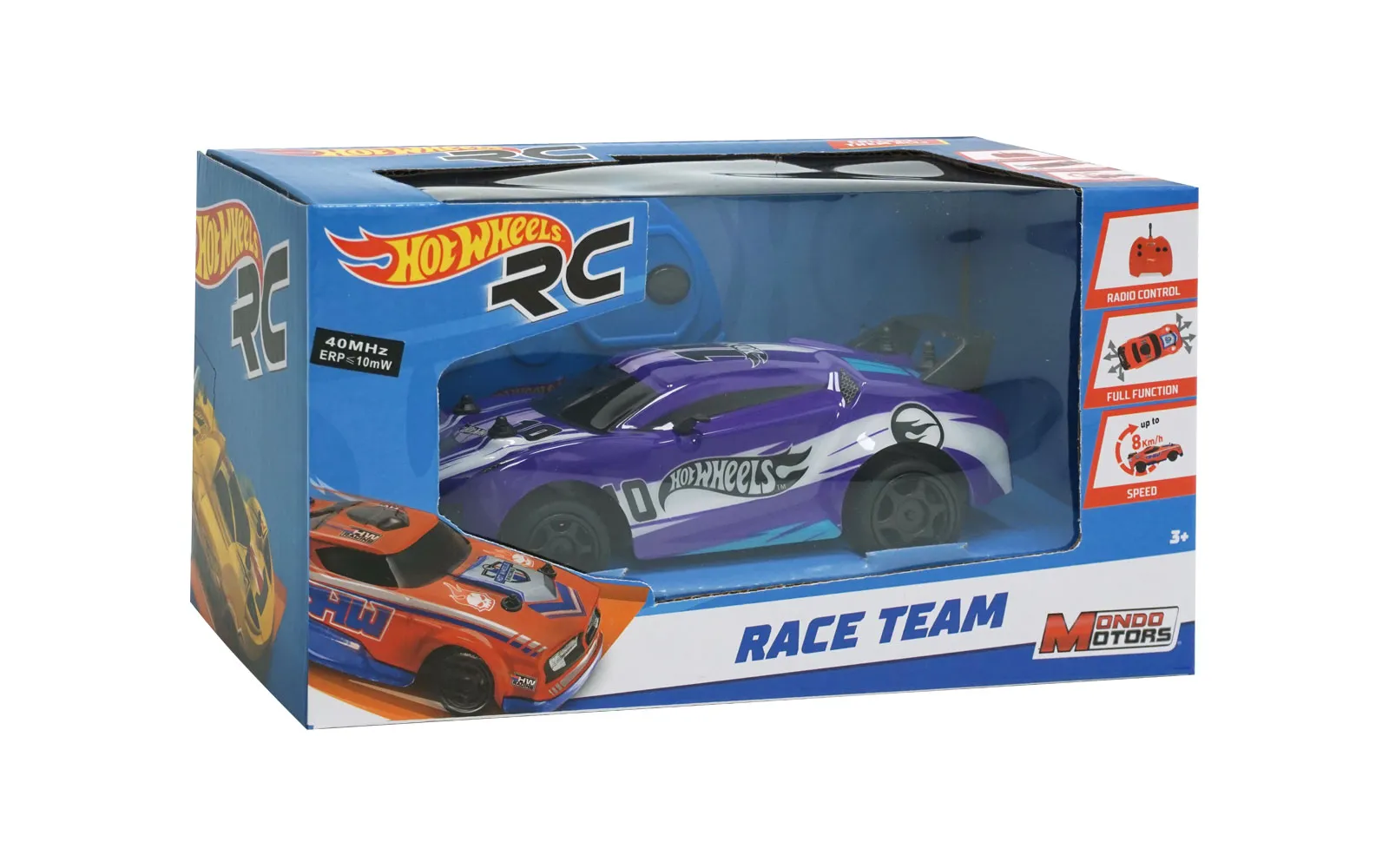 Atraktivna baterijska vozila Hot wheels na daljinsko upravljanje u omjeru 1:28 za zabavnu i sportsku igru brzinom do 8 km\/h. Auto za rad treba 2 baterije tipa AA 1.5V, daljinski upravljač pak 2 baterije tipa AAA 1.5 V. Baterije nisu priložene.