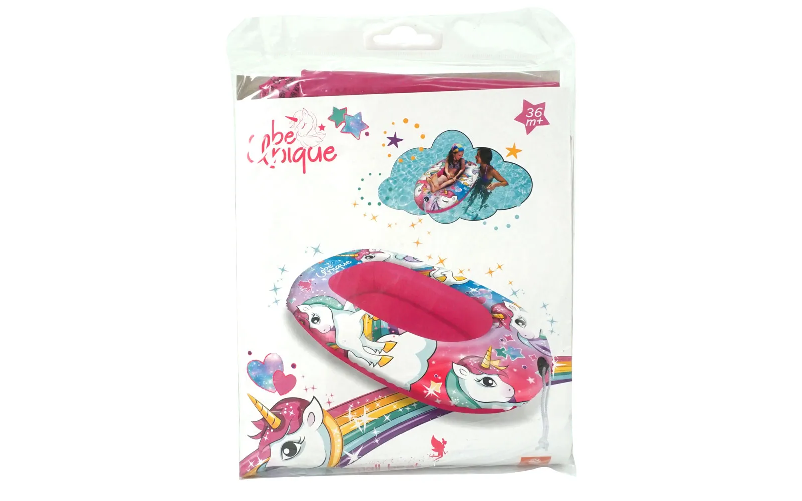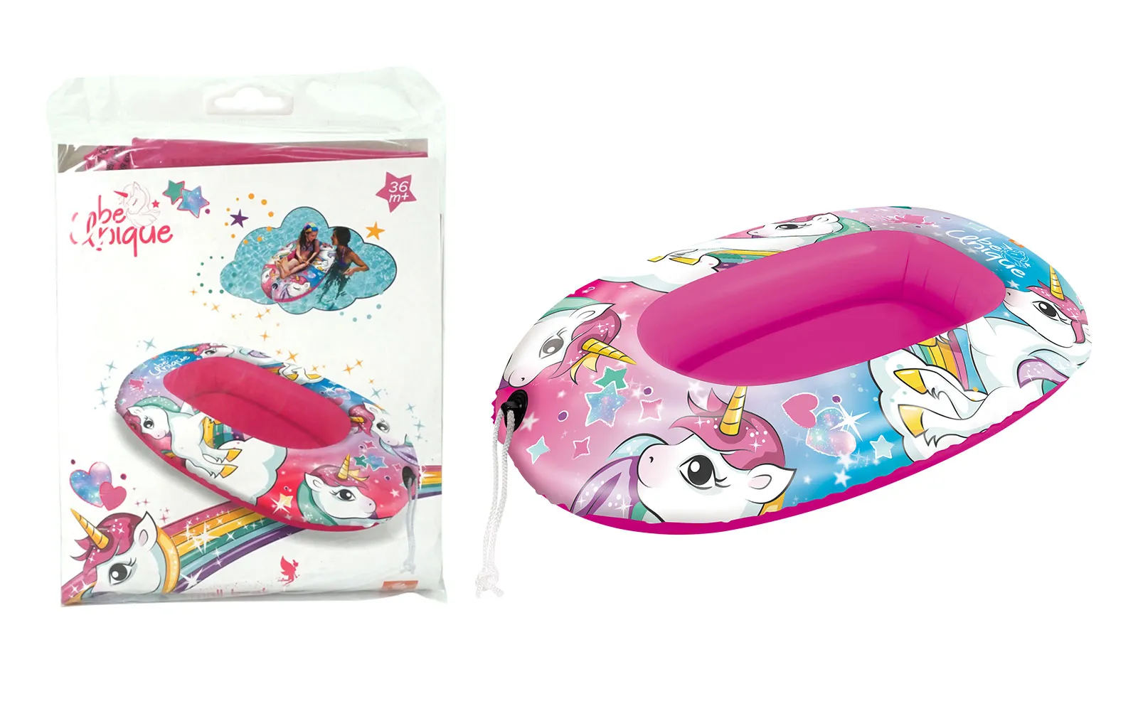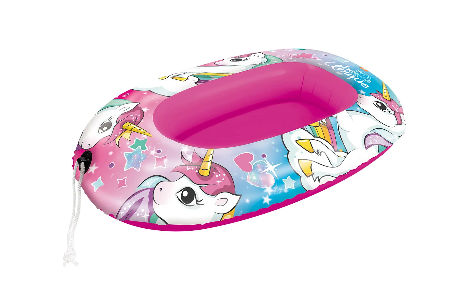 Čamac s motivom jednoroga veličine 94 cm s praktičnim konopom za vuču po vodenim površinama.