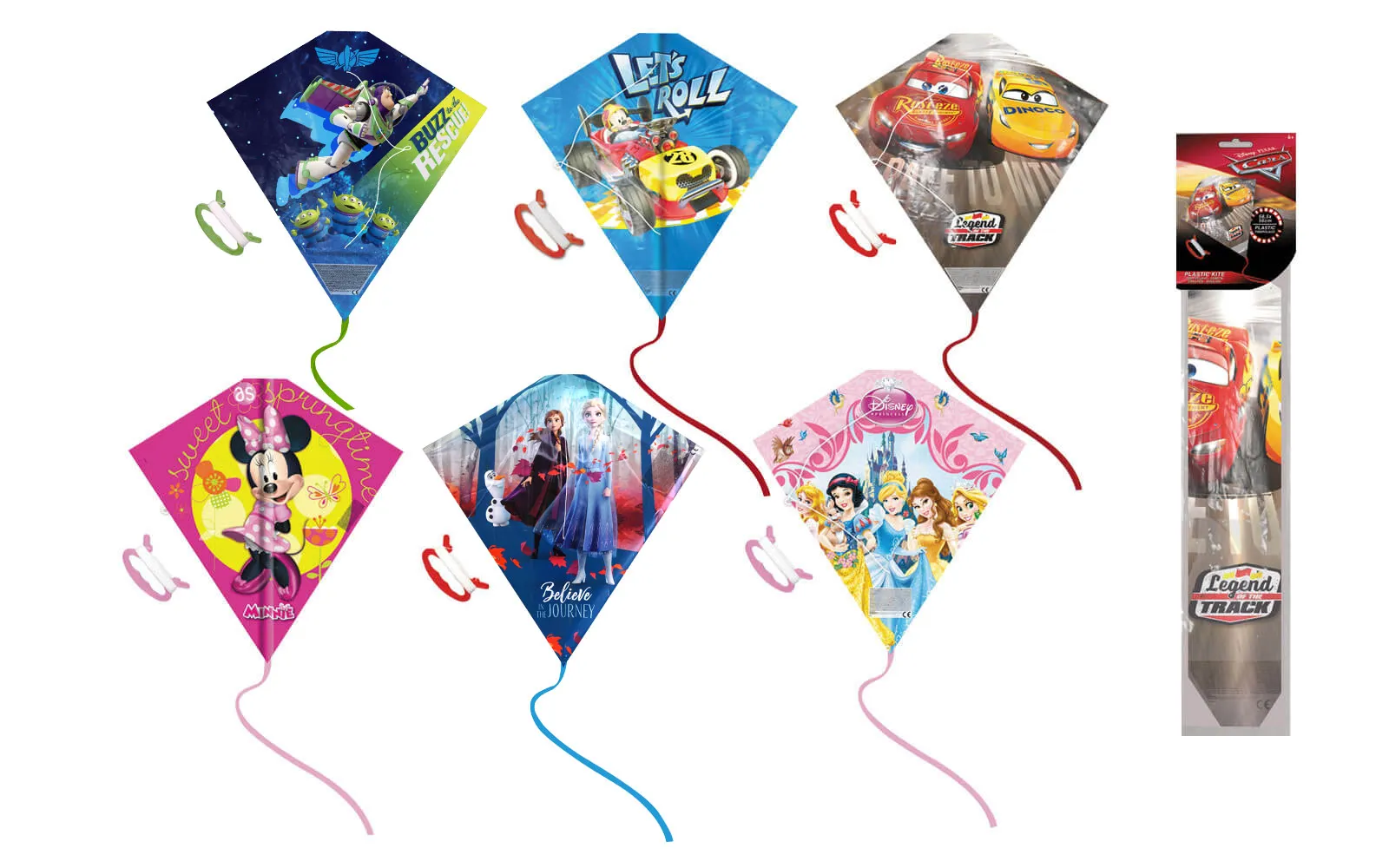 Plastični zmaj dimenzija 58.5x56 cm s motivima animiranih likova Frozen, Mickey i utrke roadster-a, Princess, Minnie ili Toy Story. Odaberi travnjak bez prepreka i pusti zmaja visoko u zrak.