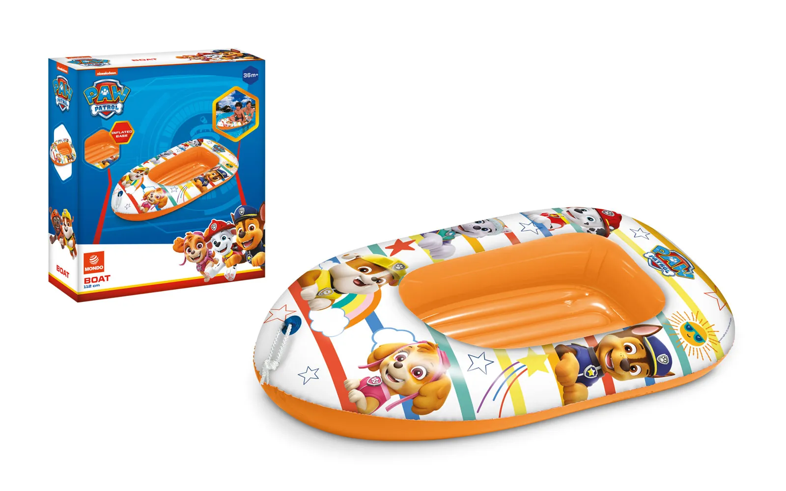 Čamac s motivom Paw Patrol veličine 112 cm s praktičnom užetom za vuču po vodenim površinama.