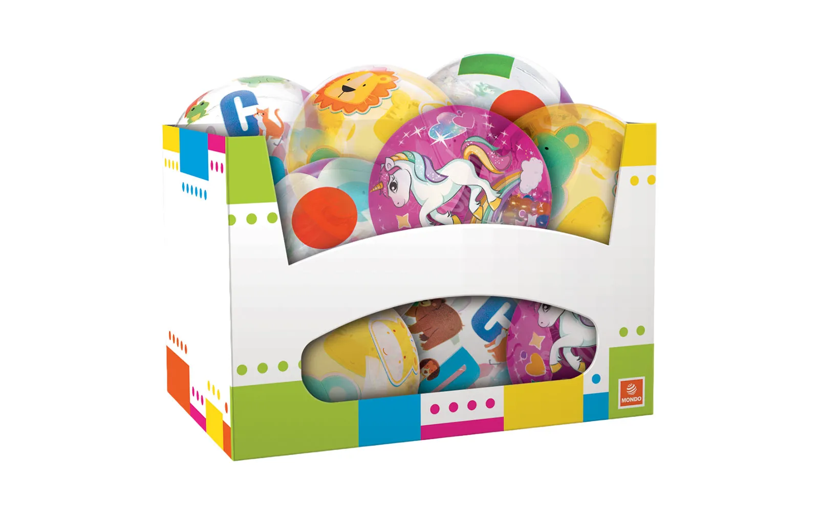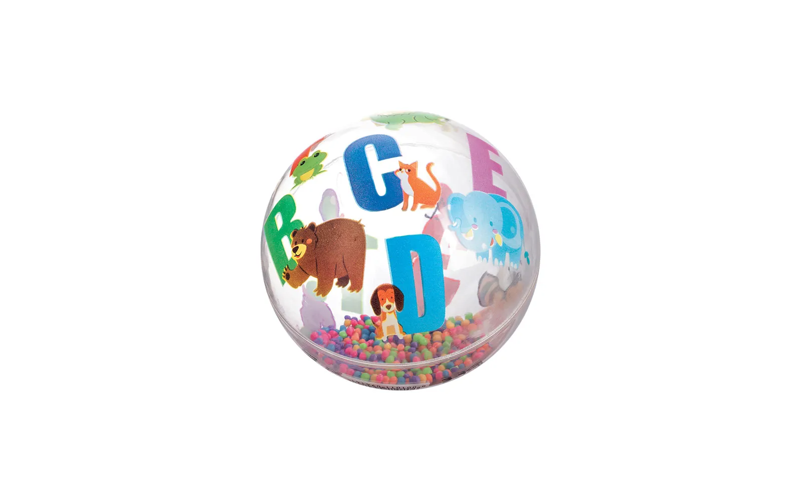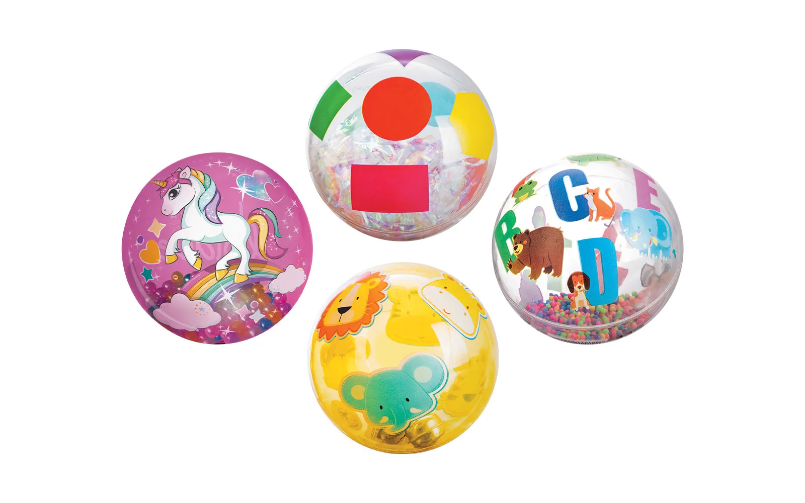 Senzična lopta promjera 10 cm. Lopta unutar može sadržavati na primjer konfete, kuglice ili perle. Dostupno je više različitih stilova.