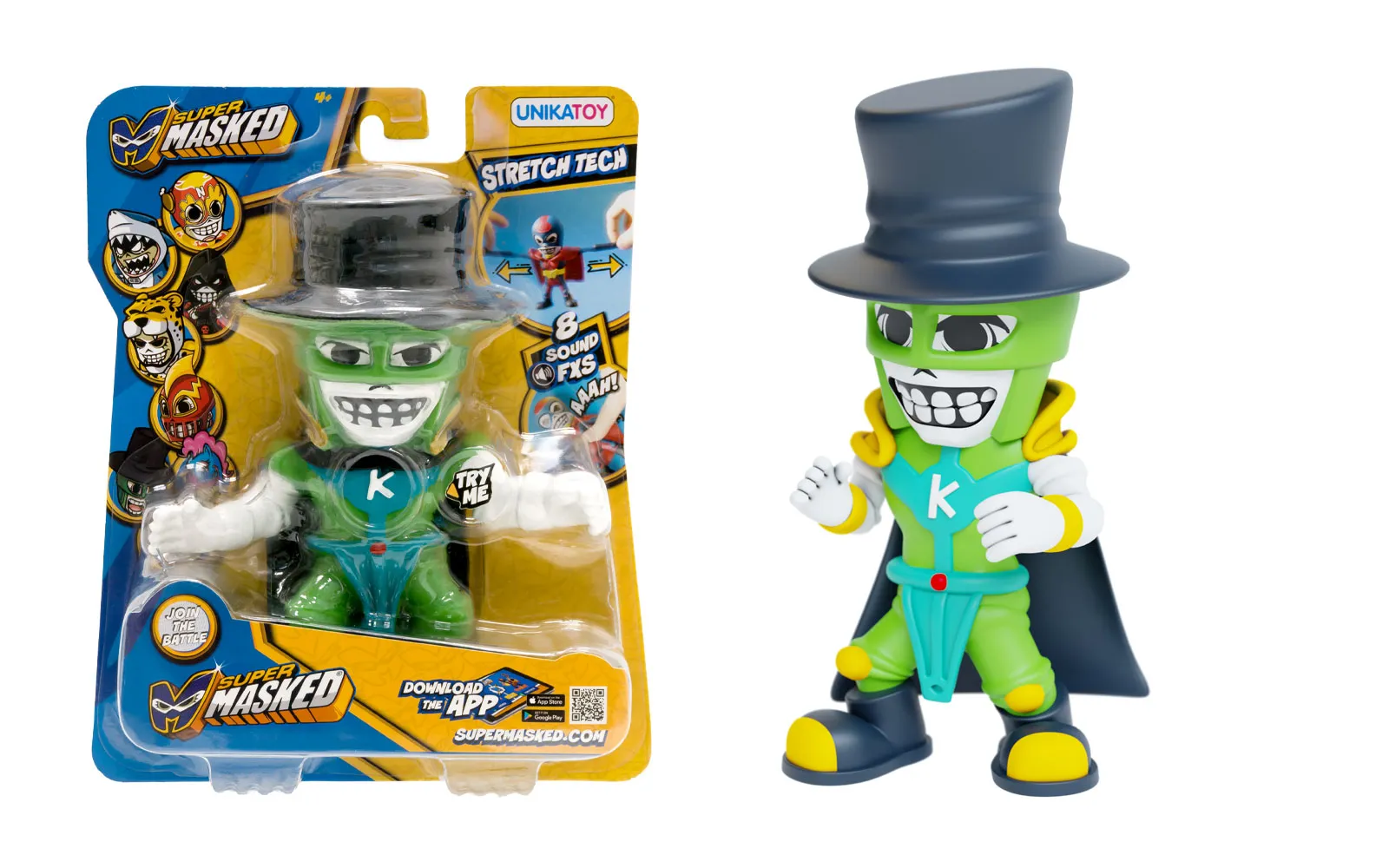 Zabavna rastezljiva čudovišta Super Masked Dr. Kal je pravi odabir za svu djecu koja obožavaju rastezljive igračke. Igračka ima zvučne efekte i različite funkcije - možete je istegnuti ili pritisnuti za izvođenje akcije. Igračka je veličine 13 cm. Čudovište ima različite zvučne efekte.Igračka je izrađena od kvalitetnih materijala i odličan je odabir za dar vašem djetetu. Dr. Kal - ima voditeljske sposobnosti. Kao majstor mađioničarskih vještina može podignuti predmete, izvlačiti stvari iz svojeg mađioničarskog šešira i djelovati s drugim mađioničarskim trikovima. Ima svoju kristalnu kuglu i može predvidjeti budućnost bilo kome.