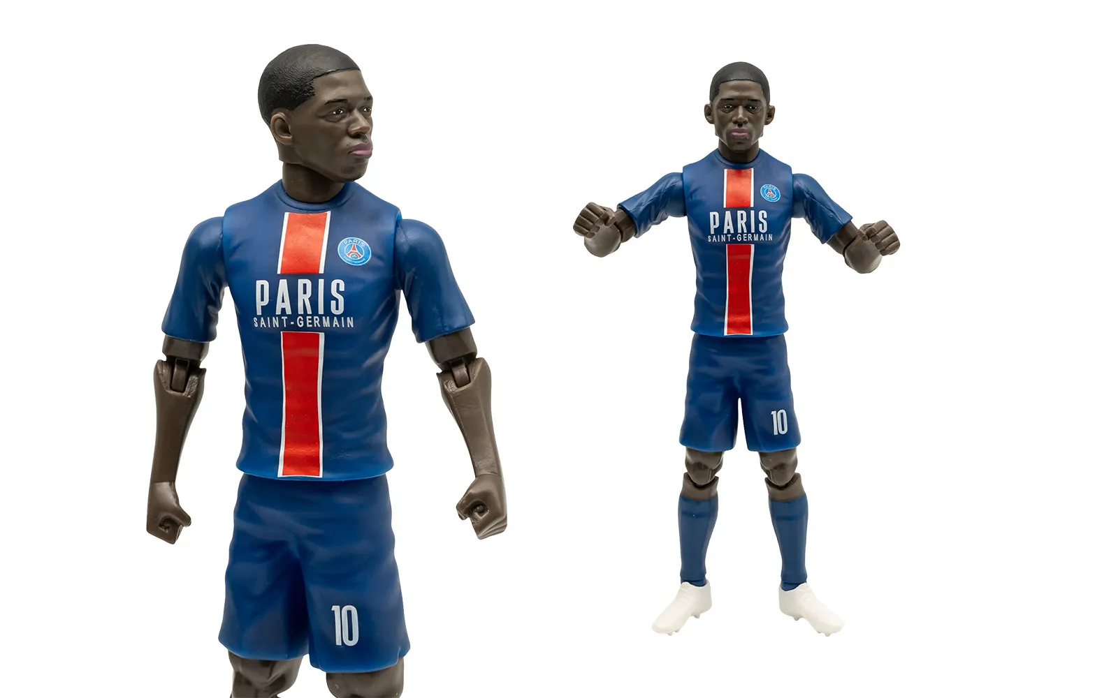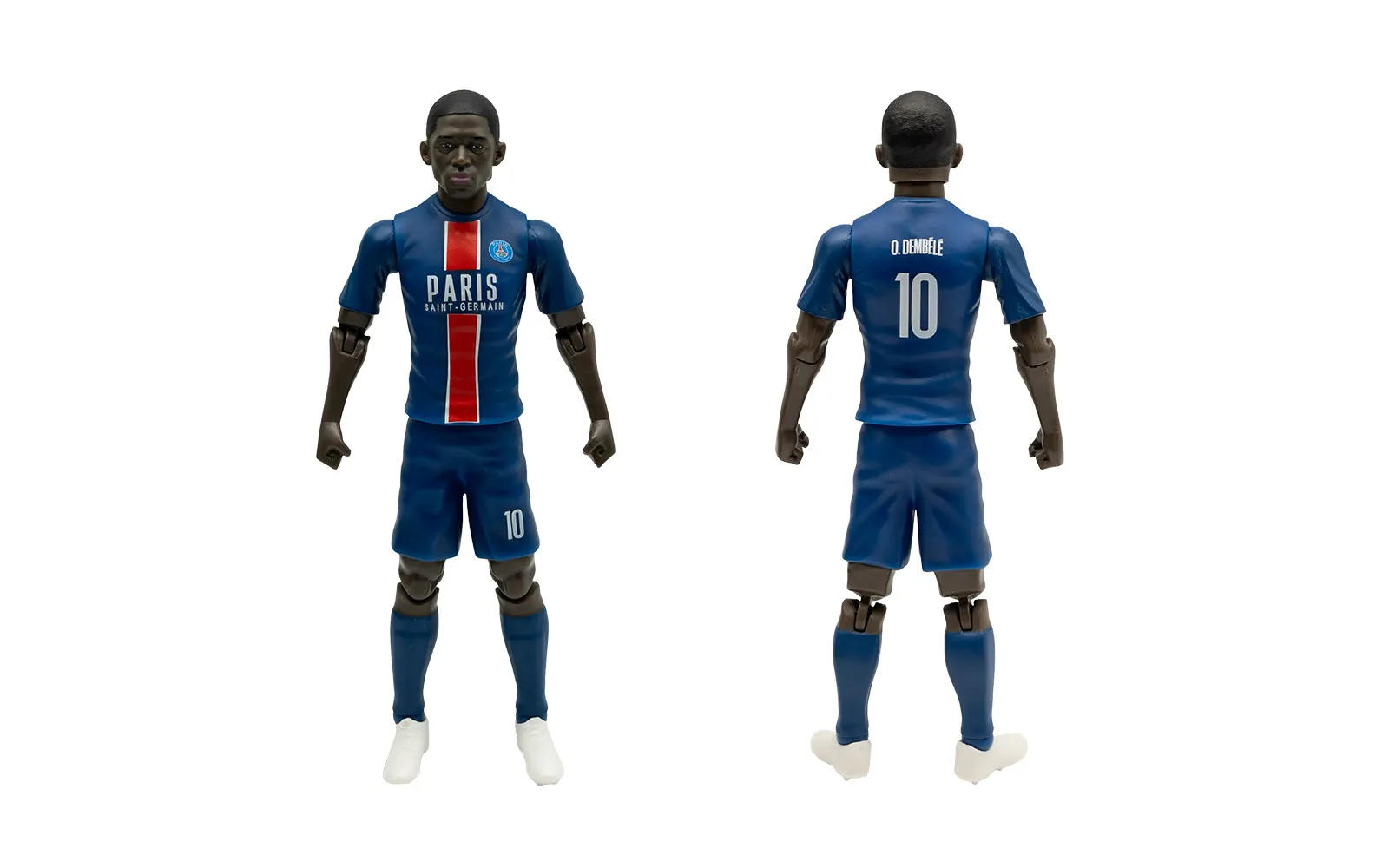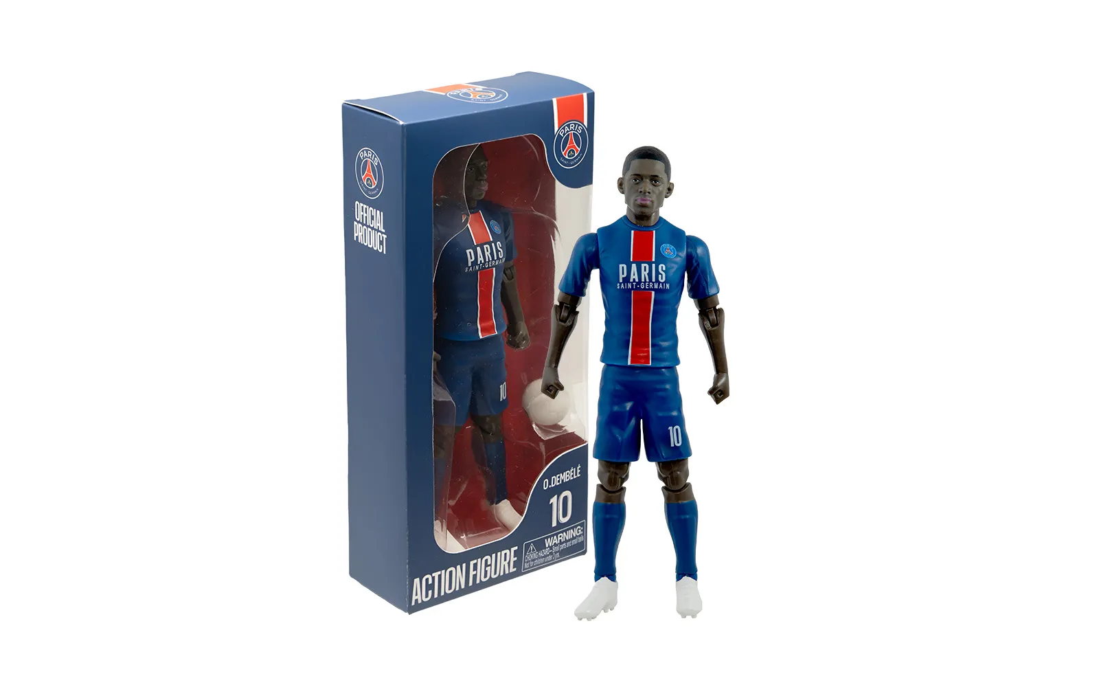 Nogometna figura, Dembele, 20 cm. Otkrijte autentičnu figuru popularnog nogometaša Dembele-a. Figura je visokokvalitetne izrade, ima pokretne udove, nosi broj kluba i uključuje nogometnu loptu.