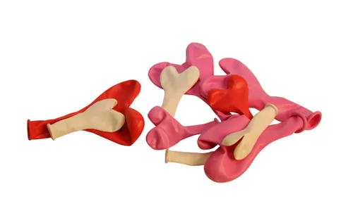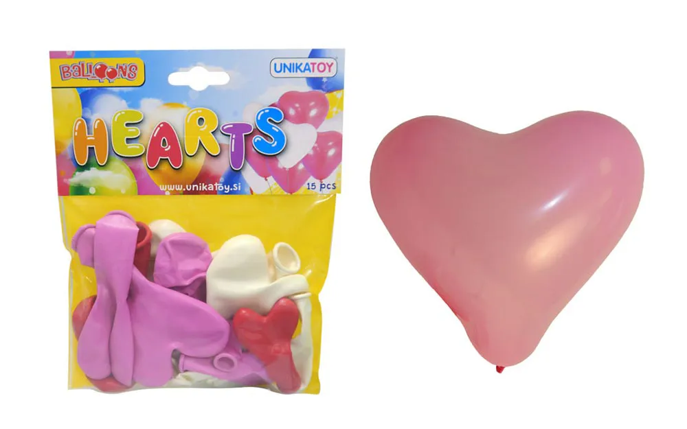 Oblik balona je napuhani srčani balon u crvenoj, roza ili bijeloj boji. U vrećici je 15 balona.
