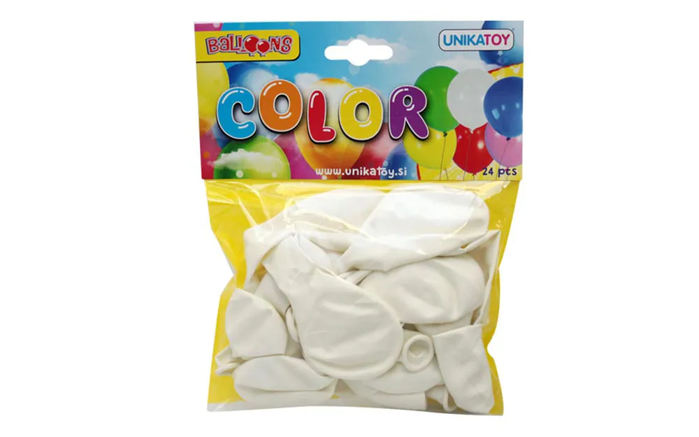 U vrećici je 24 bijelih balona. Napuhaj balone, koristi ih za dekoraciju na zabavi ili se jednostavno igraj s njima.