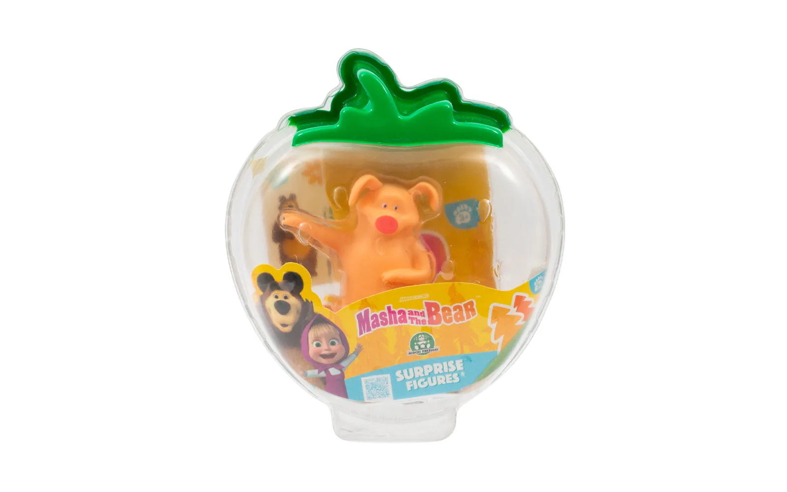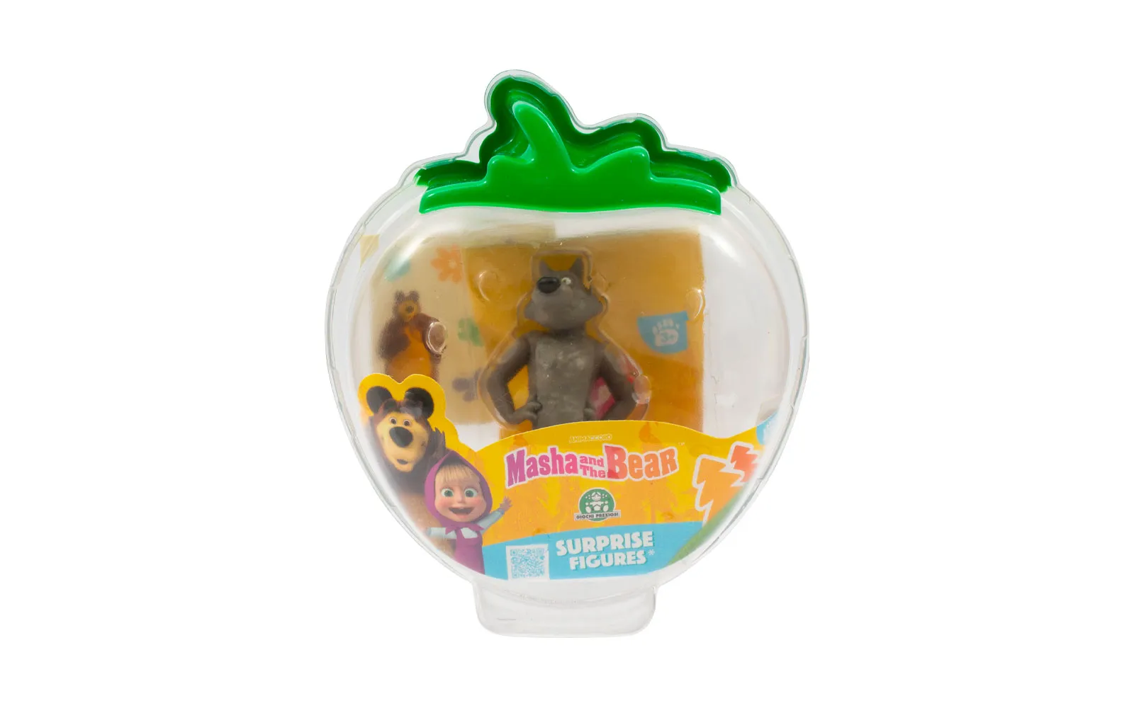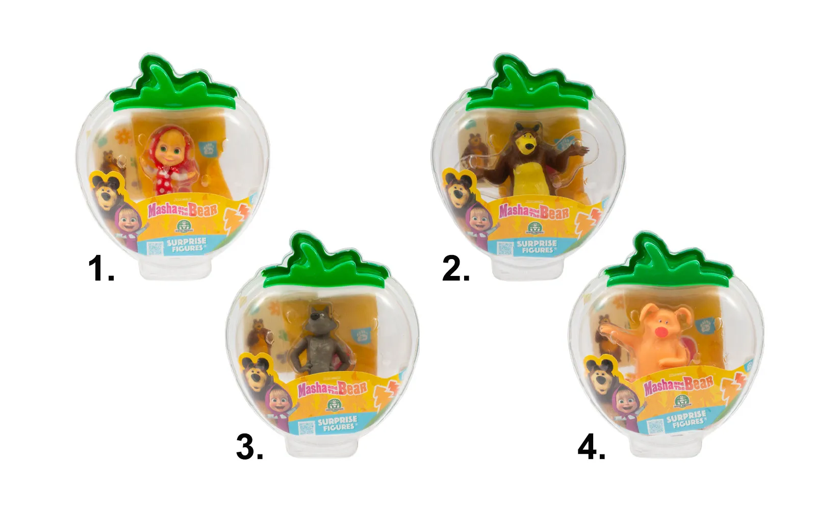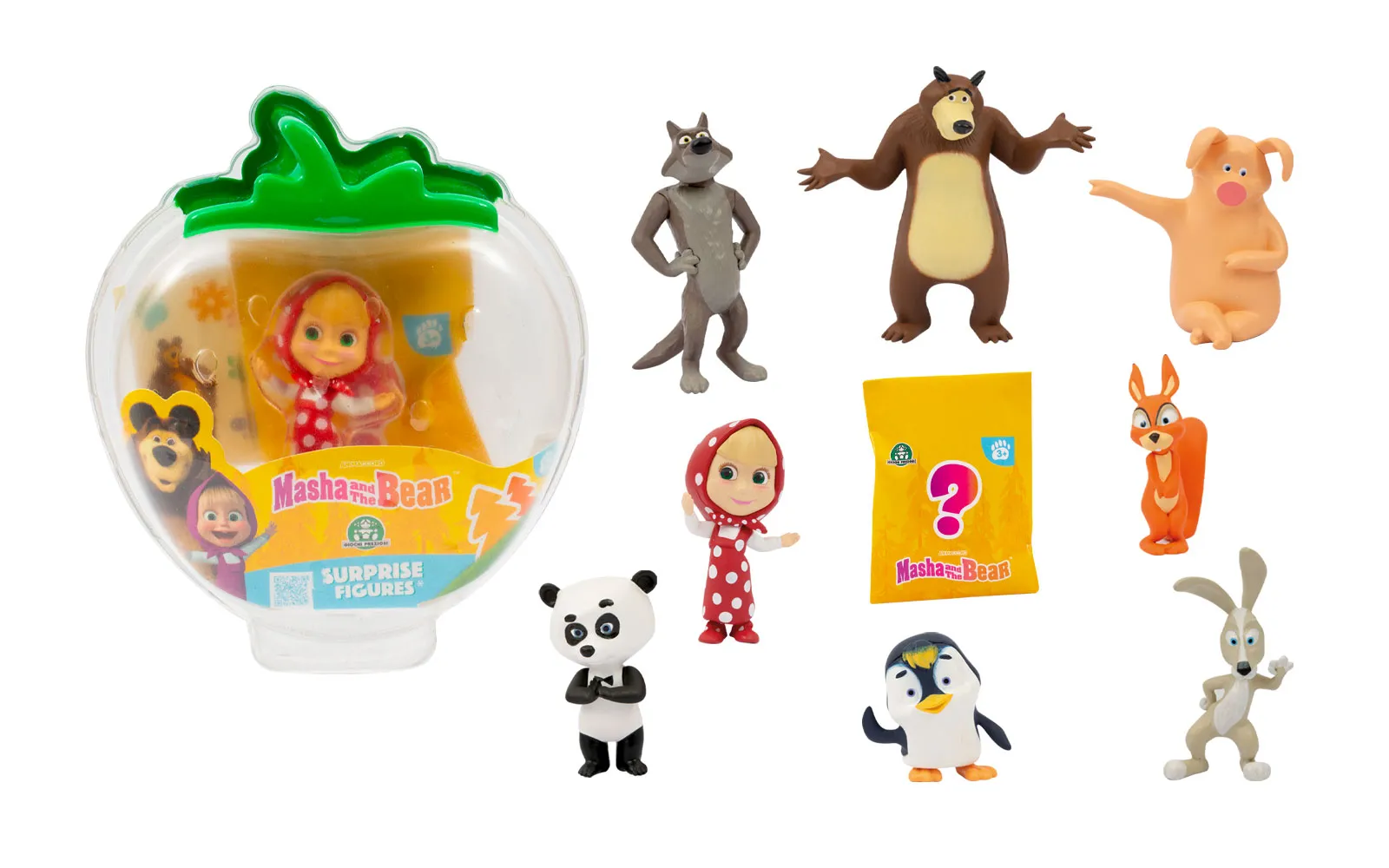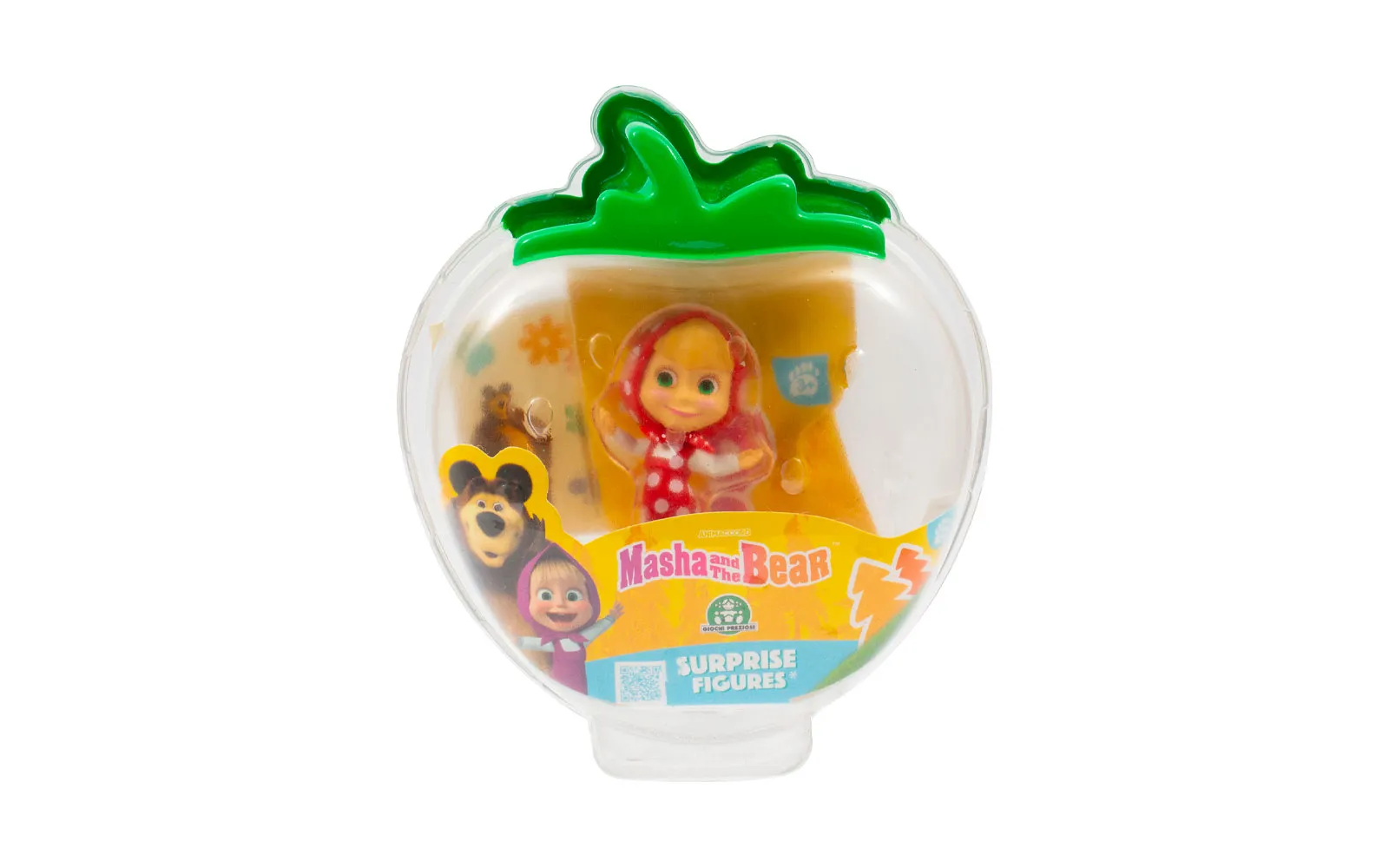 Prozirna kutijica s junakom popularne animirane serije Maša i Medvjed i vrećicom iznenađenja u kojoj se skriva Mašin prijatelj. Set također sadrži ljupke naljepnice s likovima.