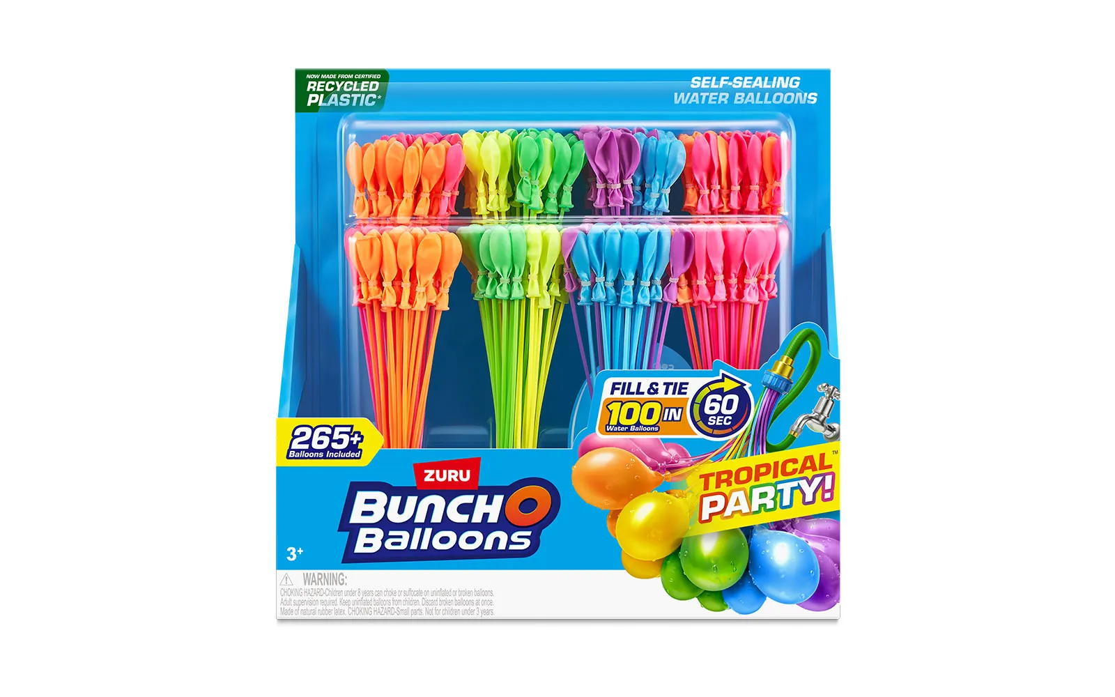 Napunite i zavežite sto vodenih balona u manje od minute! Tropski set Bunch O Balloons sadrži osam svežnjeva vodenih balona u različitim bojama koji se sami vežu kada se napune vodom. Set sadrži 265 vodenih balona koji su prirodni jer su biorazgradivi, a biorazgradivi su i prstenovi oko vodenih balona. Kako bi proizvod bio još ekološki prihvatljiviji, u proizvodnji je korišten reciklirani materijal.
