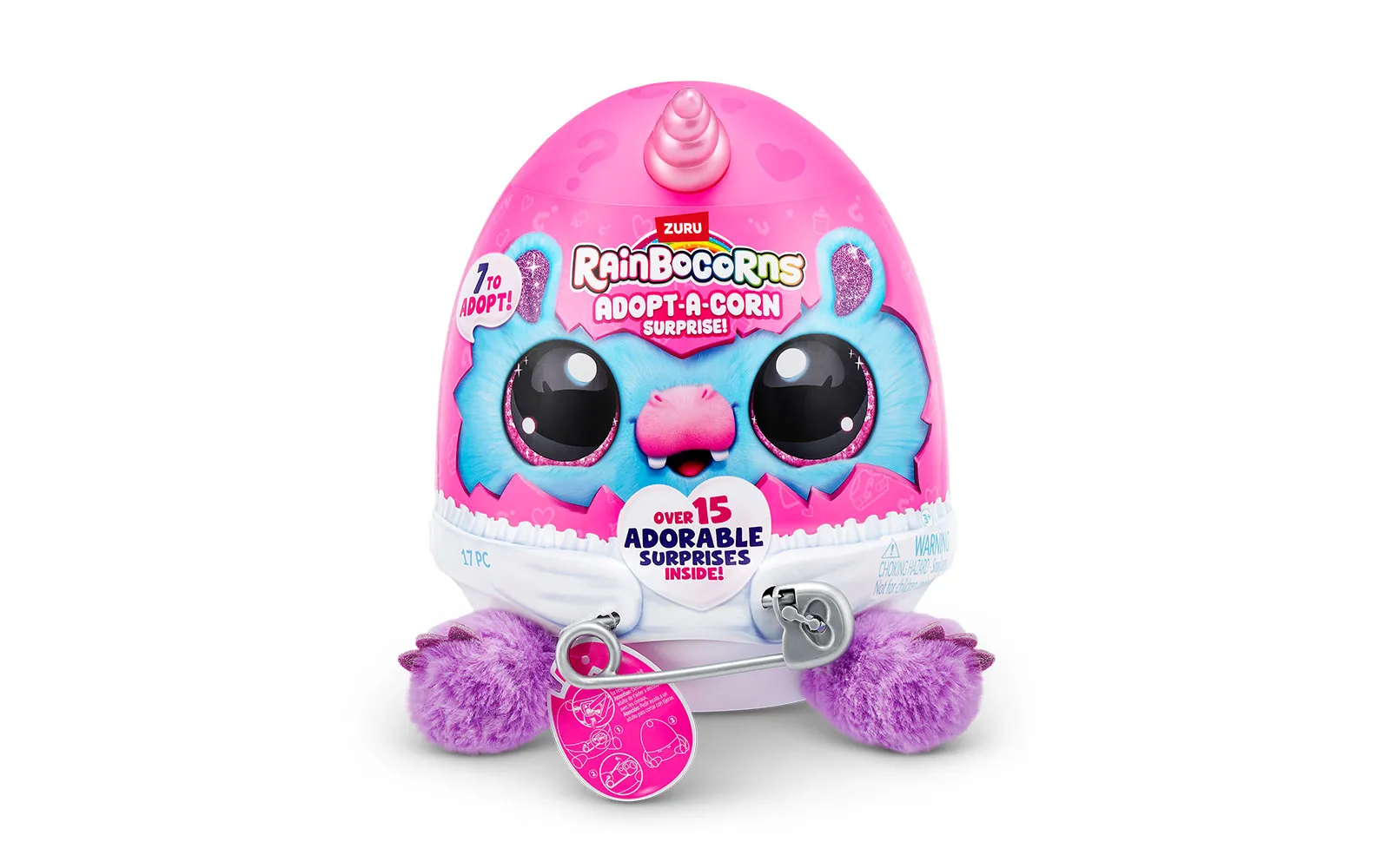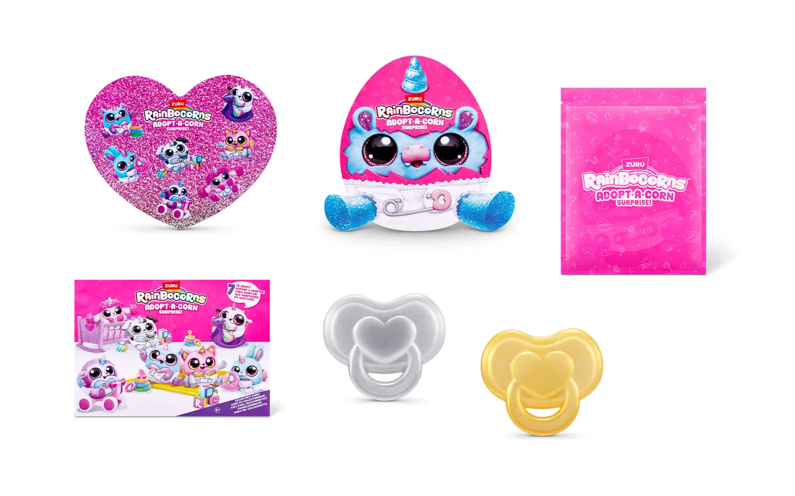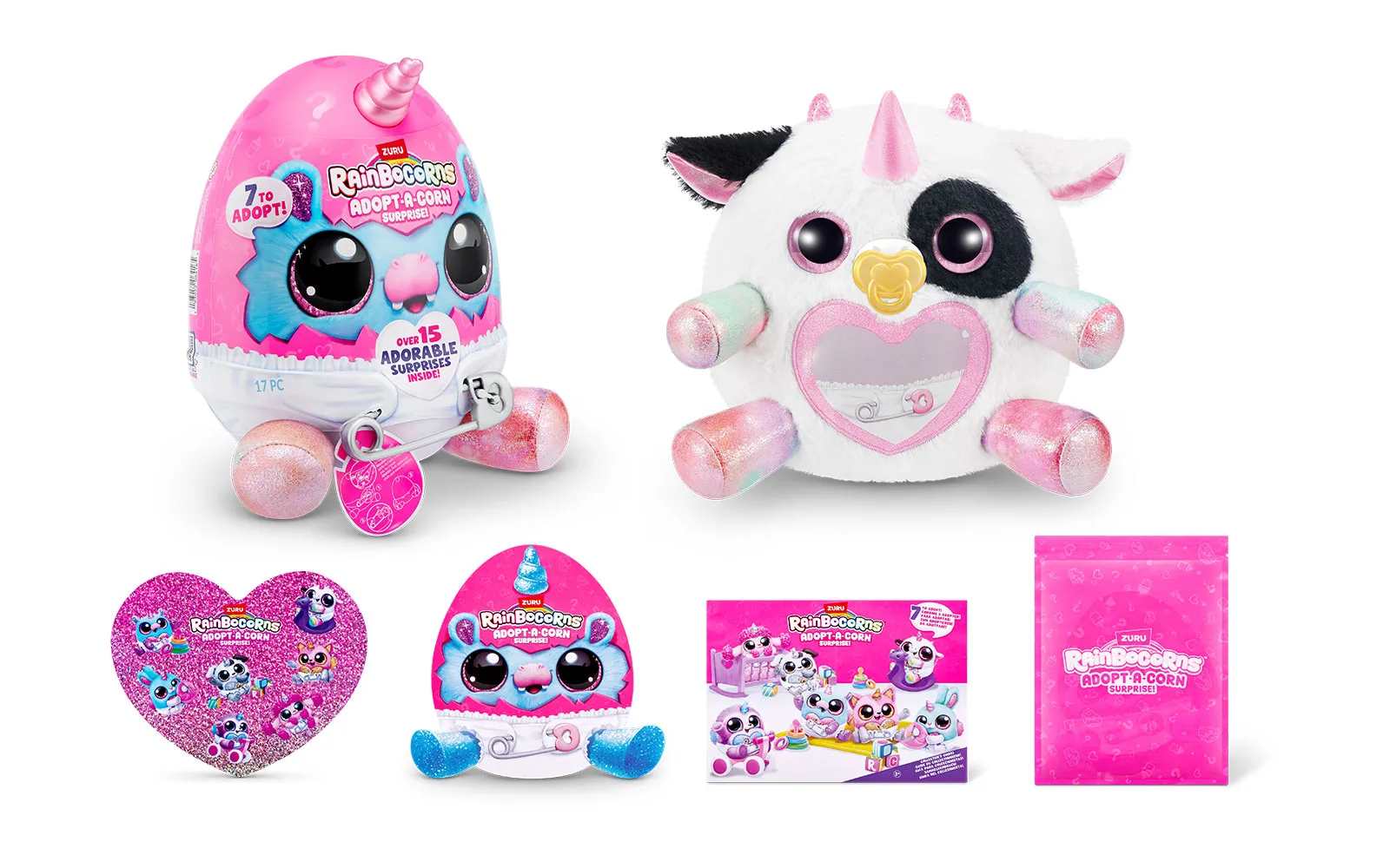 Set sadrži 1x Rainbocorns Adopt-a-corn jaje iznenađenja, 1x Adopt-a-corn plišanu životinjicu, 1x jaje za pohranu pelena, 1x dude, 1x potvrdu o usvajanju, 10x naljepnica, 1x peel and reveal srce, 1x kolekcionarski vodič. Moguće je skupiti 7 različitih plišanih životinja Rainbocorns Adopt-a-corn. Svako jaje u sebi skriva više od 15 prekrasnih iznenađenja.