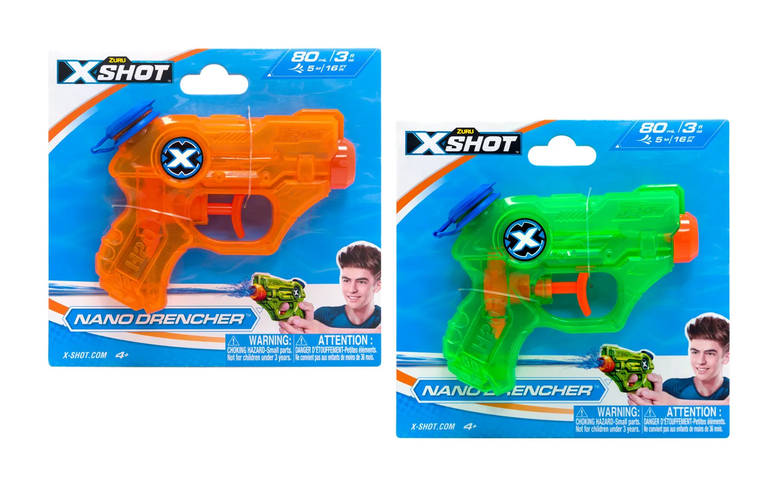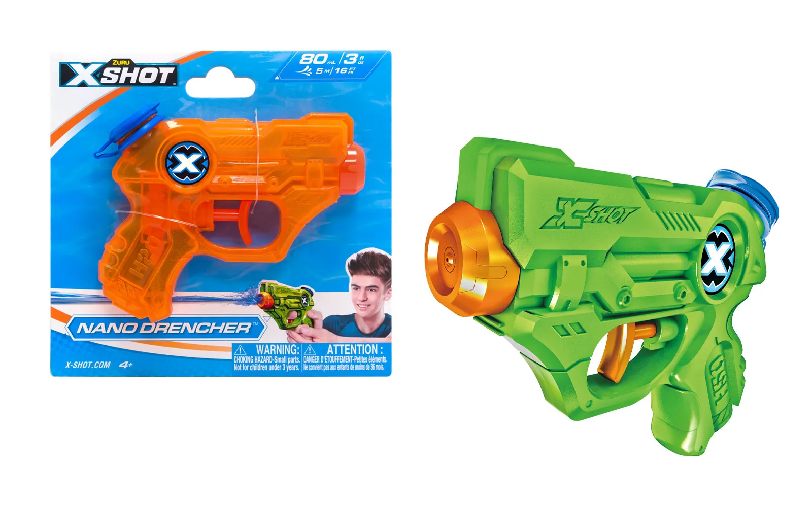 Vodeni pištolj Nano Drencherl, X-Shot, renomirane marke Zuru. Vodeni pištolj dug je 13 centimetara sa kapacitetom od 80 ml, a punjenje je jednostavno i zabavno - otvori poklopac, uroni ga u vodu, zatvori poklopac i spreman si za vodenu zabavu - sve to u samo jednoj sekundi! Vodeni mlazovi dosežu čak do 5 m!