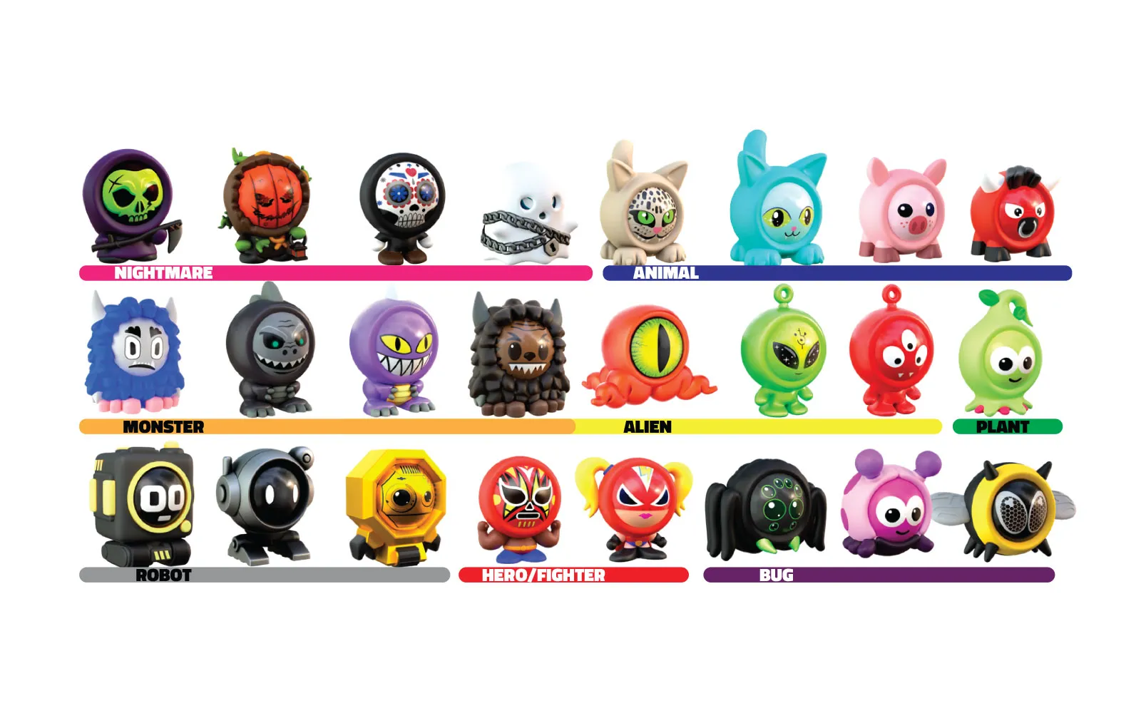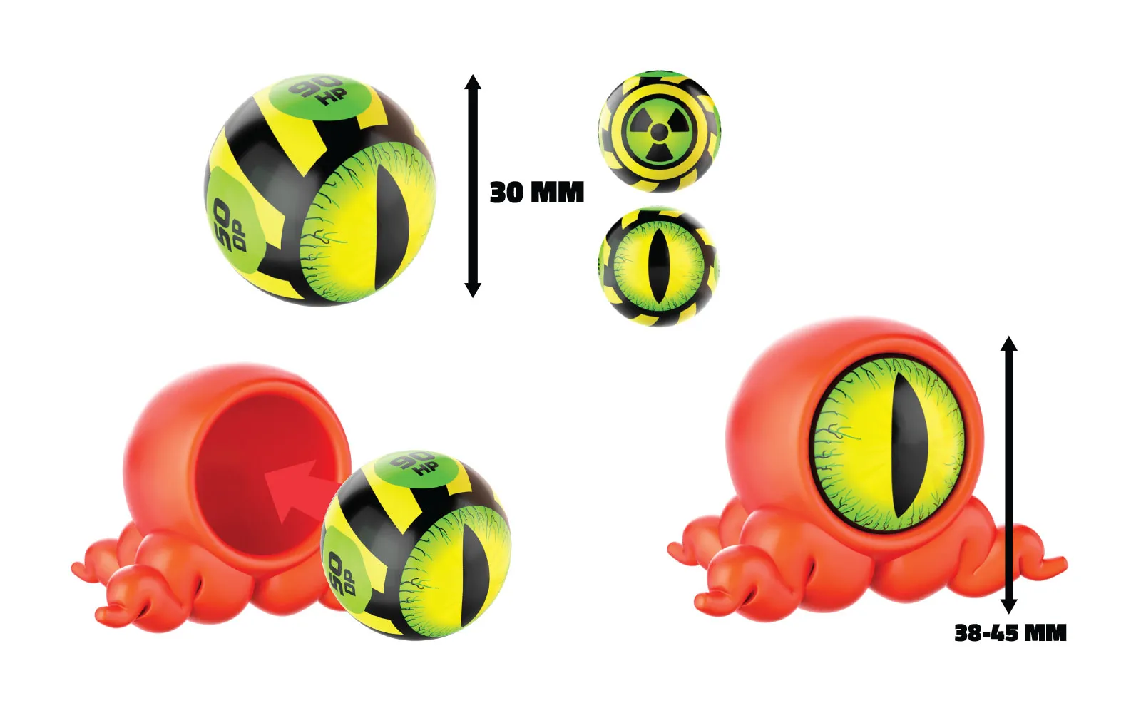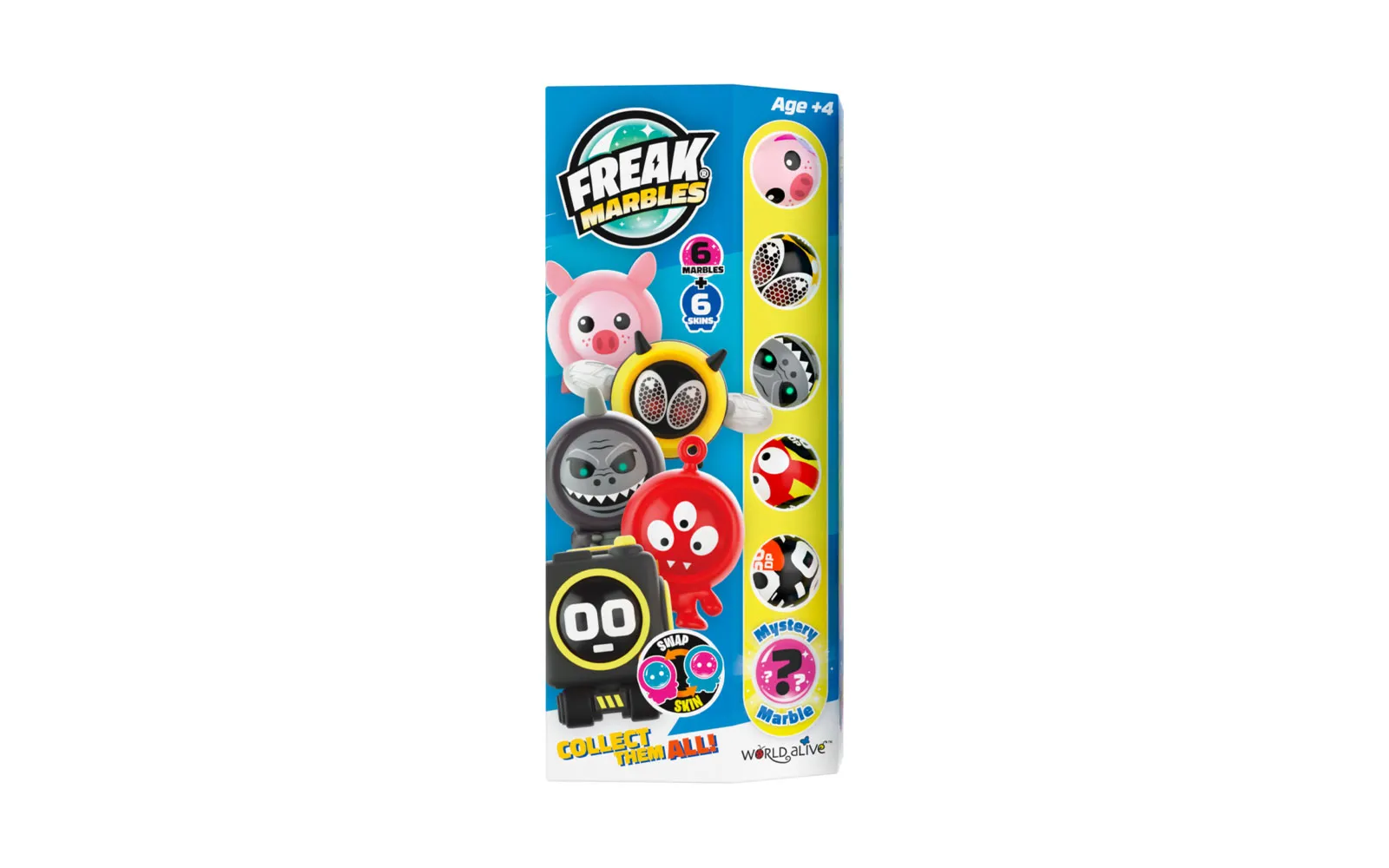 Kutija sadrži 6 kuglica Freak Marbles pohranjenih u kutiji, od toga 1 rijetku\/mystery kuglicu Freak Marbles. Svaka kuglica ima i svoju masku koja predstavlja lik. Upoznajte sve likove - možete skupiti 25 likova\/karaktera, među kojima su i 4 rijetka. Igra s kuglicama znači cilj je pobijediti protivnikove kuglice tako da ih eliminirate i tako postignete najveći broj bodova na bojištu. Svaka kuglica ima na stražnjoj strani simbol koji prikazuje njegovu moć.