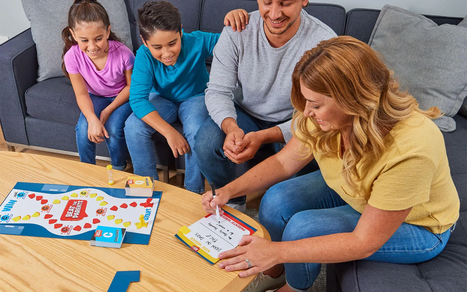Ovdje je zabavna igra Djeca protiv roditelja! Djeca protiv roditelja suprotstavljaju djecu roditeljima u zabavnom, akcijskom obračunu izazova. Svaki tim upisuje okladu prije početka utakmice. Što ćeš učiniti ako izgubiš? Iznesi smeće? Kupili ste pizzu za sve? Djeca i roditelji različite su dobi pa svaka generacija dobiva svoj skup pitanja. Igra je prikladna za 2 do 6 igrača od 8 i više godina. Igra uključuje sve što vam je potrebno za pravu zabavu: - 200 kartica, -1 ploča za igru, - 1 pješčani sat, - 2 pokretne figure, -1 kopča za fiksiranje flomastera, -1 marker za suho brisanje, -1 ploča za klađenje, - kartonski stalak i upute.
