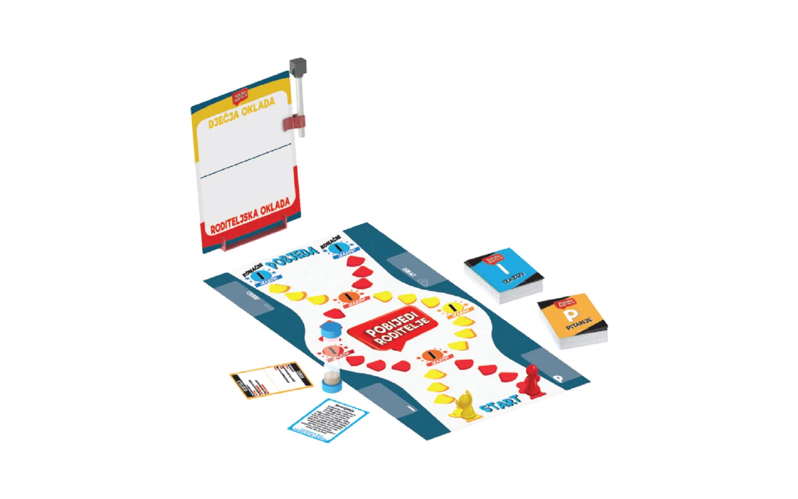 Ovdje je zabavna igra Pobijedi roditelje - nadmaši roditelje! U Pobijedi roditelje djeca se igraju protiv roditelja u zabavnoj, akcijskoj bitci izazova. Svaka ekipa napiše opkladu prije početka igre. Što ćete raditi ako izgubite? Iznošenje smeća? Kupovanje pizze za sve? Djeca i roditelji su različitih dobi, tako da svaka generacija dobiva svoj niz pitanja. Igra je pogodna za 2 do 6 igrača, starijih od 8 godina.Igra uključuje 200 kartica, 1 igraću ploču, 1 pješčani sat, 2 pokretne figure, 1 spajalicu za marker, 1 marker za suho brisanje, 1 ploču za opklade, 1 stalak od kartona i upute.