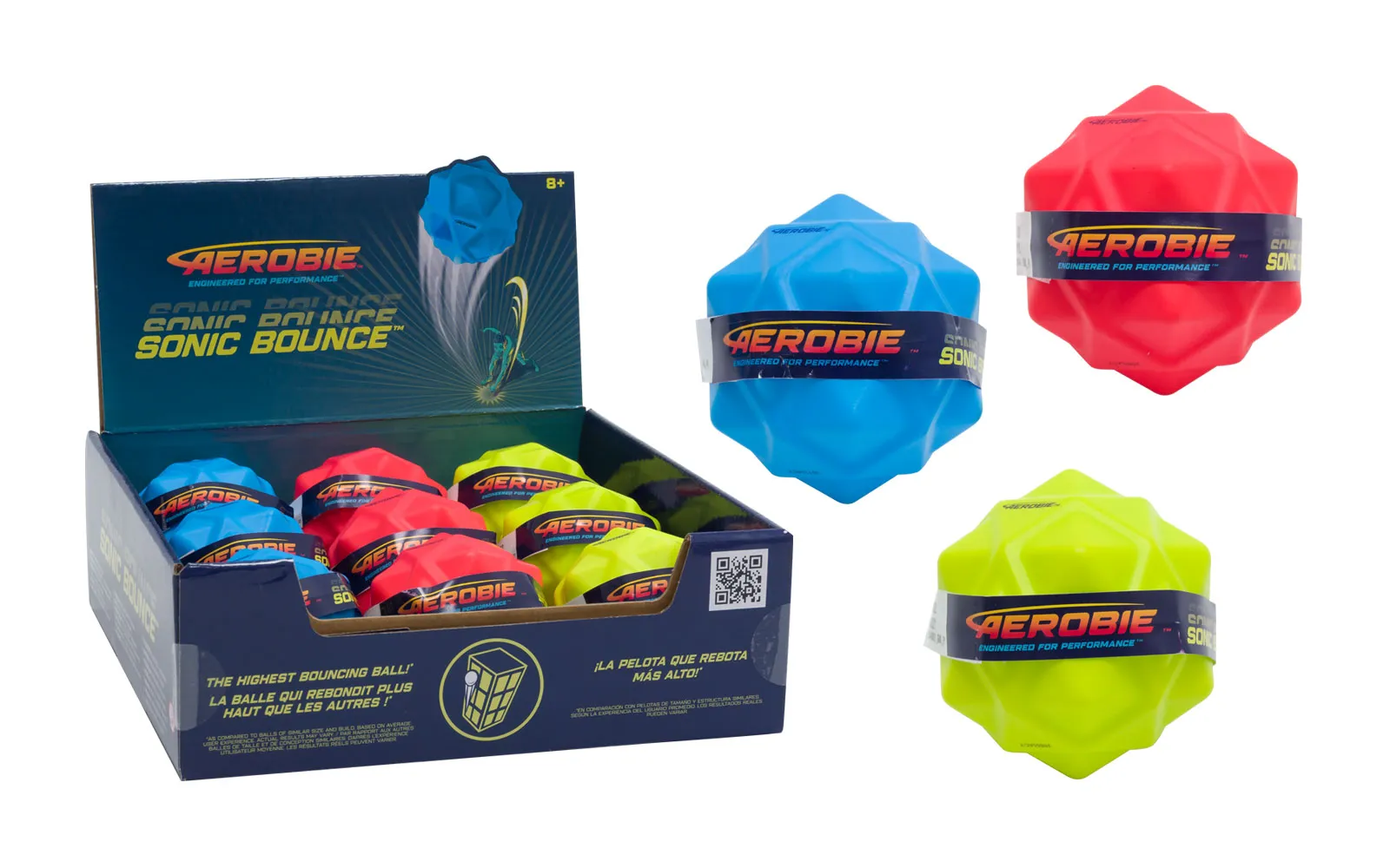Skakave loptice, kako smo ih zvali, oduvijek su bile jedna od najdražih igračaka djece. Nikada nisi znao u kojem će smjeru odbiti, kako visoko će odskočiti i gdje će sletjeti. Sve te osobine su kod lopte Aerobie sonic bounce vrlo nepredvidive! Lopta Aerobie sonic bounce će odbiti gotovo do stratosfere, također se zbog svog jedinstvenog oblika može odbiti u bilo kojem smjeru. Dostupno u crvenoj, žutoj ili plavoj boji.