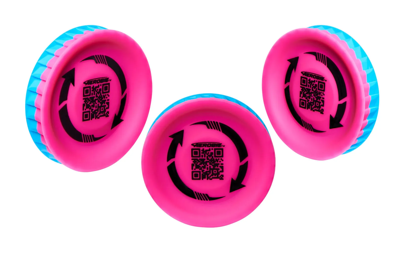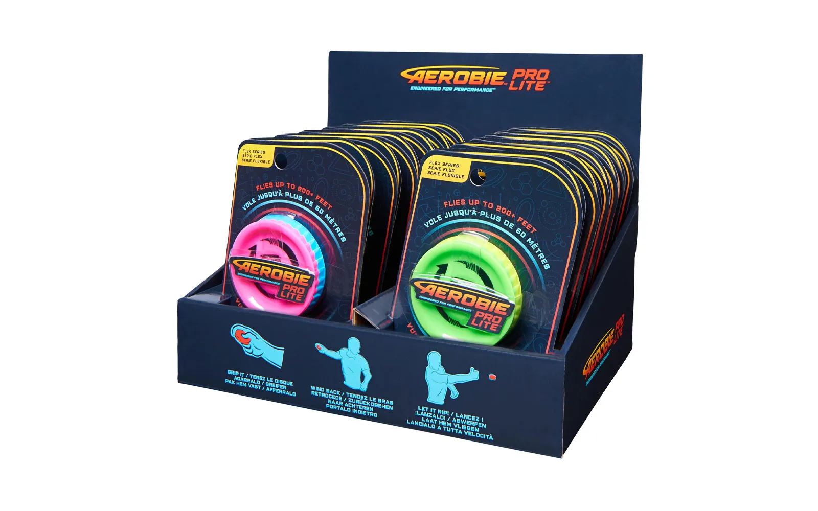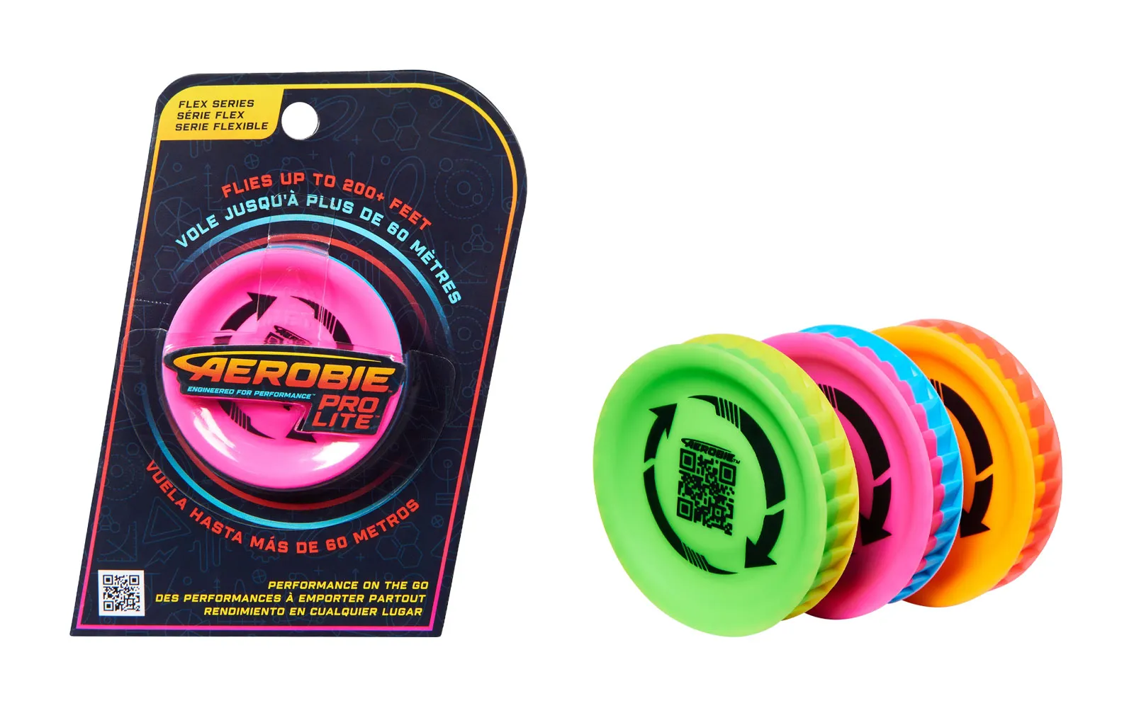 Leteci obruč Aerobie Pro Lite, Spin Master. Leteci obruč Aerobie Pro Lite ima izvrsne karakteristike letenja, leti ravno i 2x dalje od običnih frizbija. Namijenjena je bacanju u manjim prostorima (parkovi, igrališta, plaže, kampovi), a preporučljiva je za djecu stariju od 5 godina. Zahvaljujući svojoj jedinstvenoj konstrukciji, letjelica ravnomjerno lebdi u zraku - kao da leti među nevidljivim slojem leda. Ovaj učinak radi i na različitim brzinama bacanja. Brid letjelice izrađen je od mekše gume, što znači da se može udobno uhvatiti i bez oštećenja lako odbiti od prepreka. Igranje s letjelicom namijenjeno je paru ili skupini ljudi - ali je zabranjeno bacati prema očima, licu drugih osoba ili životinja. Bacajte je samo svojem hvataču u dobro osvijetljenom području bez prepreka. Ne bacajte oštećenu ili promijenjenu letjelicu jer to može dovesti do ozljeda.