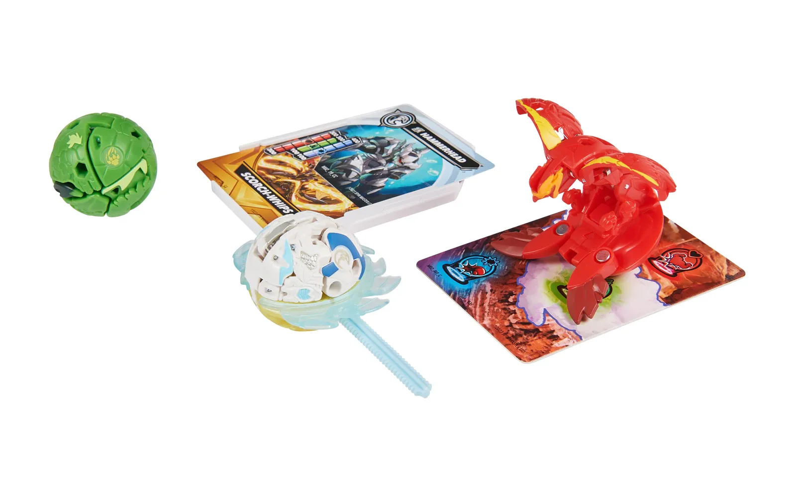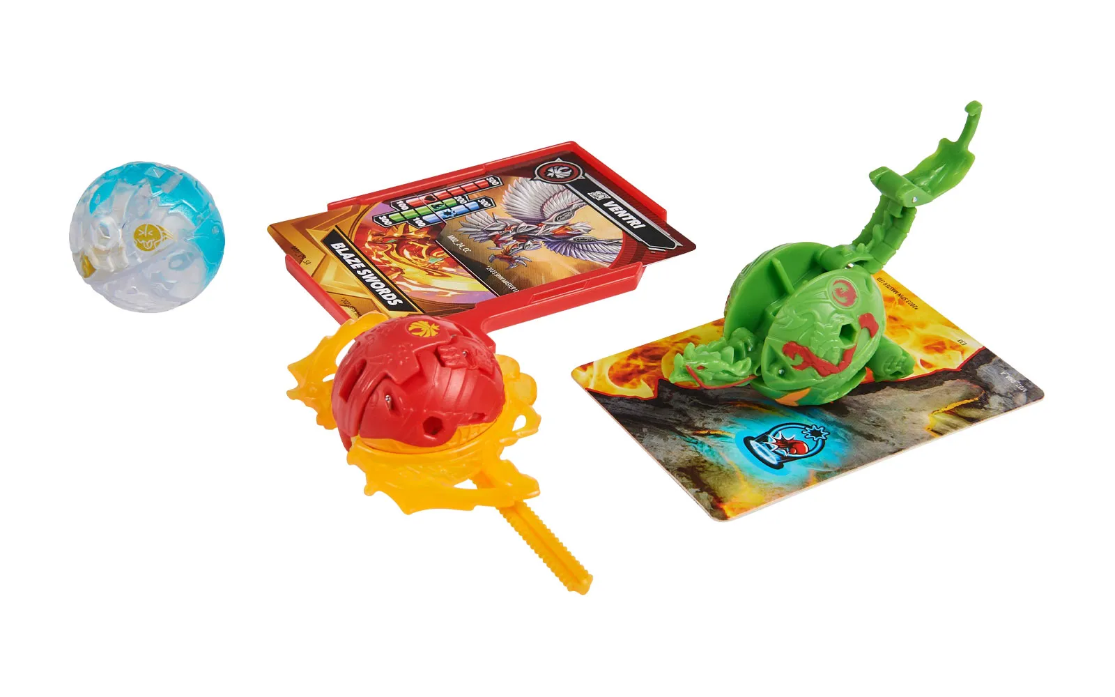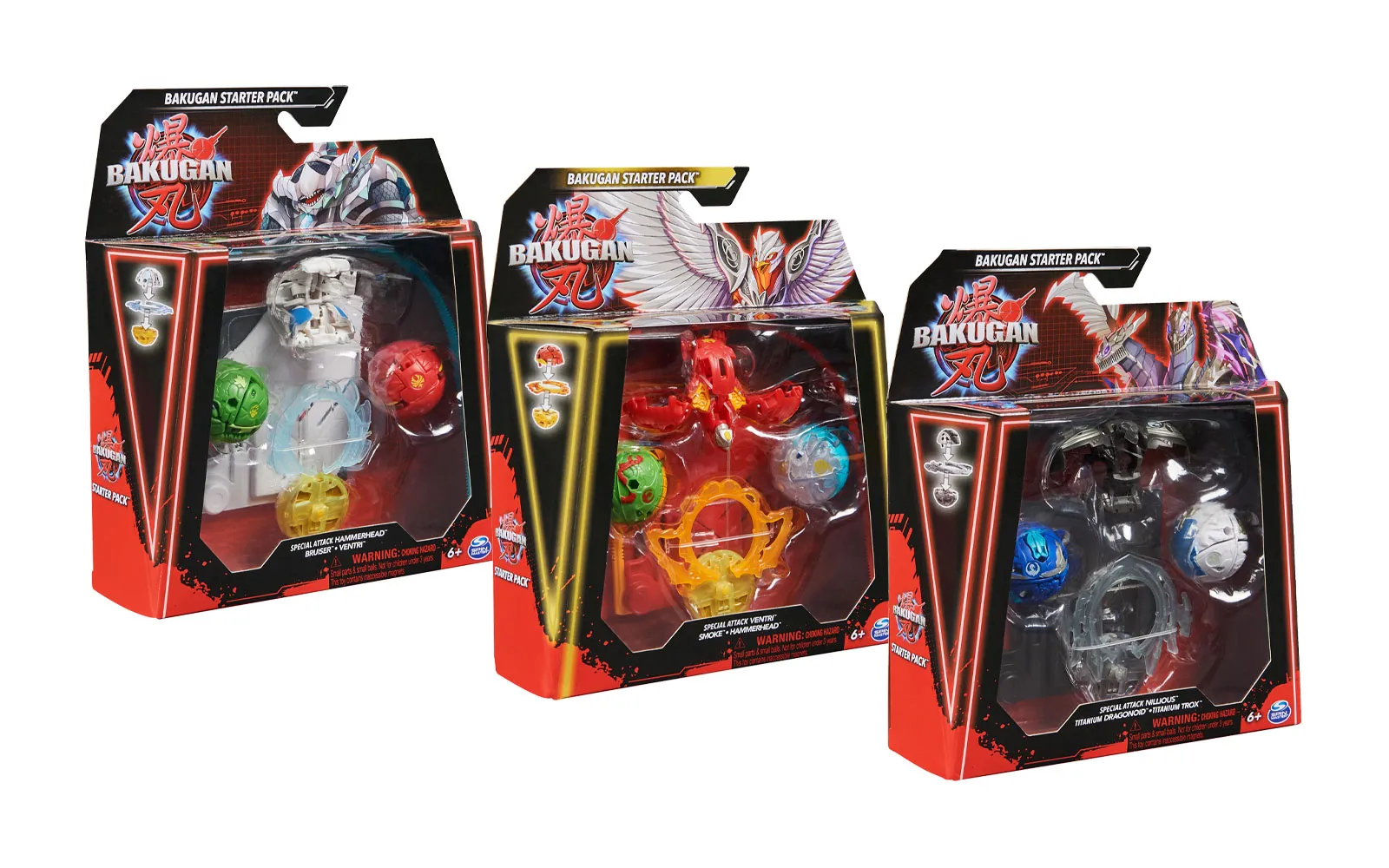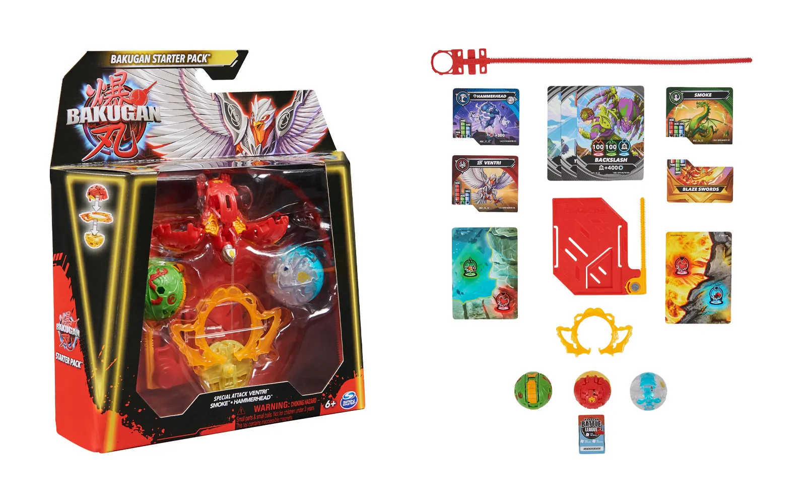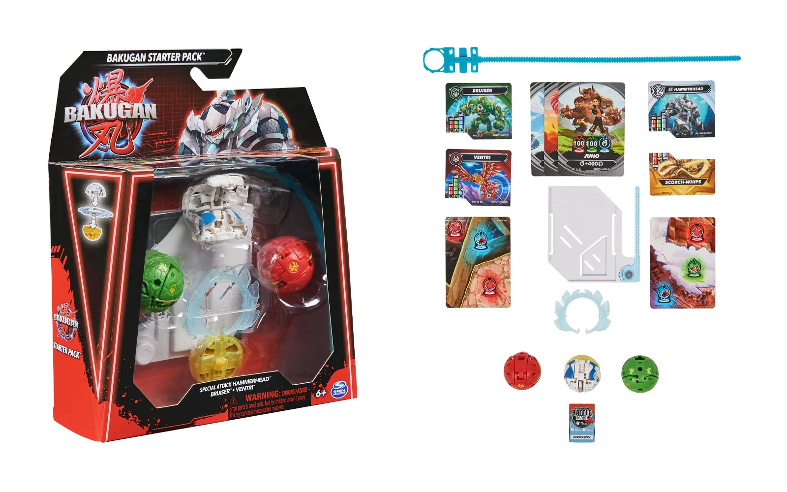 Bakugan Starter Pack set sadrži 3 različita Bakugana i prava je senzacija, jer se Bakugan iz kuglice pretvara u zadivljujuće mitološko biće. Bakugan se, kada dođe u dodir s magnetskom pločom, otvori i pretvori u lik. Obične Bakugane ćete kotrljati u arenu, dok se posebne sa priloženom karta za poteze zavrti i postavi u arenu. Dostupna su tri različita seta s 3 različita Bakugana - Special Attack sa Bakuganima Ventri, Smoke, Hammerhead, set Special Attack sa Bakuganima Hammerhead, Bruiser, Ventri te set Special Attack sa Bakuganima Nillious, Titanium Dragnoid i Titanium Trox. Hammerhead je Bakugan sličan morskim psima kladivašima i partner je Bakugana Thunder Cruncha. Ventri je Bakugan sličan pticama grabljivicama i partner je Bakugana Mie Ono. Smoke je Bakugan sličan zmaju i član je klana zmajeva. Bruiser je goveđi Bakugan i partner je Bakugana Juna Reyes-a. Nillious je hibridni zmajevi Bakugan, koji je zaštitnik Bakugana Magnusa Blacka. Titanium Dragnoid je Bakugan nastao iz Blitz Dragonoida i partner je Infinity Heliosa i Taylean-a. Titanium Trox je Bakugan sličan tiranosaurusu. Set sadrži: 1 Special attack Bakugan, 1 prsten moći, 2 Bakugana, 1 karticu sa potezima, 2 vrata kartice, 3 kartice likova, 1 karticu sa specijalnim napadima, 3 kartice razbijača. Proizvod nije prikladan za djecu od 0 do 3 godine i preporuča se za djecu od 6. godine starosti nadalje.