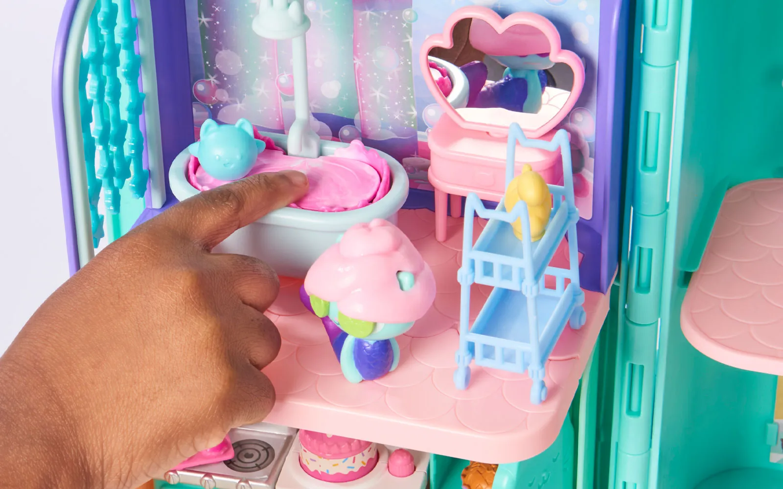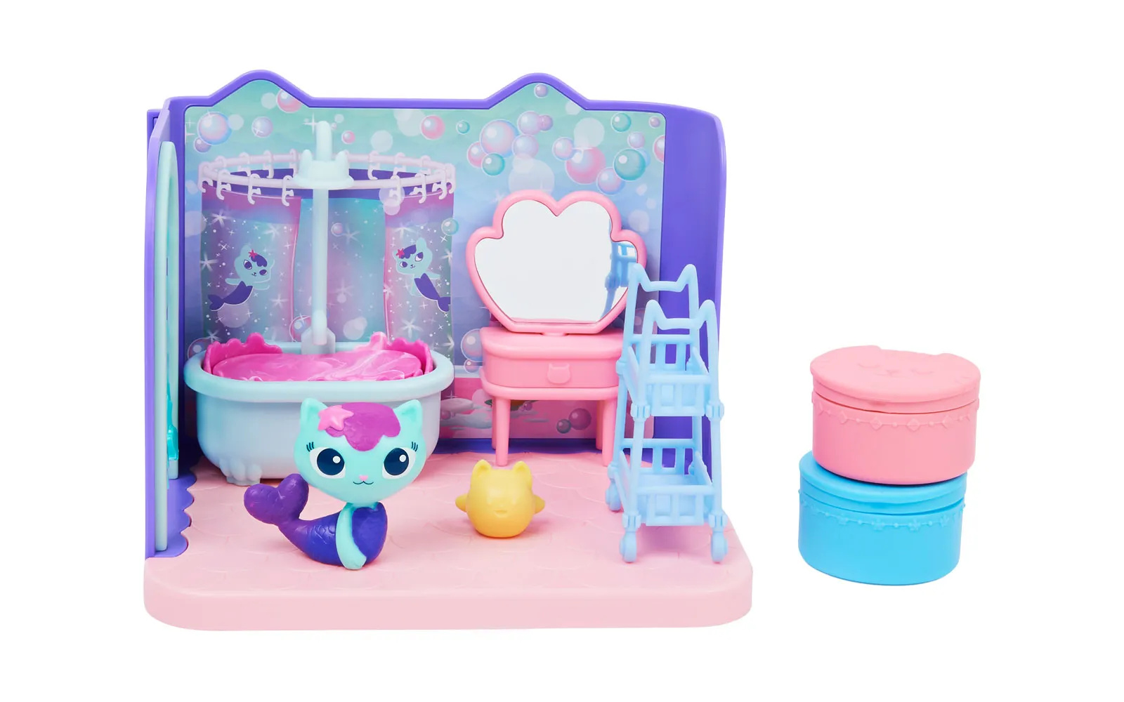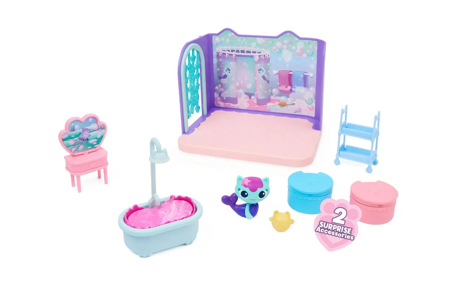 Kupaonica, Gabby’s dollhouse, Spin Master! PREKRASAN DODATAK VAŠOJ LJUDSKOJ KUĆNOJ KOLEKCIJI! Oživite svijet Gabby's Dollhouse sa svime što vam je potrebno za osvježavajući trenutak u kupaonici! Ovaj set nudi sve potrebne elemente za stvaranje savršenog prostora za njegu i opuštanje vaših likova. KUPAONSKA OAZA ZA SVE VAŠE FIGURE: U kupaonici možete svojim likovima priuštiti opuštajuću kupku u kadi, sa stolićem za uređivanje i stalakom za dodatke. Mercat, koji je dio seta, pružit će još više zabave tijekom igre. SADRŽAJ: 1 figura Mercat, 1 pokrivalo, 1 kada, 2 transportne kutije, 1 stolić za uređivanje, 1 stalak. Kupaonica Gabby's Dollhouse odvest će vašu igru u nove dimenzije zabave!