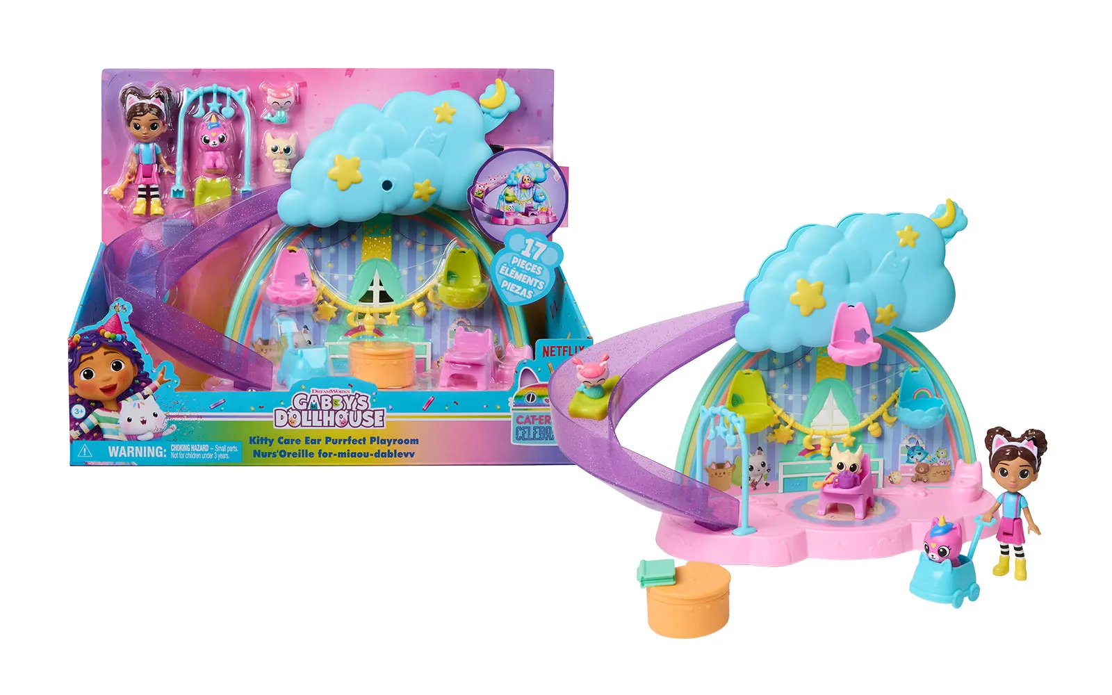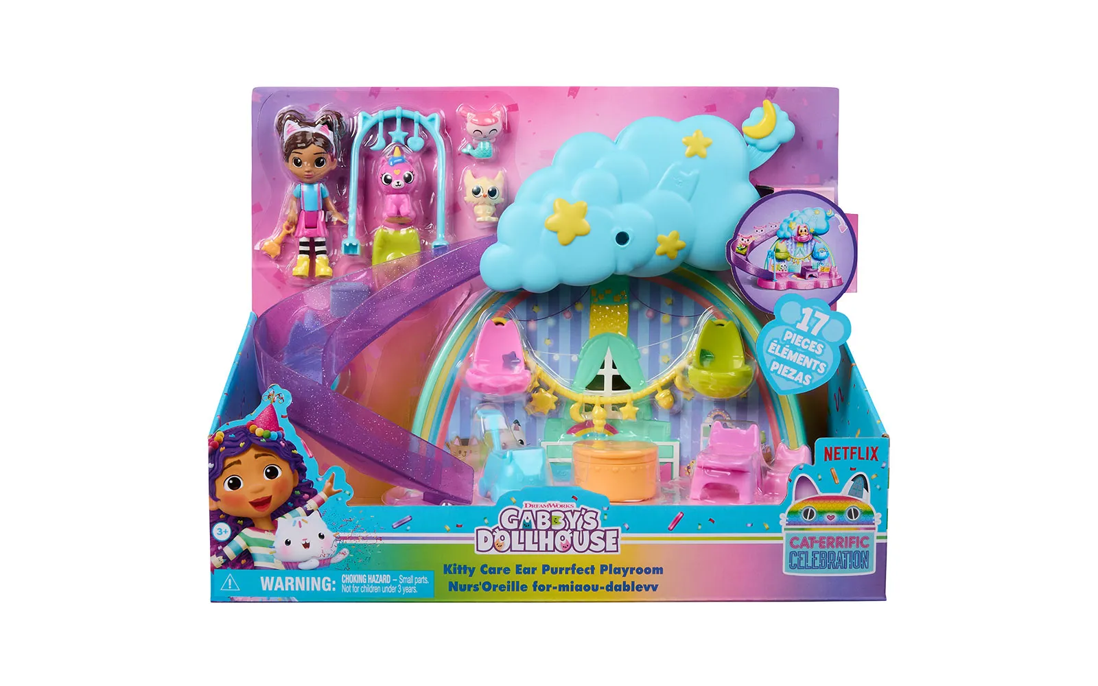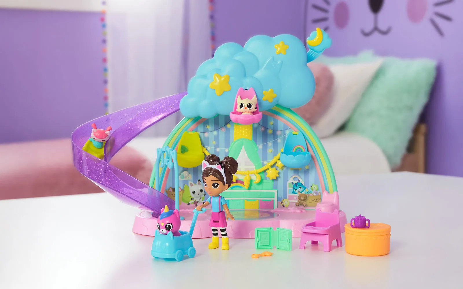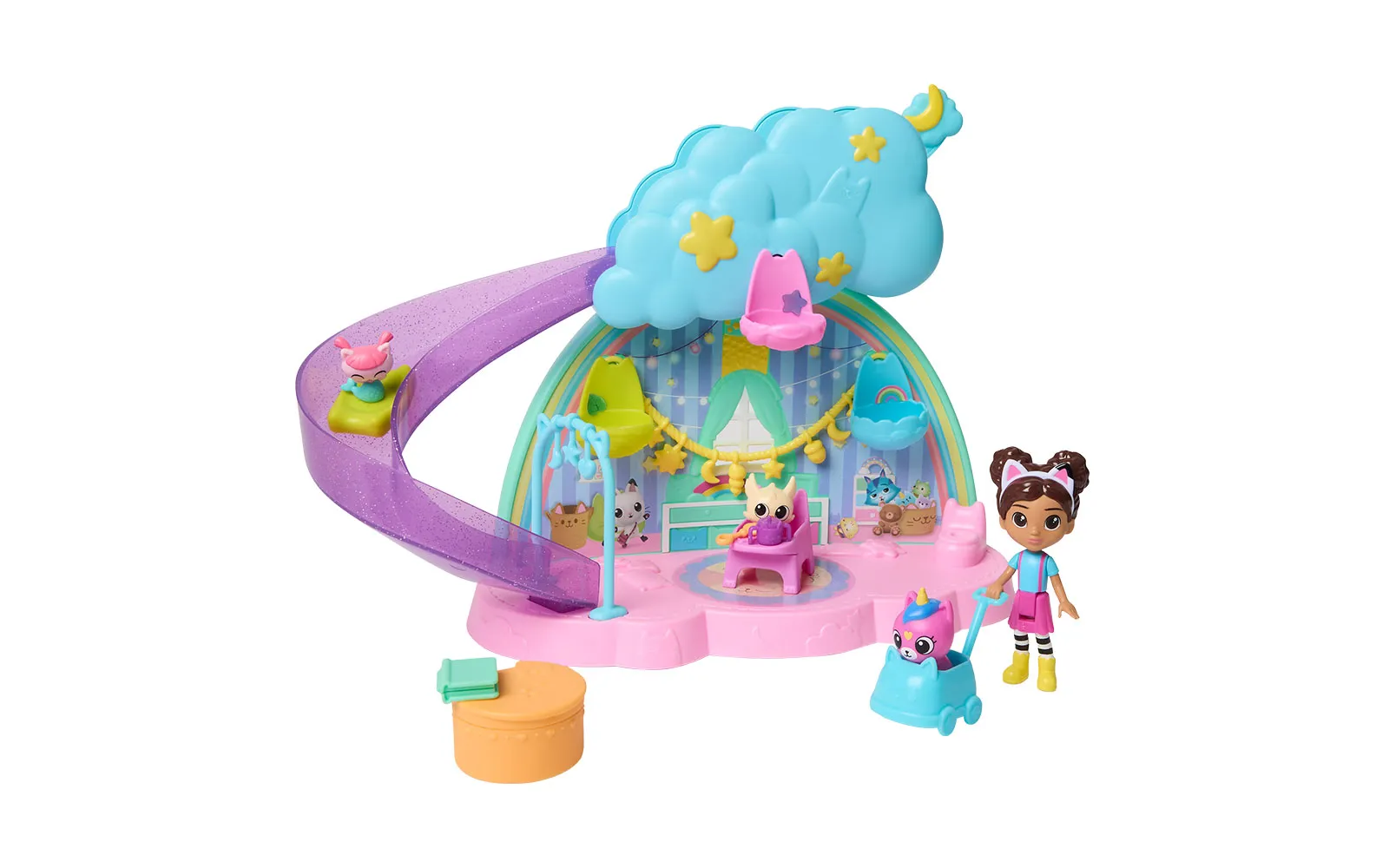 Dobrodošli u čarobni svijet Gabby’s Dollhouse! Otkrijte čarobni svijet igre s sobom za njegu mačaka! Puštajte svoje mačke niz sjajni tobogan, hranite ih na visokim stolicama i uspavajte u njihovim kolijevkama. Iznenađenja! U setu vas čekaju brojni prekrasni dodaci, uključujući kolica i grickalice za bebe! Ne zaboravite raspakovati paket iznenađenja, gdje vas očekuje još jedna posebna igračka za vaše mačke! Kompatibilno s Gabbyinom kućicom za mačke. Ovaj set je idealan za zabavnu i kreativnu igru uloga. Koristite ga s drugim Gabbyinim igralištima ili ga dodajte u Gabbyinu kućicu. Set uključuje: 1x soba za njegu mačaka, 1x Gabby figura, 9x Dodaci, 1x Paket iznenađenja.