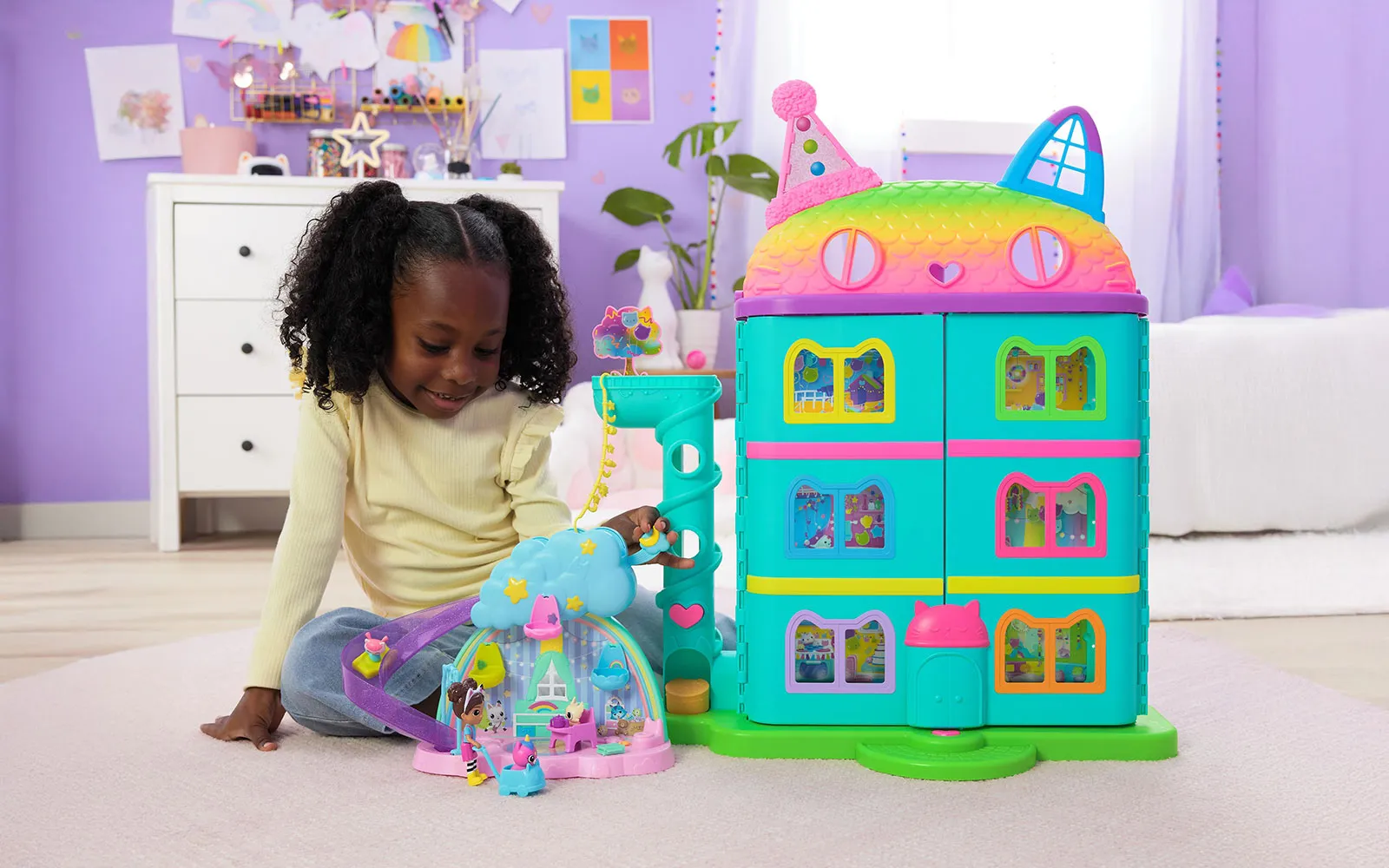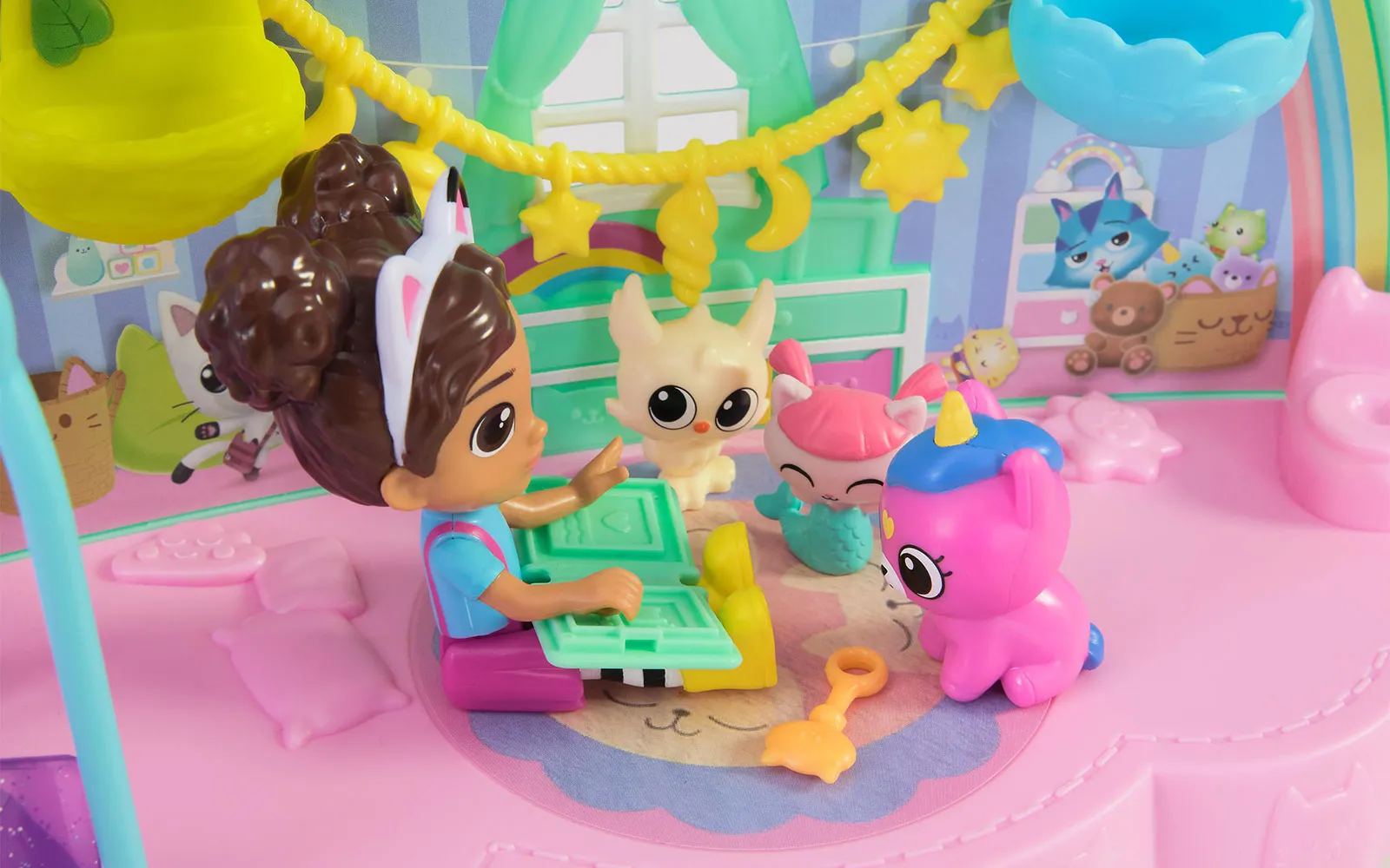 Dobrodošli u čarobni svijet Gabby's Dollhouse! Otkrijte čarobni svijet igre s sobom za njegu mačaka! Set uključuje: 1x Soba za njegu mačaka, 1x Gabby figura, 9x Dodaci, 1x Paket iznenađenja.