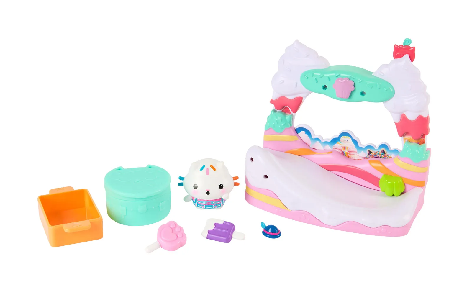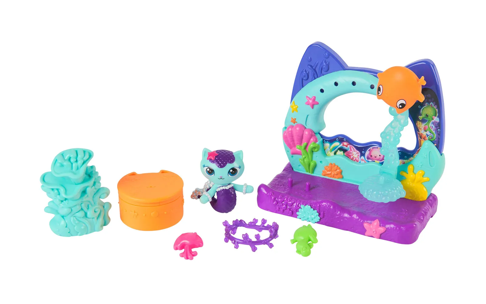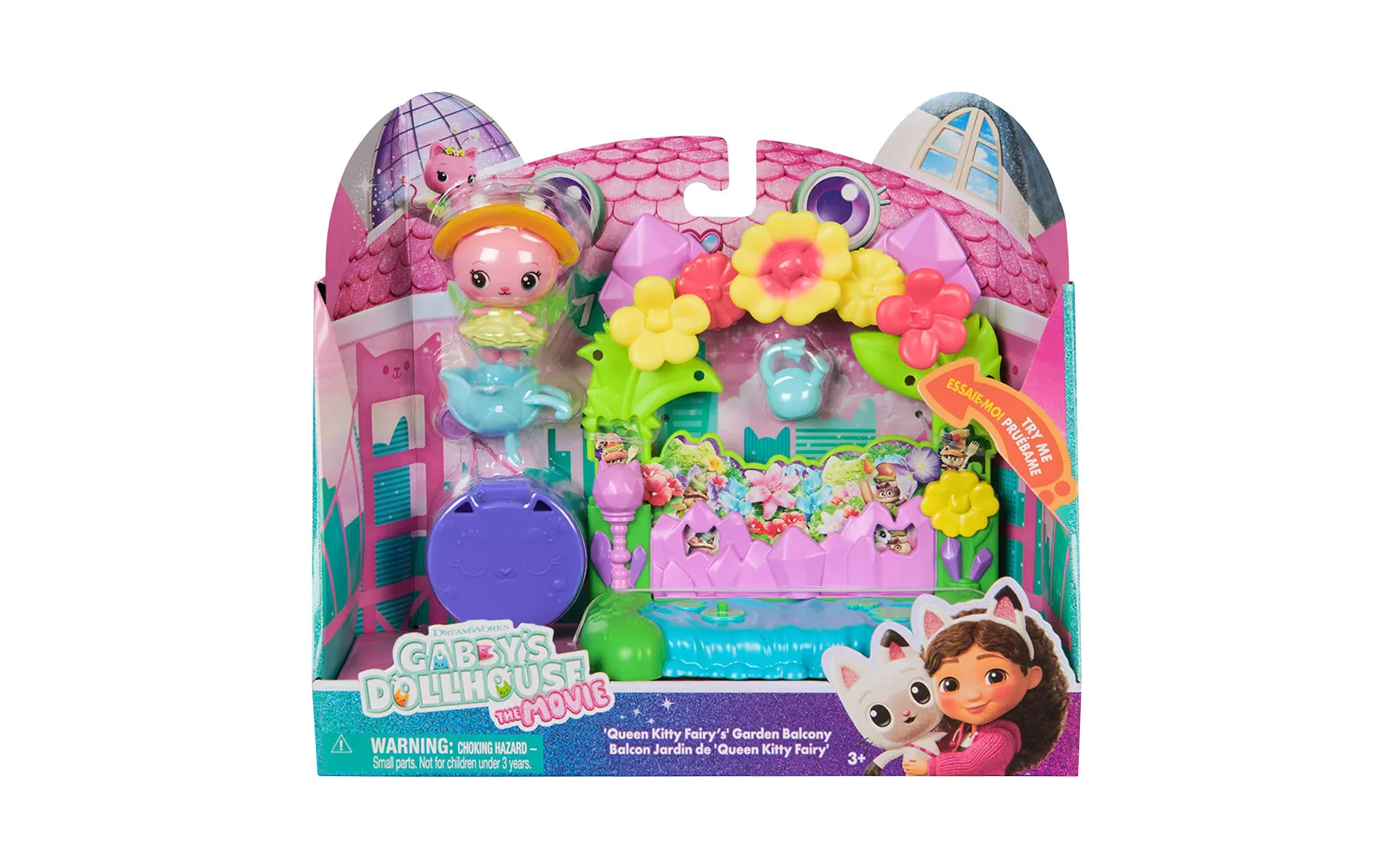 Balkon set, Gabby's dollhouse. S balkonskim setom upoznajte nove likove iz filma Gabby's dollhouse, dok istovremeno balkoni imaju različite pokretne elemente. Možete birati između Aquarium world, Crystal Garden World ili Confectionary World. S balkonima možete obnoviti svoju kućicu Gabby's dollhouse.