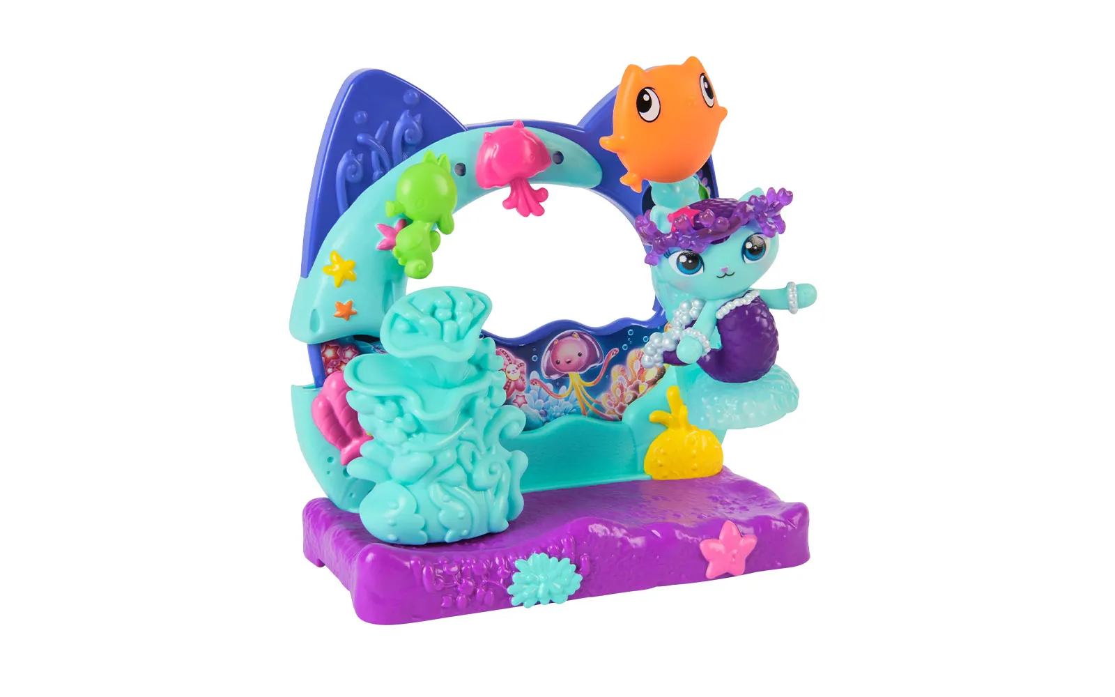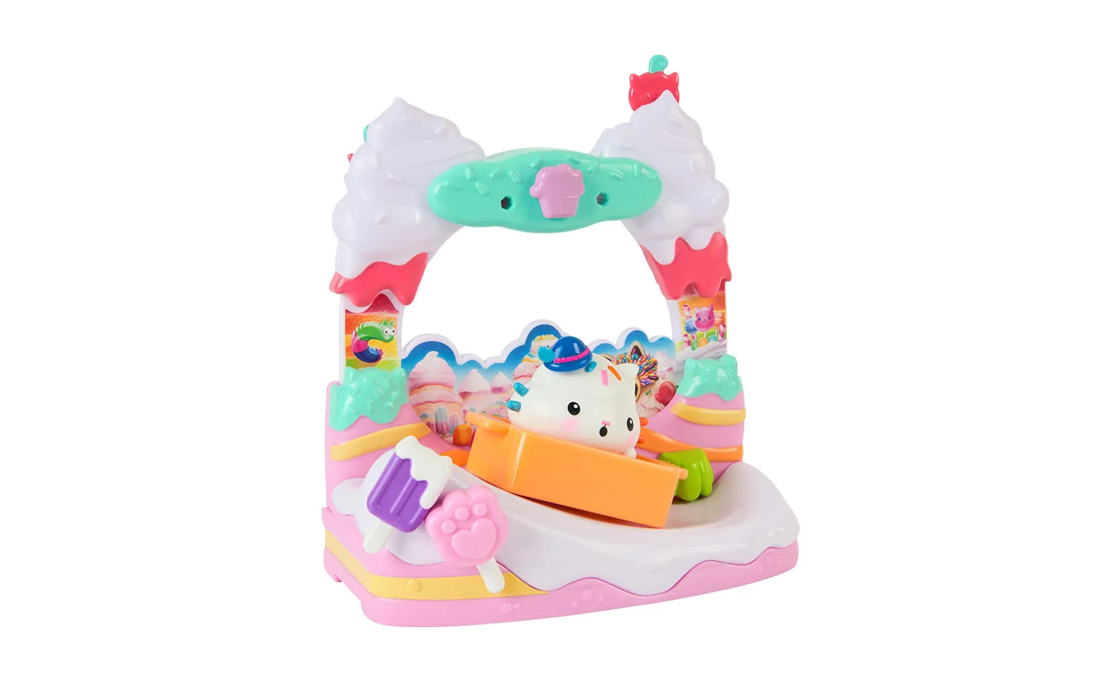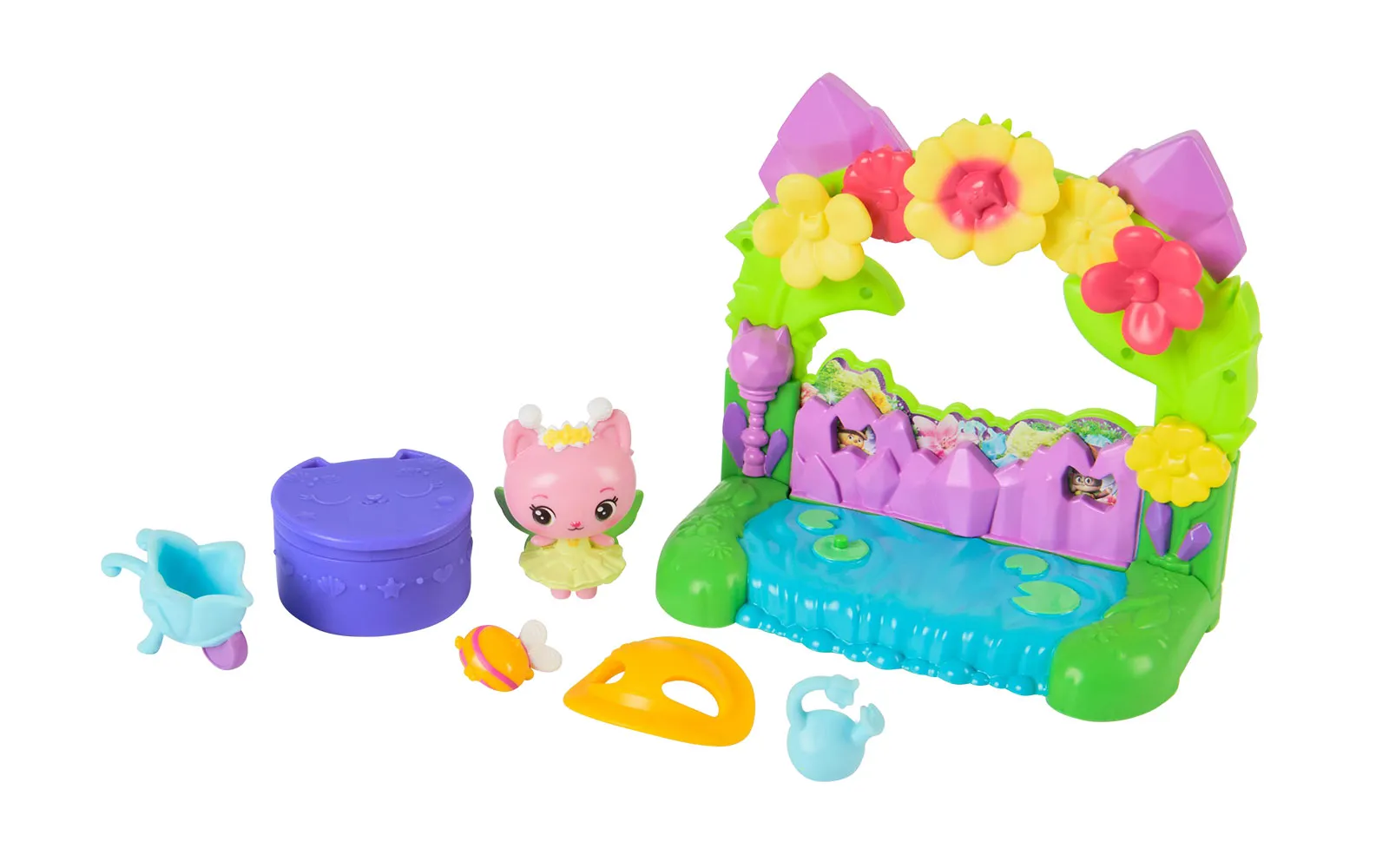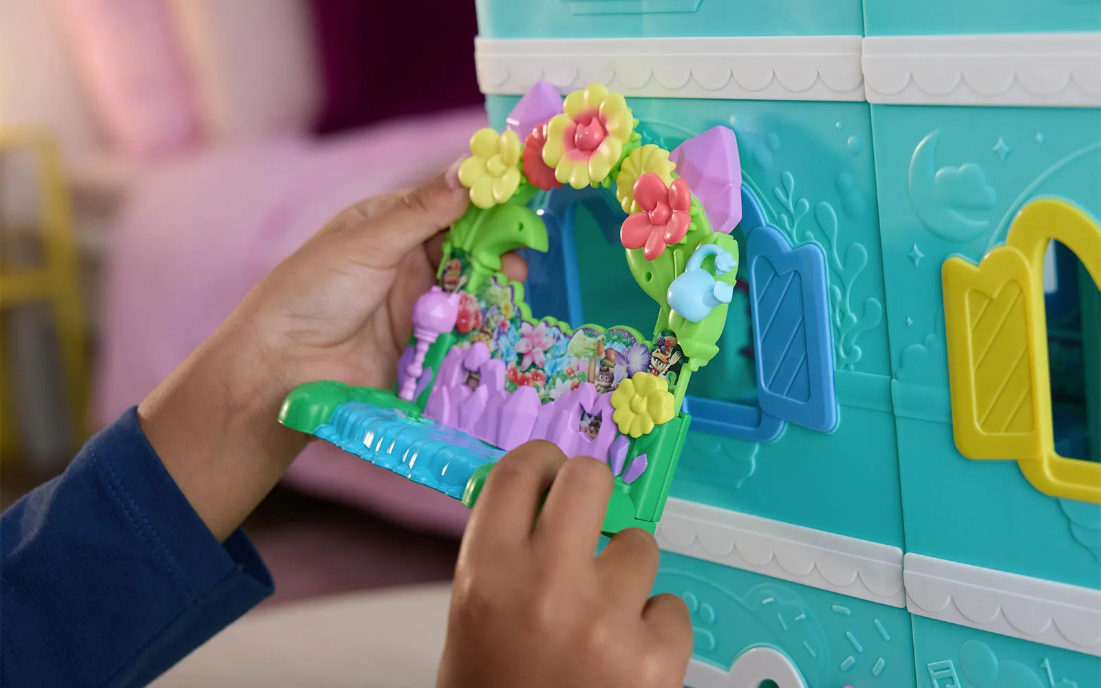 Balkon set, Gabby's dollhouse. S balkonskim setom upoznajte nove likove iz filma Gabby's dollhouse, dok istovremeno balkoni imaju različite pokretne elemente. Možete birati između Aquarium world, Crystal Garden World ili Confectionary World. S balkonima možete obnoviti svoju kućicu Gabby's dollhouse.