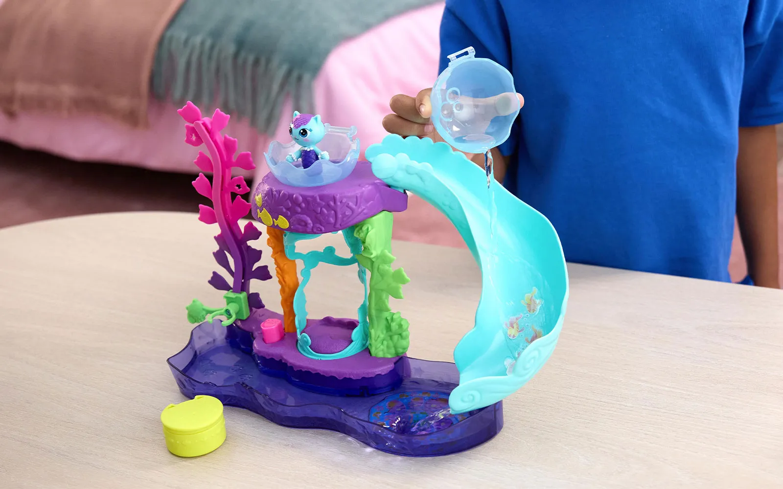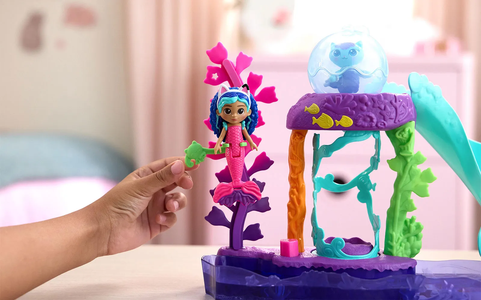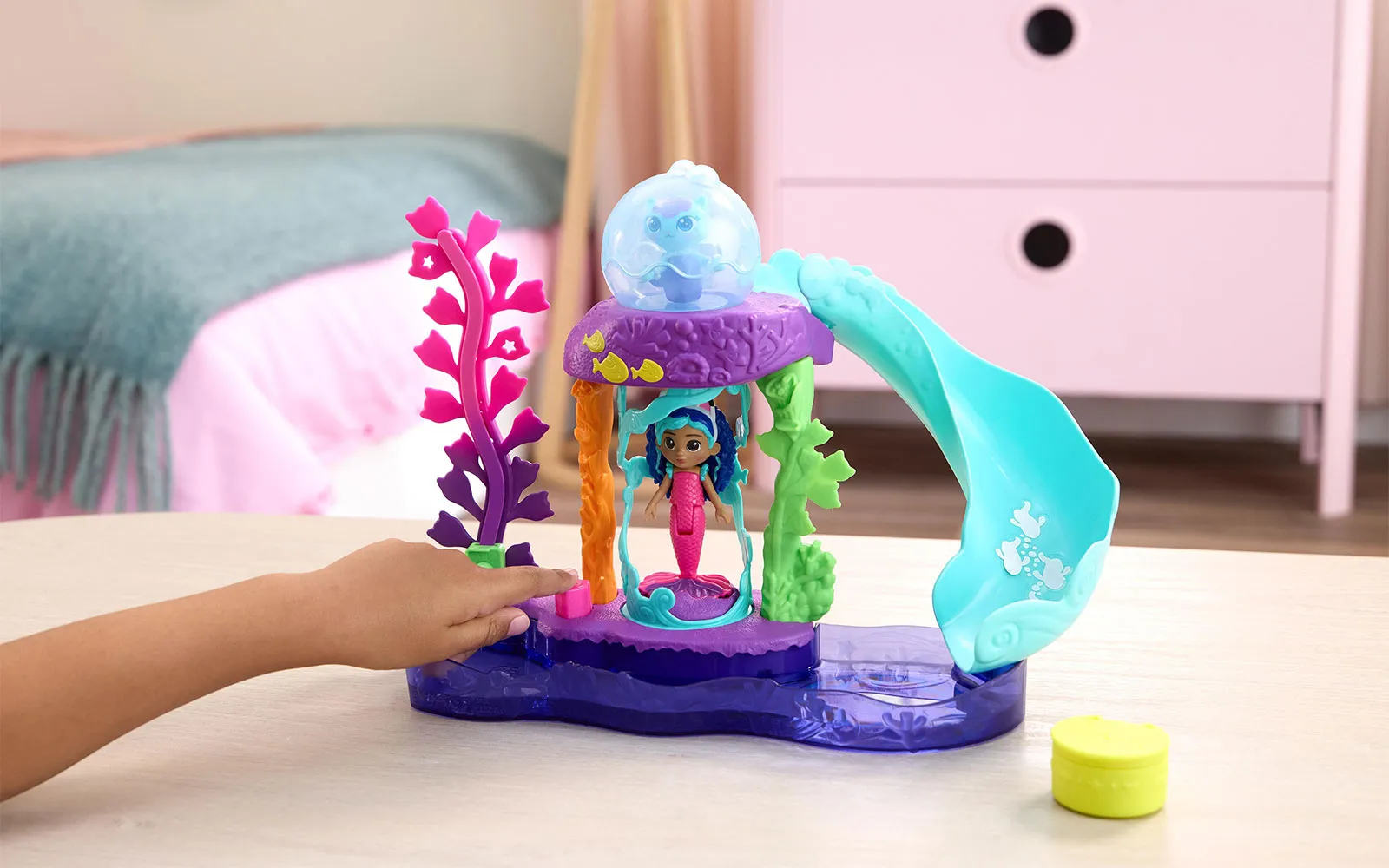 Akvarij set, Gabby's dollhouse. Set sadrži različite figurice, tobogan, ribicu, vodena stabla i još mnogo toga. Spustite svoju figuricu niz tobogan i zabavite se!