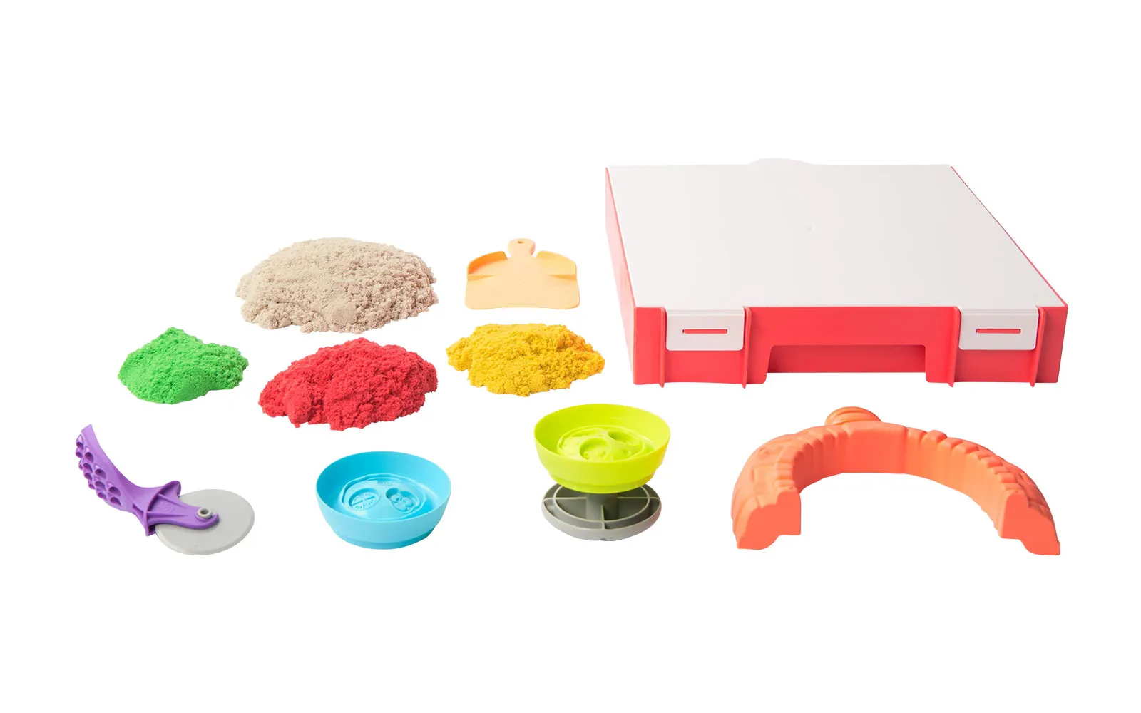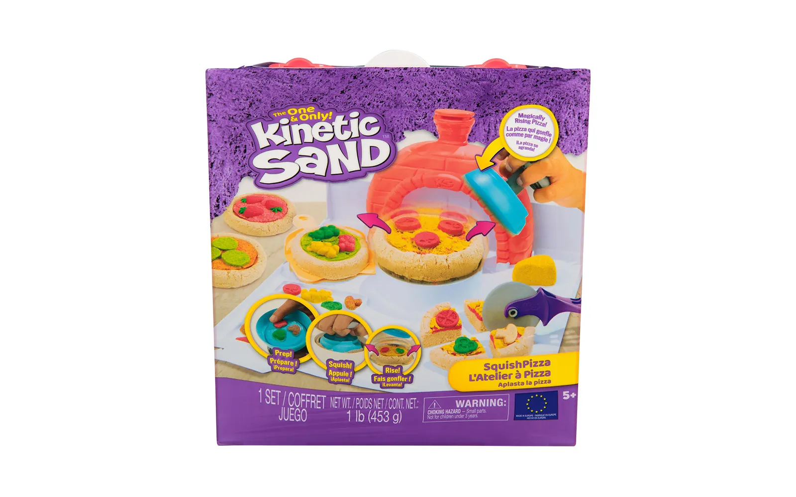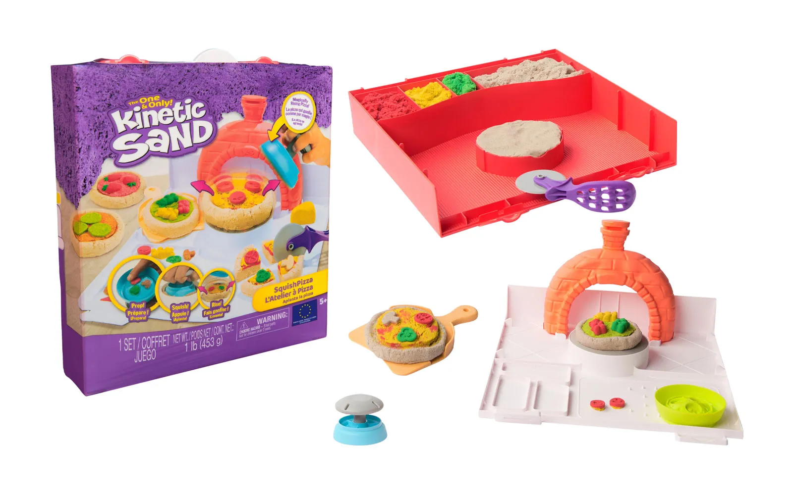 Kinetički pijesak, set, Kinetic Sand, Spin Master. Stvorite nevjerojatne skulpture s različitim priborom iz seta: 453 g kinetičkog pijeska u crvenoj, žutoj, zelenoj i smeđoj boji, 6 multifunkcijskih dodataka, plastična kutija za pizzu kao igrališni kutak i za skladištenje, 1 upute. Djeca mogu tako oblikovati domaću pizzu od kinetičkog pijeska s povrćem, salamom, gumiranim medvjedićima, keksima i svačim drugim. Pijesak kinetičkog pijeska proizveden je u Švedskoj.