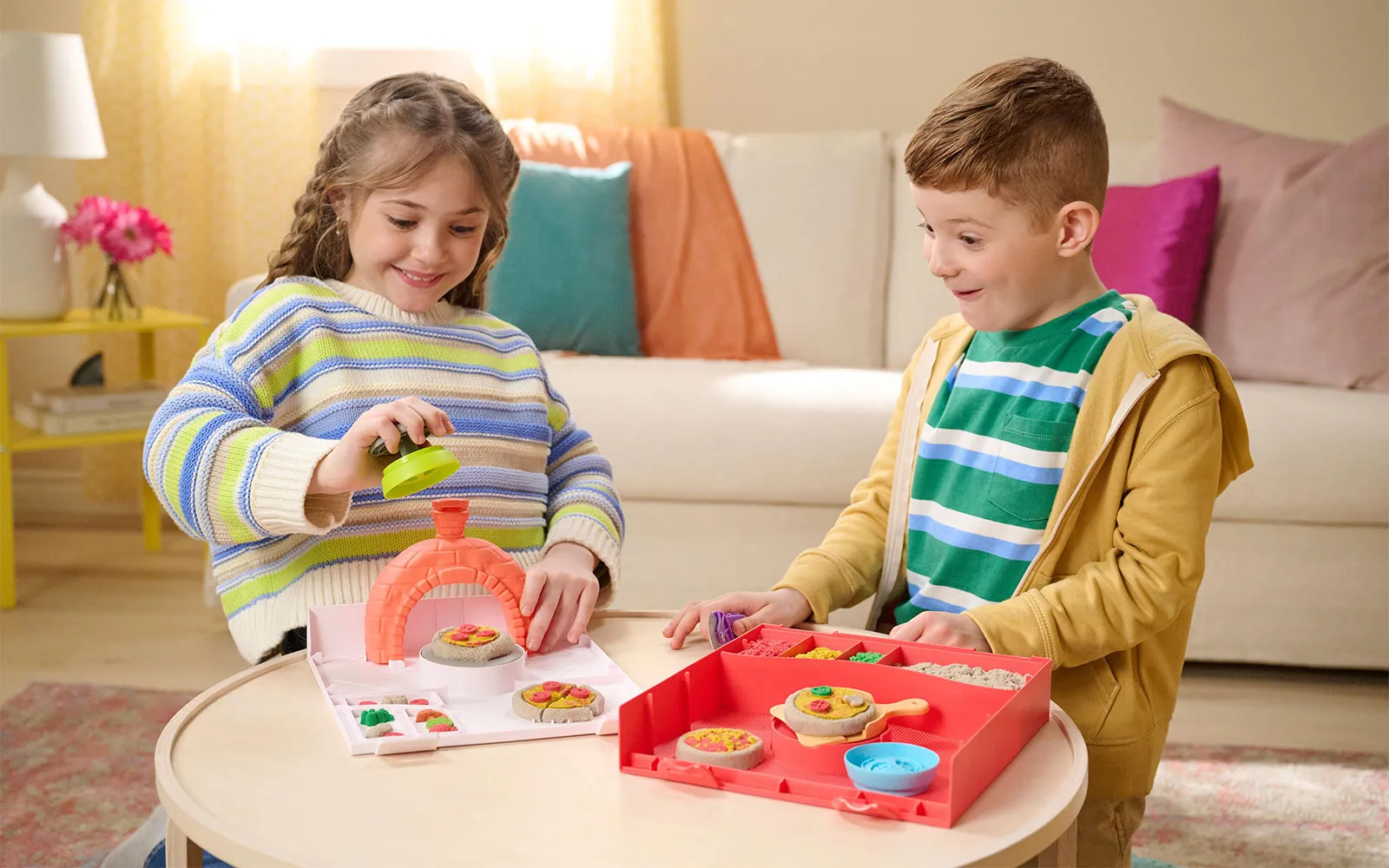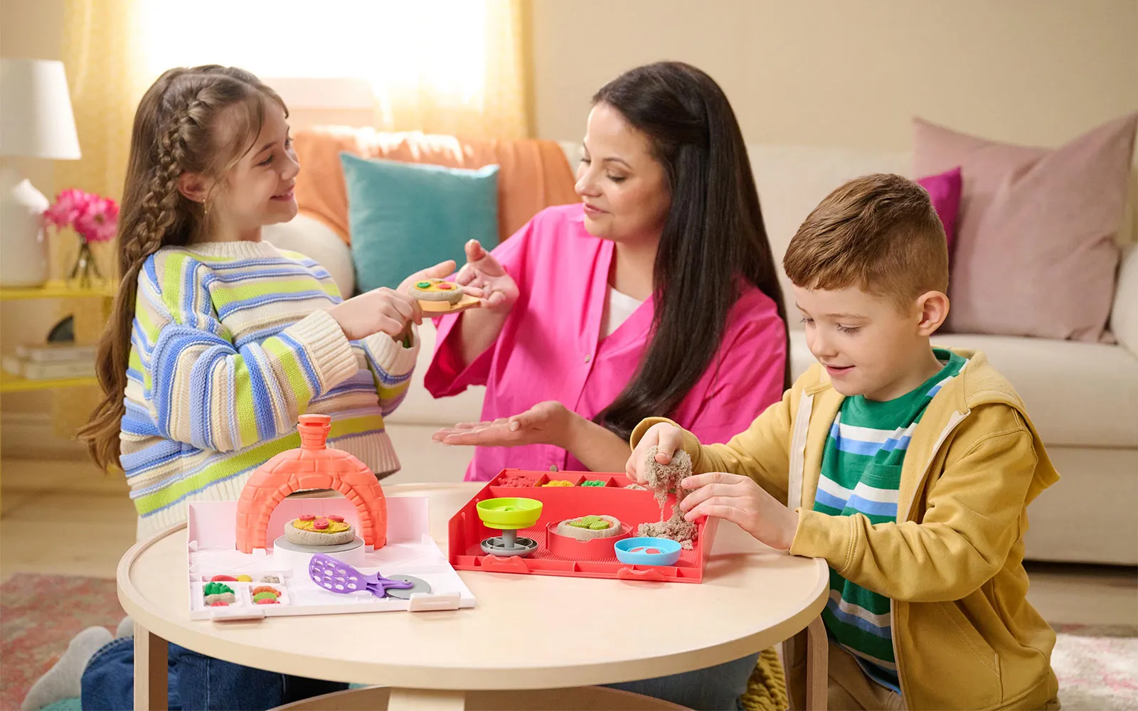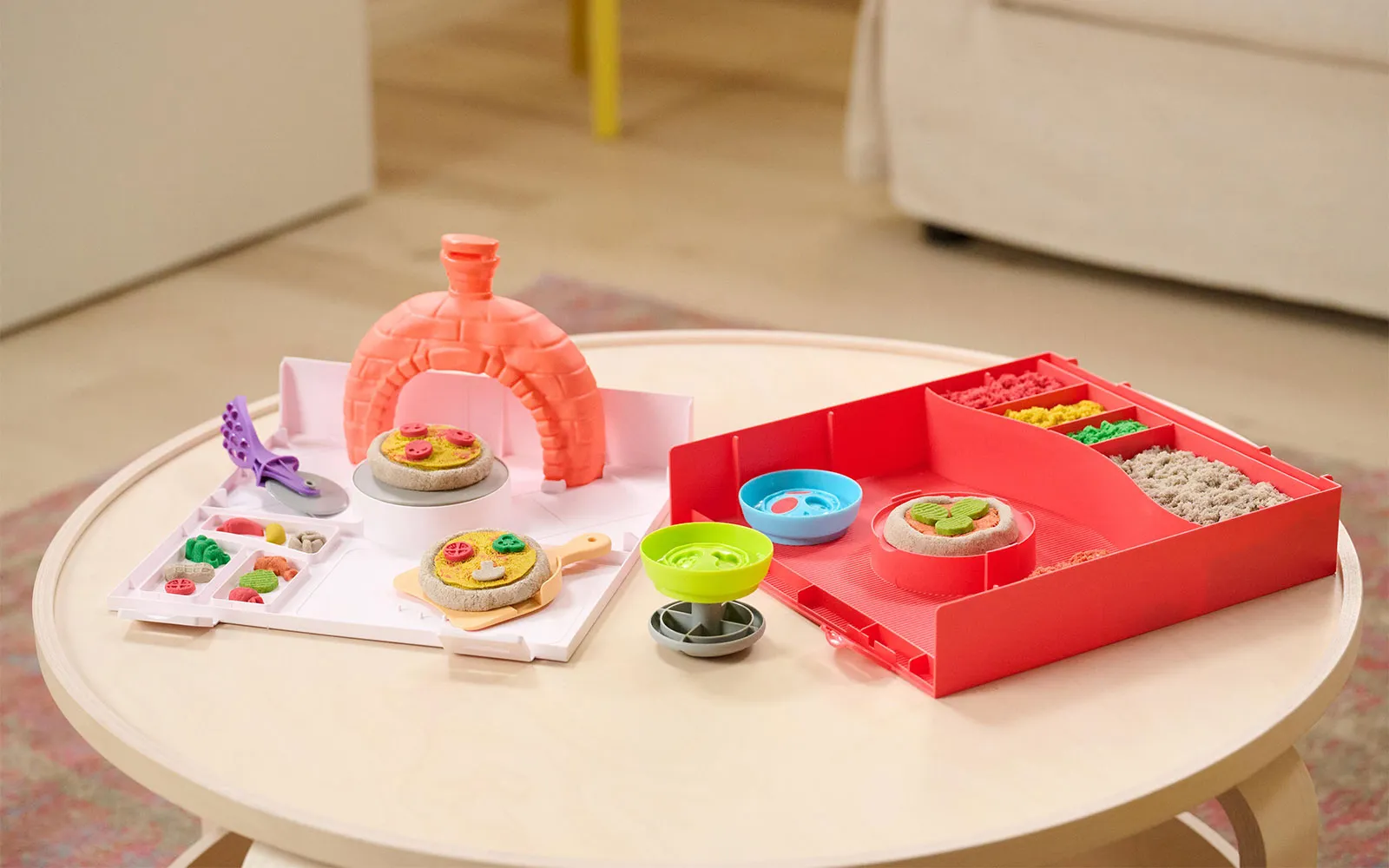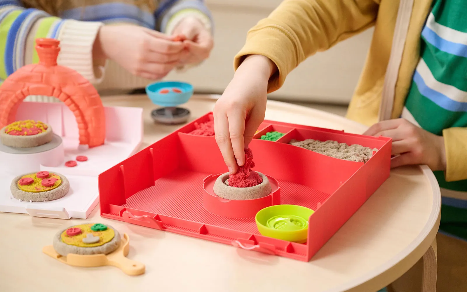 Kinetički pijesak, set, Kinetic Sand, Spin Master. Stvorite nevjerojatne skulpture s različitim priborom iz seta: 453 g kinetičkog pijeska u crvenoj, žutoj, zelenoj i smeđoj boji, 6 multifunkcijskih dodataka, plastična kutija za pizzu kao igrališni kutak i za skladištenje, 1 upute. Djeca mogu tako oblikovati domaću pizzu od kinetičkog pijeska s povrćem, salamom, gumiranim medvjedićima, keksima i svačim drugim. Pijesak kinetičkog pijeska proizveden je u Švedskoj.