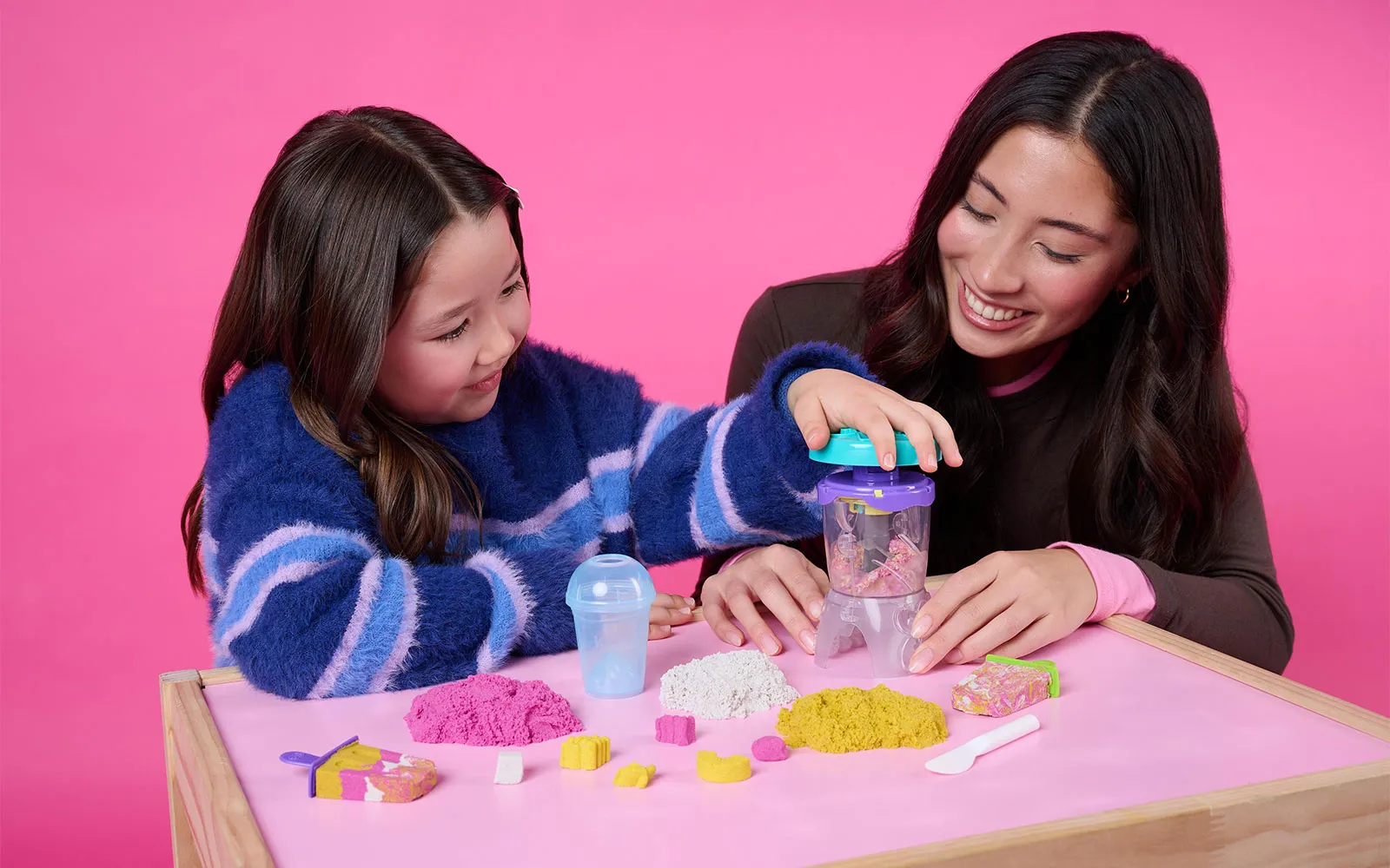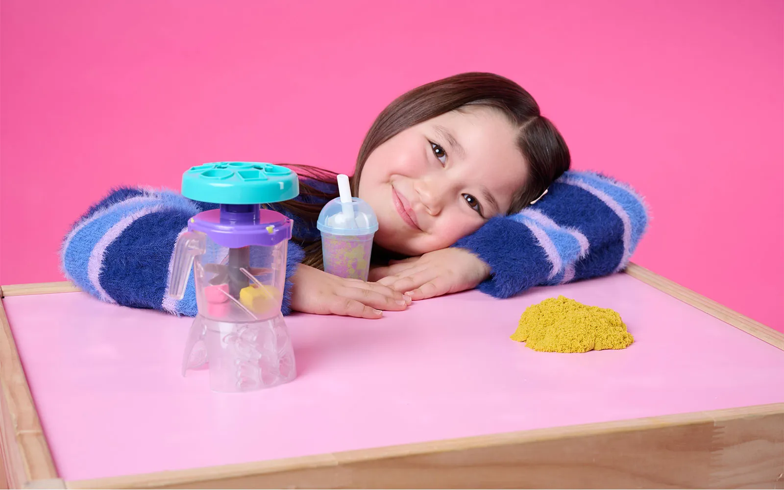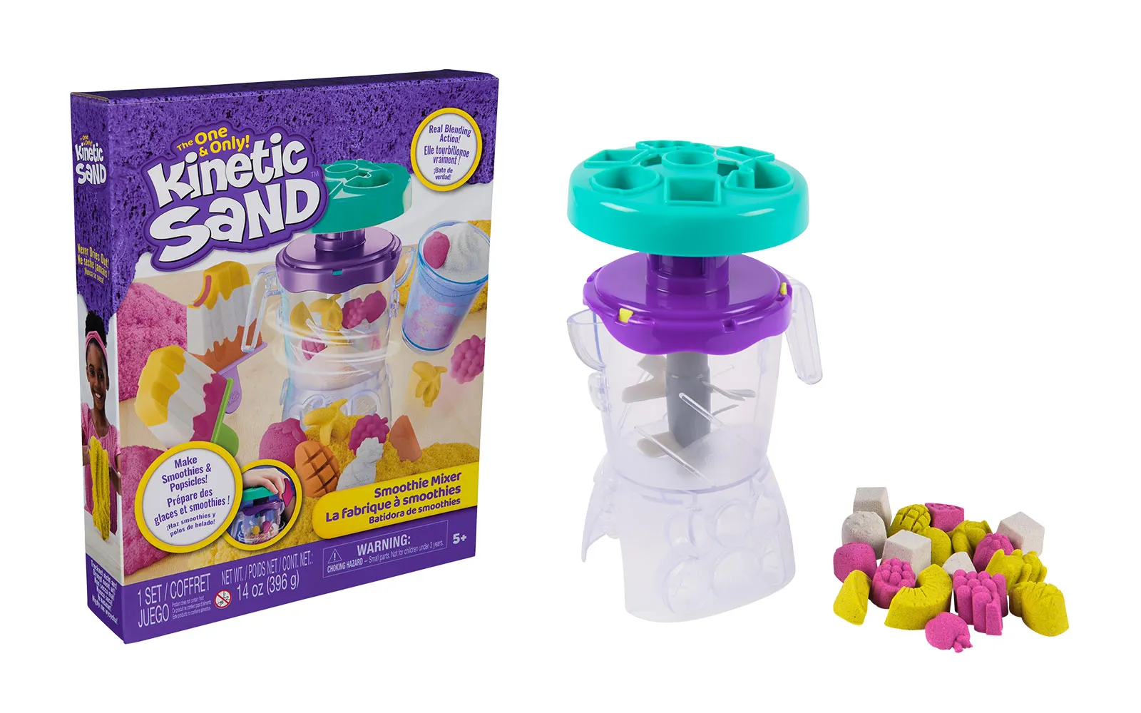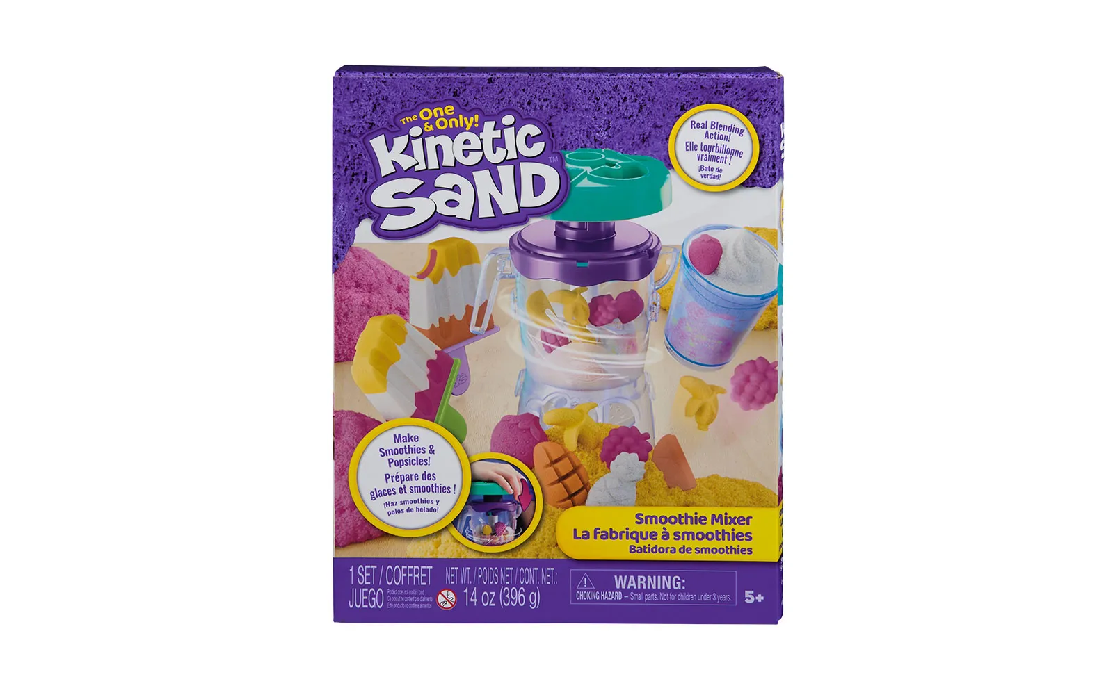 S kinetičkim pijeskom Smoothie Mixer možete pripremiti prave voćne umjetnine! S ovim setom, djeca se mogu igrati, oblikovati, slagati, miješati, rezati i gnječiti svoje smoothieje i sladolede na štapiću, potičući kreativnost i maštu. Djeca će uživati u igri oblikujući voće i dodatke na poklopac, spuštajući sastojke u čašu i pritišćući za miješanje, baš kao u pravom smoothie mikseru. S igračkama od pijeska (396 g) možete sipati smoothie kreacije u šalicu za posluživanje, ili pijesak nanijeti u kalup za sladoled na štapiću za predivnu umjetninu. Kinetički pijesak pomaže u razvoju finih motoričkih i senzorskih vještina i pogodan je za solo ili grupnu igru, potičeći socijalnu interakciju. Set sadrži: 396 g kinetičkog pijeska, 1 čašu miksera, 1 poklopac miksera, 1 šalicu za smoothie, 1 poklopac šalice, 1 slamku, 1 kalup i 2 štapića za sladoled.